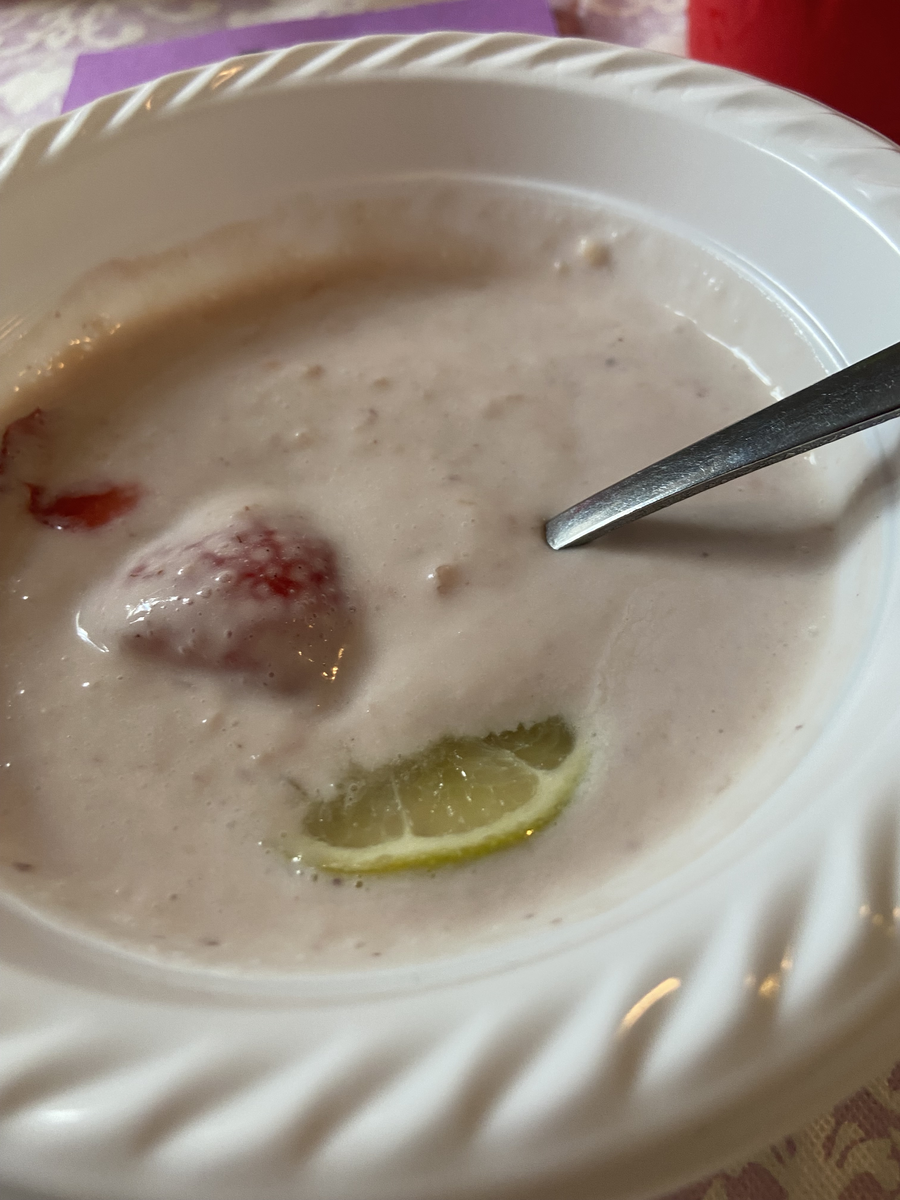 Our starter was a chilled melon and berry soup…..now, I do love a good chilled soup and was excited to see it set in front of me, but I’ll tell you it just may have been one of the best I’ve ever had….I would have been very happy if all they did was plop a huge bowl of it in front of me and served me nothing else! It was absolutely amazing — a yogurt based soup with cantaloupe and likely other melons pureed and a variety of berries on top……YUM!!! I dug in and forgot to take a photo until all the blueberries were gone, but you get the idea from the photo below – only complaint – there was not enough of it – I definitely wanted MORE!!!