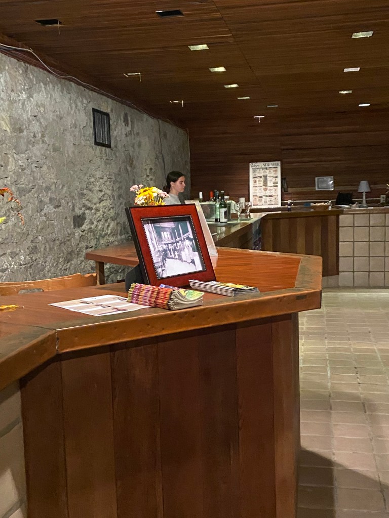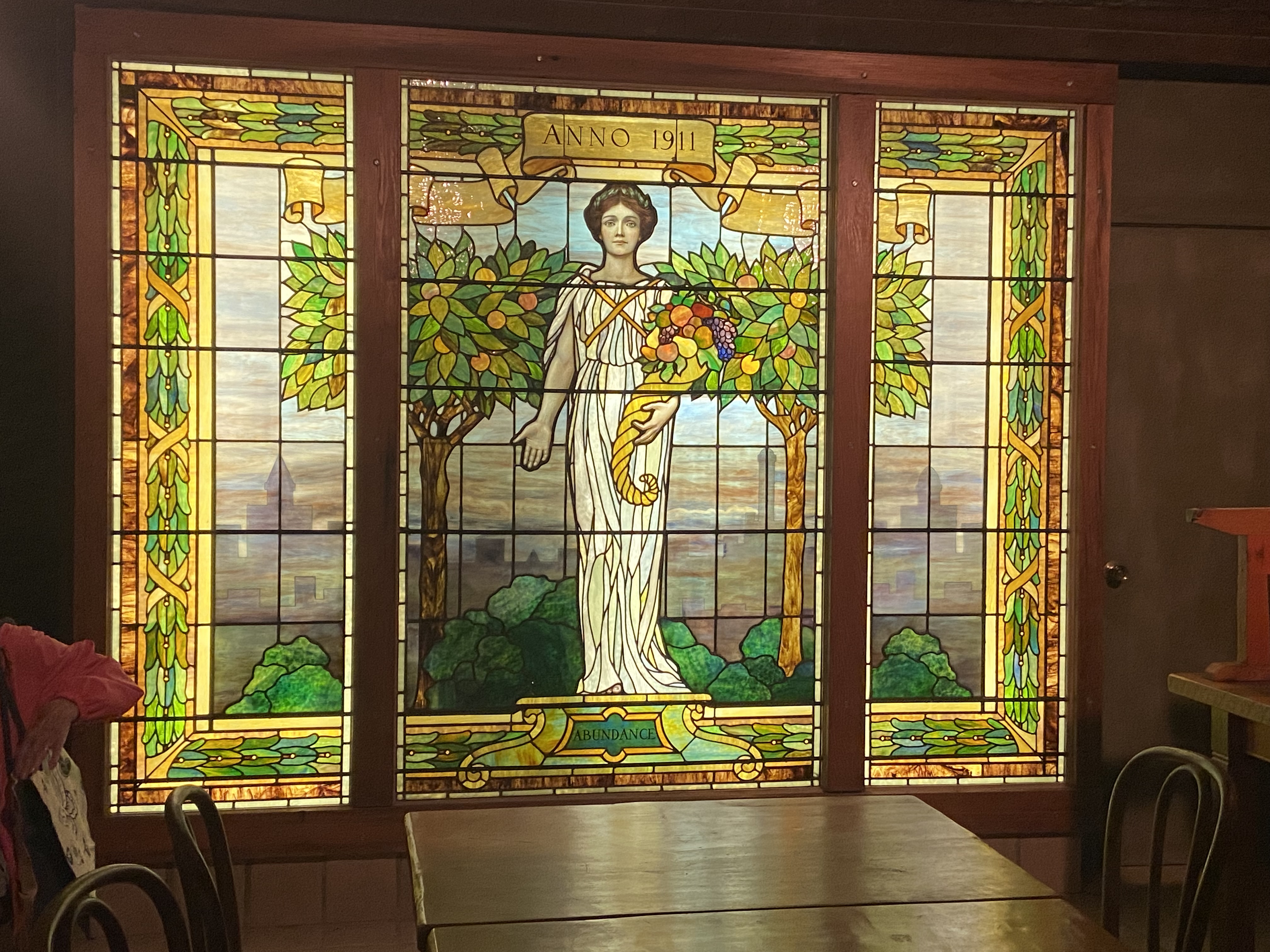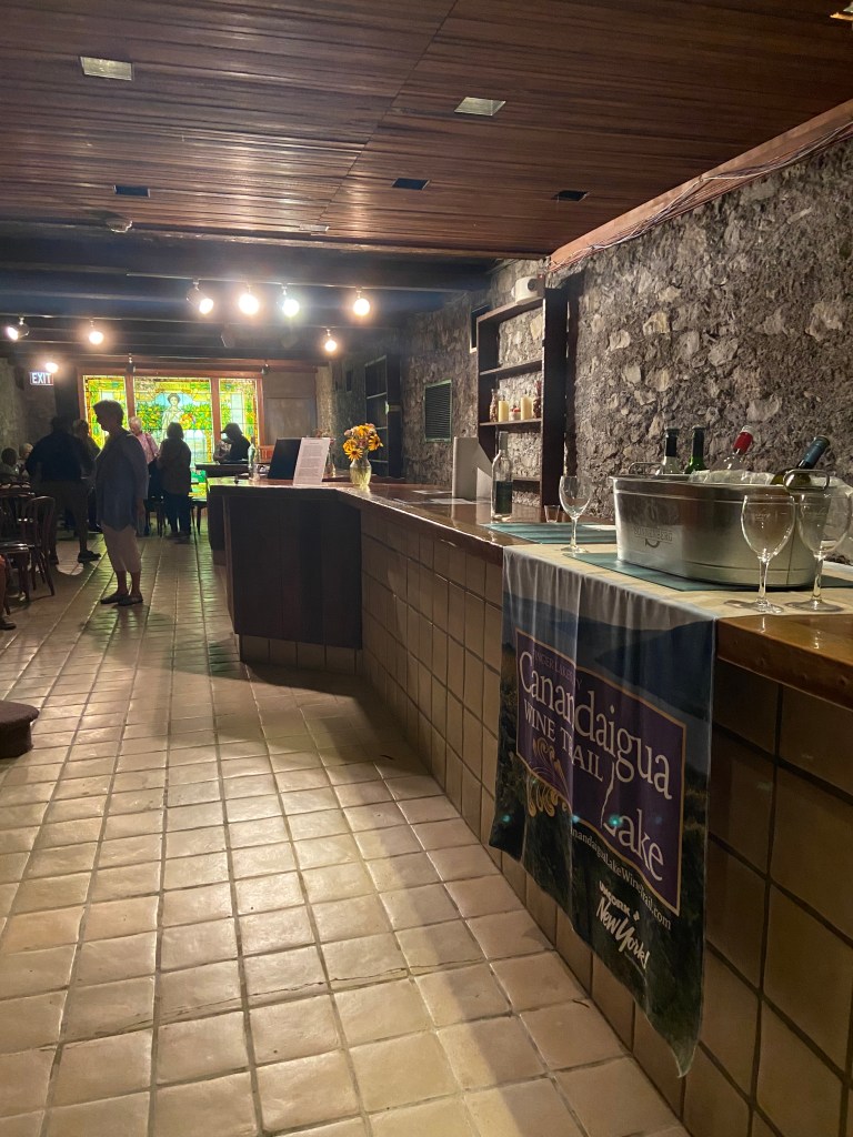 After lunch, we gathered in the Finger Lakes Wine Center right there on the property for a wine tasting. The wine center is located in what used to be Mary’s root cellar. It was a nice room – quaint, yet a bit musty – with a STUNNING stained glass window at the far end – it was the first thing we saw when we got to the bottom of the steps going into the tasting room.