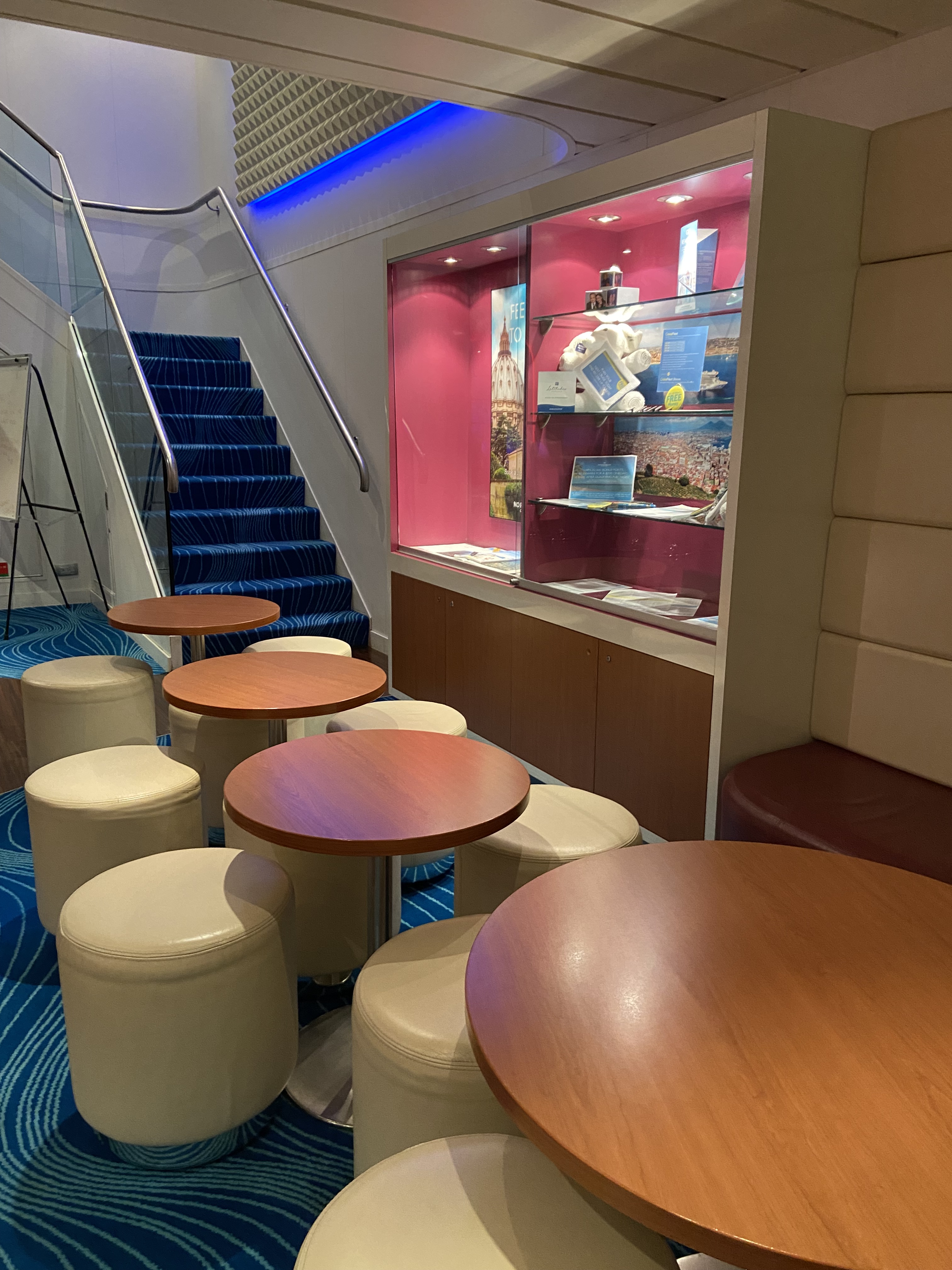 I did something a bit different for this cruise. I usually choose a balcony cabin – I like sitting on the balcony in the morning with a cup of tea, at night to watch the sunset and relax, or to read during the day on “at sea” days. I just really like having the balcony. But – it comes at a cost! I am usually a solo cruiser – my travel buddies don’t always like to do cruises and I do, so I typically go them alone. The cost of any cabin is based on double occupancy, so a solo cruiser generally has to pay roughly double what it would cost if there was a roommate to share the expenses – of course, sometimes you can find deals that bring that down, but that’s the basic idea. But…..now, many of the cruise lines are offering solo cabins – Norwegian was the first to do this, from what I understand. Norwegian calls their solo cabin “Studio Cabins”. They are smaller and only inside – no ocean view and no balconies. But, they do have some benefits – first, they are priced for single occupancy….next, they are in their own section of the ship that can only be accessed with a studio key card…..and, finally, the section has a Studio Lounge that is only available to those who have a Studio Cabin – it has ample comfortable seating to read, mingle, etc., games and chess boards, a TV, a bar, and a 24/7 coffee / tea station with snacks. So — since this cruise didn’t have any “at sea” days and all the cruising between ports was at night, I decided to give the Studio Cabin a try. I ended up liking it — oh, I still missed my balcony, but, given the right cruise and situation, I would choose the Studios again! My cabin was comfortable and all I really needed and the lounge was a nice perk.