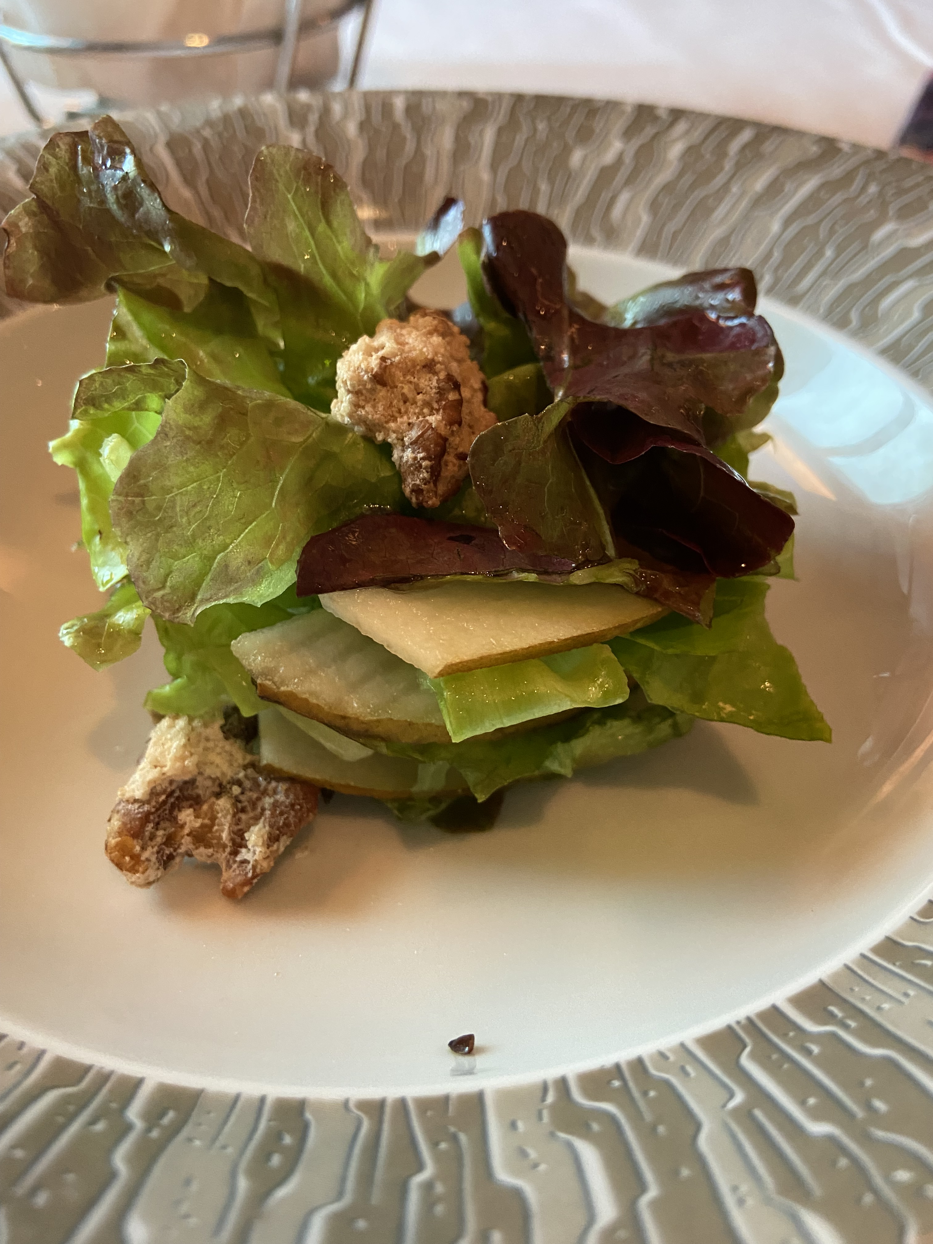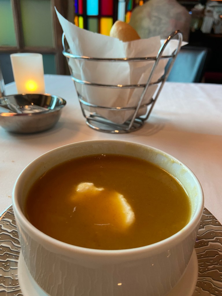 For the main dining room – the first night I had the Singapore Pork Potstickers and the Hawaiian Pork Belly with mashed yams – VERY GOOD!!! The next meal I had there started out good with coconut shrimp with orange marmalade – awesome – and ended with delicious eclairs, but the main course was pecan crusted turkey medallions with some kind of weird mess under them – not a fan! But, the last time I gave the main dining room a try was the last straw…..I got the roasted butternut squash soup that was OK, a salad with candied walnuts and sliced pears that was delicious, and the prime rib – I was really looking forward to it and it looked so good……but, I couldn’t cut it – it actually hurt my hands trying – and the one bite I did get torn away to eat I had to chew forever before I could swallow it. So, I left it and went up to the buffet and got some fruit and ice cream! hahaha