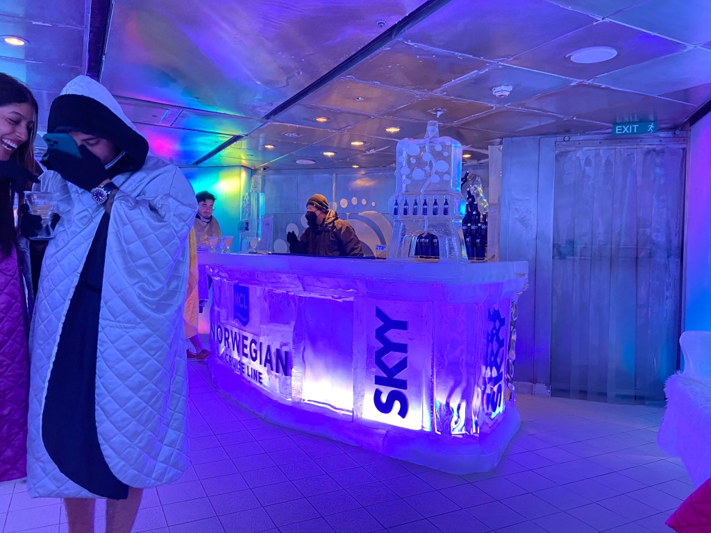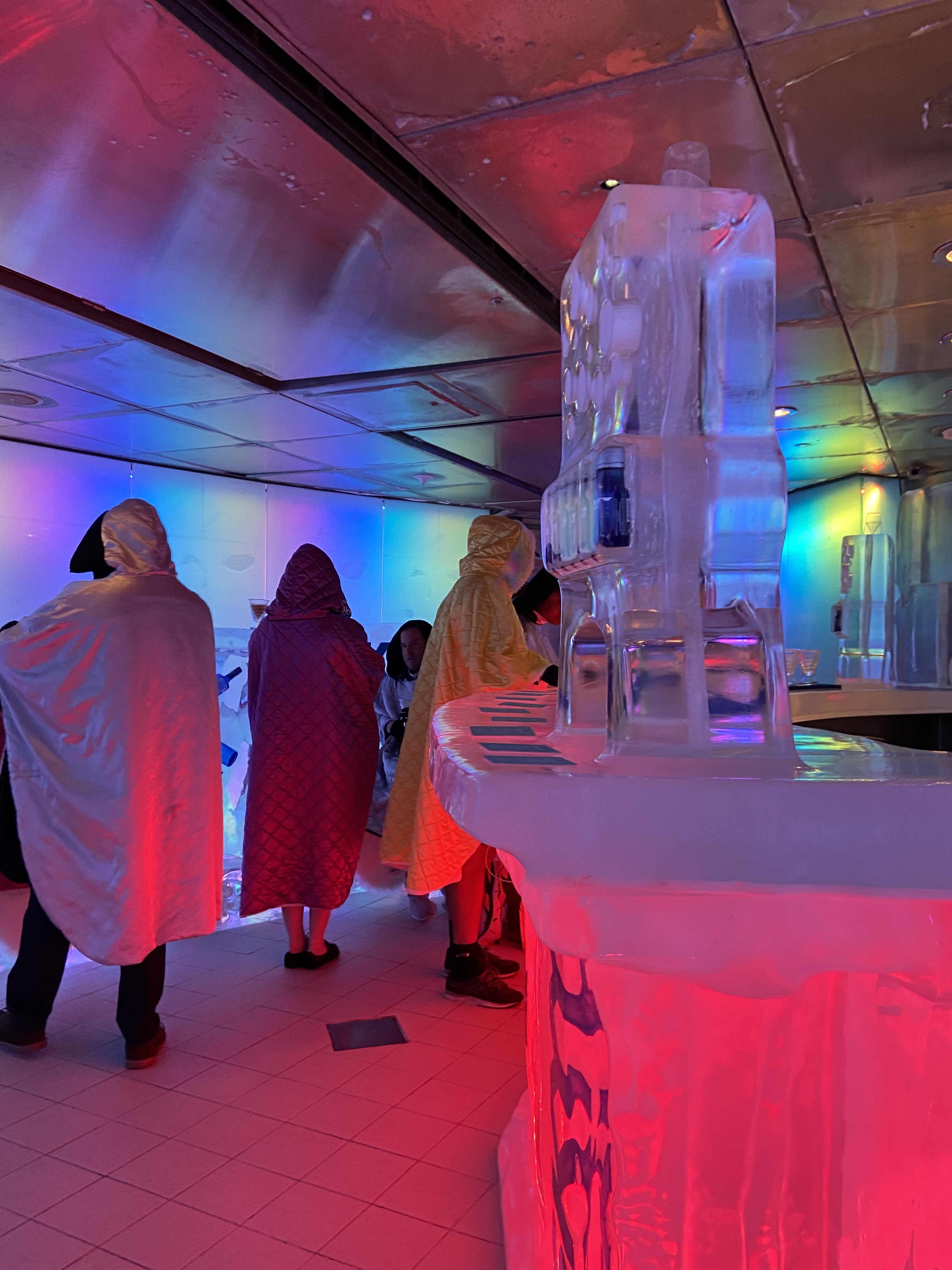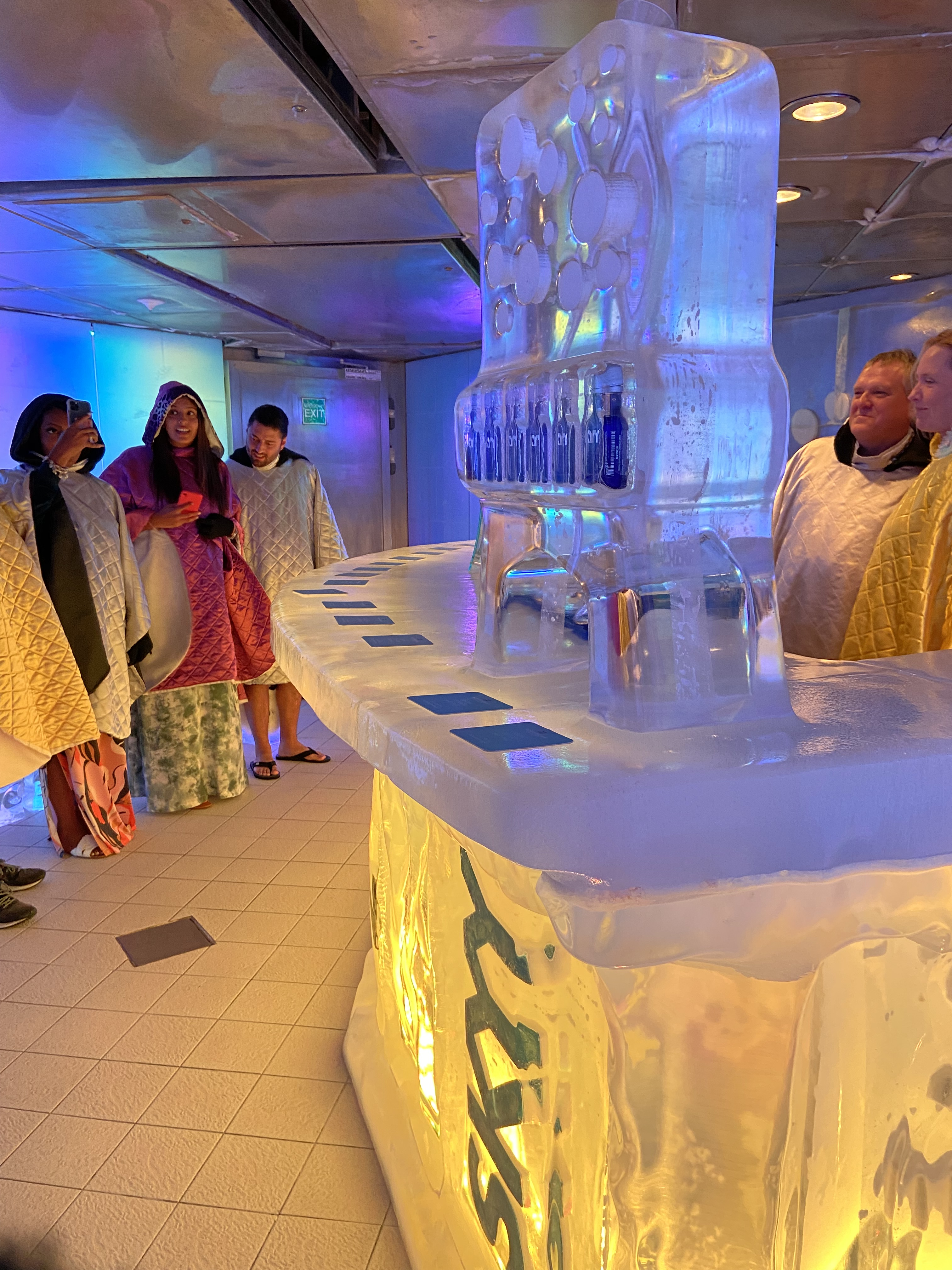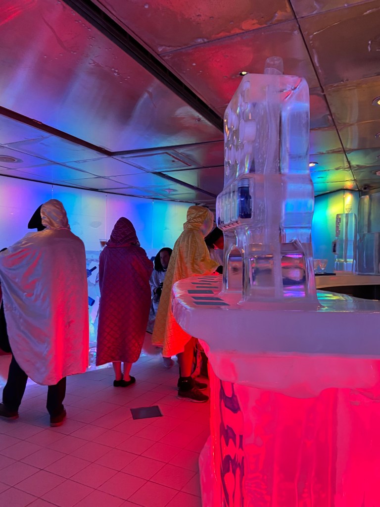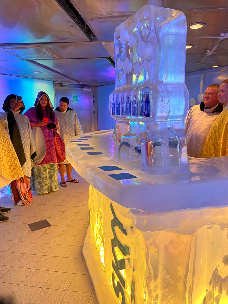 Another really cool club was the “Ice Bar”! I was curious about it and made a reservation for one evening – so glad I did! It was fun! It is a room that is kept at 17 degrees F. Everything in there is a frozen ice sculpture – the bar, the seats, the glasses, the decorations – everything! They give you a poncho and gloves and you’re allowed to stay inside for up to 15 minutes and have up to 2 drinks. I chose the non-alcoholic “Day at the Beach” – strawberry puree, pineapple juice, and lemon juice — sooooo good!!! What a fun experience!