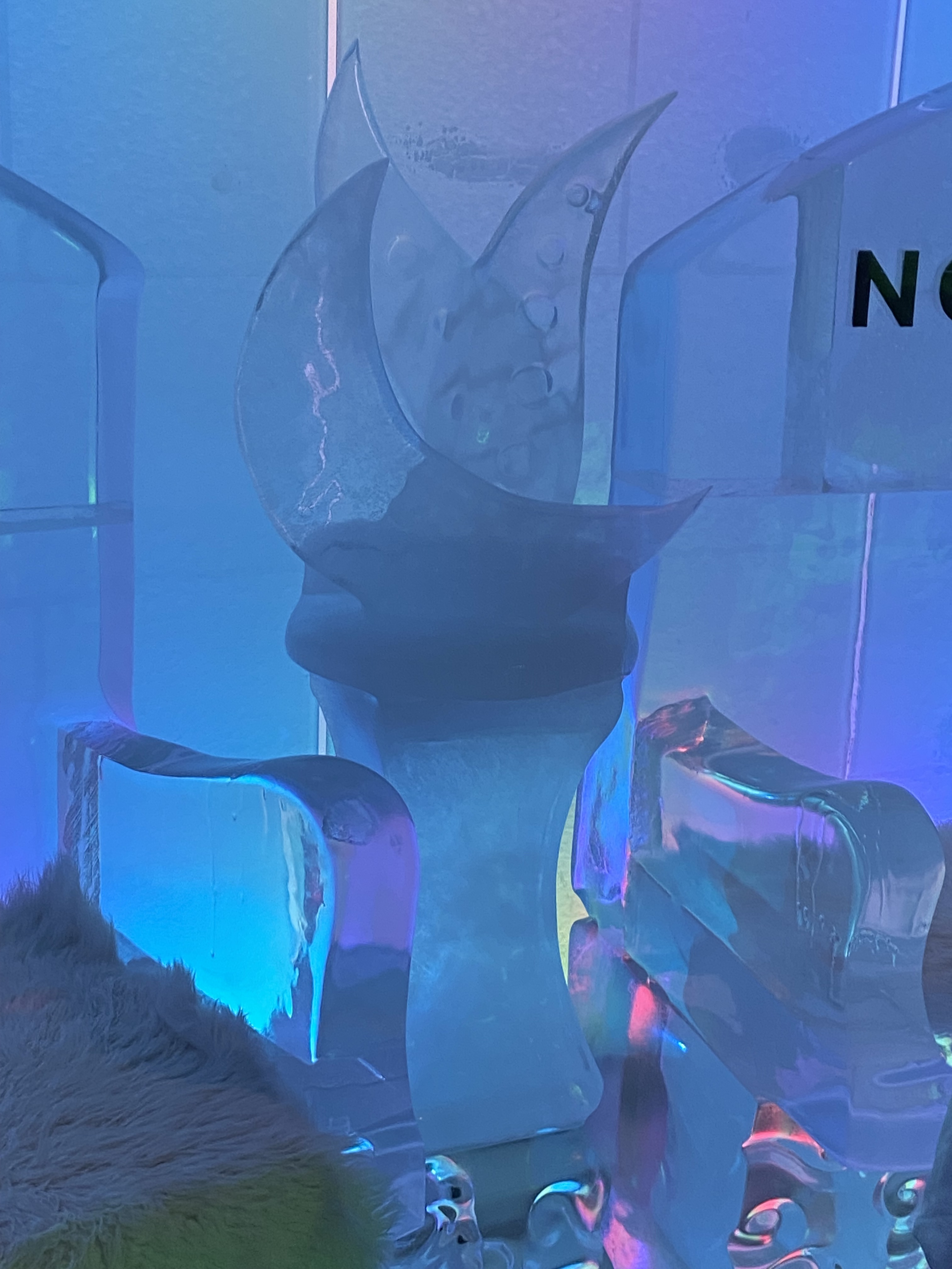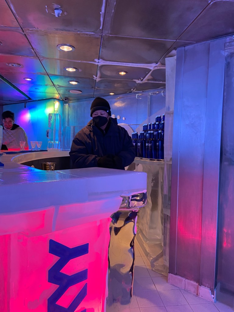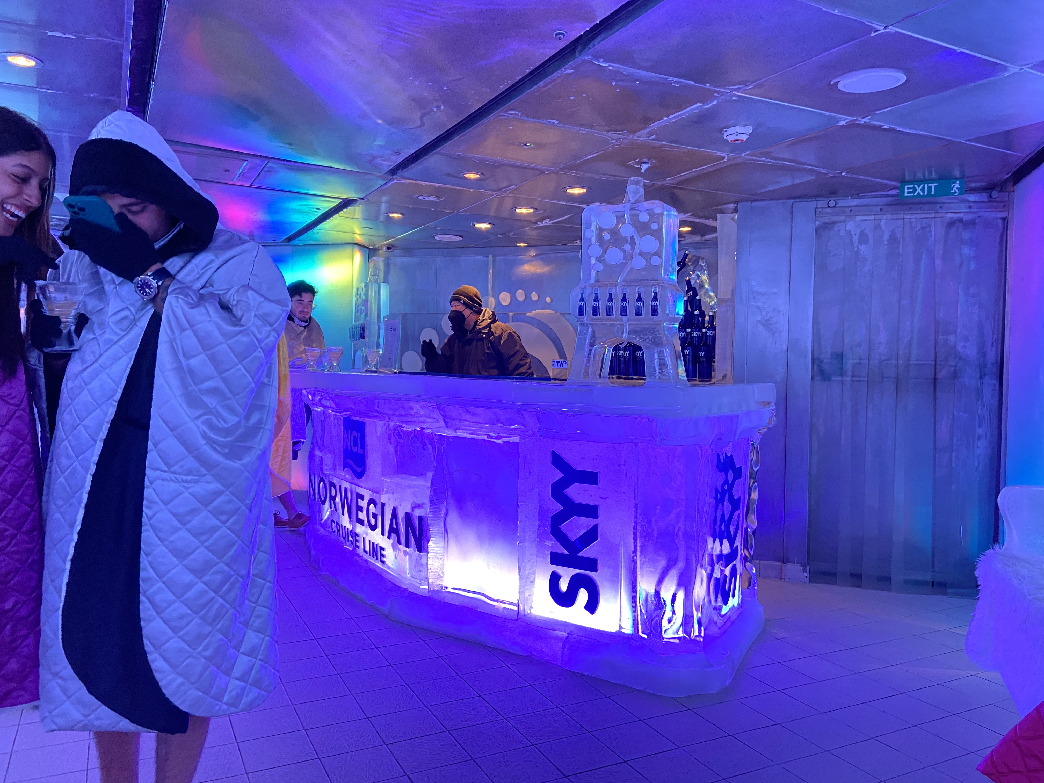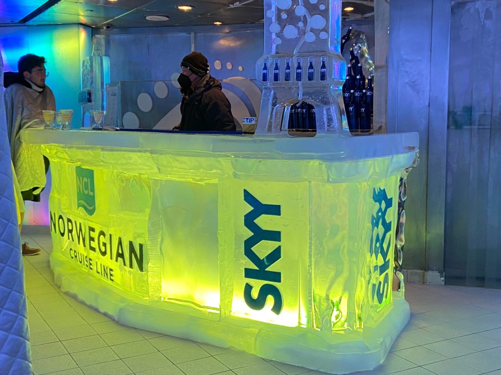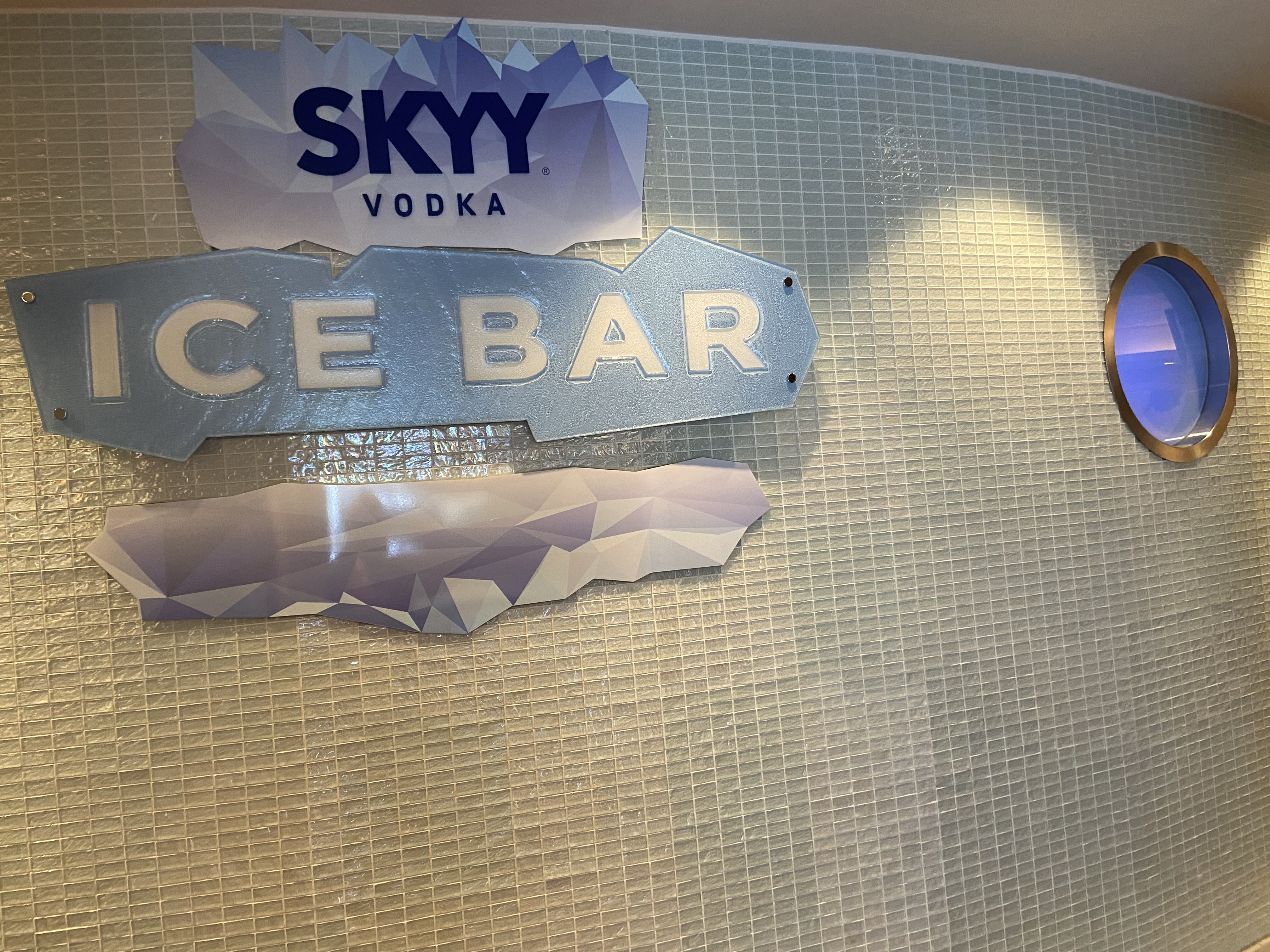 Another really cool club was the “Ice Bar”! I was curious about it and made a reservation for one evening – so glad I did! It was fun! It is a room that is kept at 17 degrees F. Everything in there is a frozen ice sculpture – the bar, the seats, the glasses, the decorations – everything! They give you a poncho and gloves and you’re allowed to stay inside for up to 15 minutes and have up to 2 drinks. I chose the non-alcoholic “Day at the Beach” – strawberry puree, pineapple juice, and lemon juice — sooooo good!!! What a fun experience!