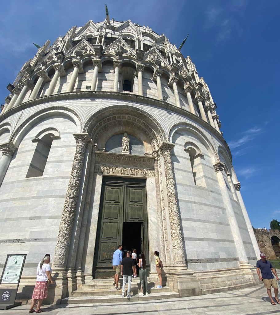 The Baptistery, a round Romanesque style building built in the mid-12th century, is dedicated to St. John the Baptist and stands opposite the west end of the Duomo (medieval cathedral). It was built away from the cathedral because in the time of Michelangelo and Galileo, you had to be baptized before you could enter the cathedral. It is the largest baptistery in Italy and stands a few centimeters taller than the cathedral’s bell tower (the leaning tower).