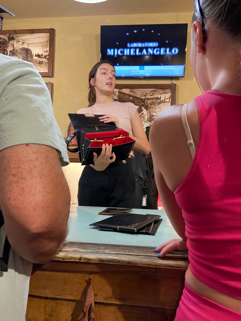 Before the guide left us to our day, she took us in the leather shop for a demonstration and talk about Italian leather. By participating in the demo/talk, we got a nice discount on any leather goods we purchased in the shop. I bought myself a beautiful pair of lamb skin leather gloves lined in cashmere — sooooo nice and they fit…well, like a glove!!! I also bought a couple gifts.