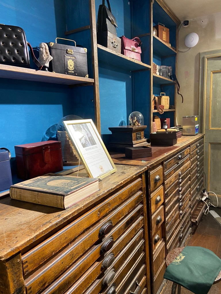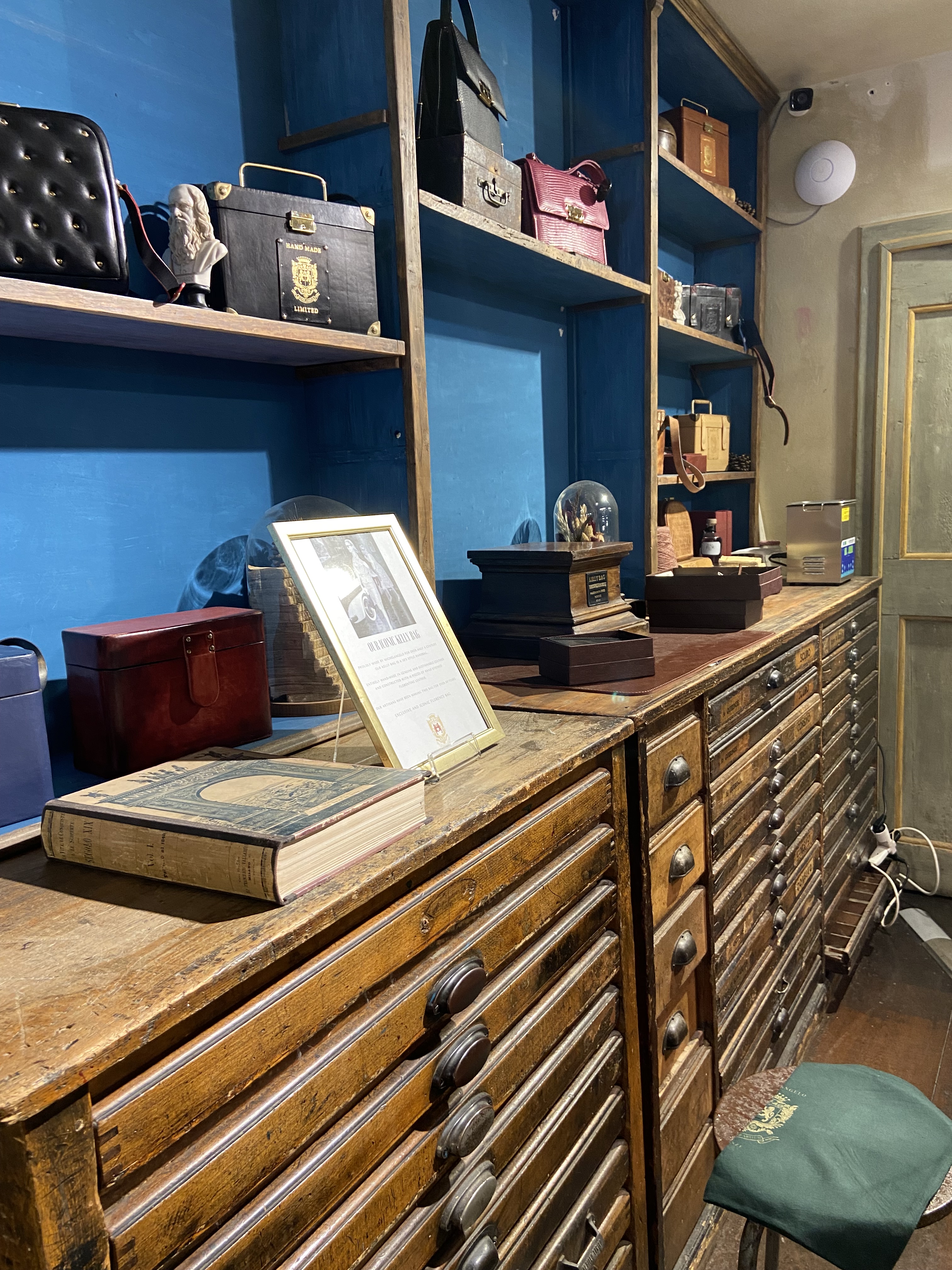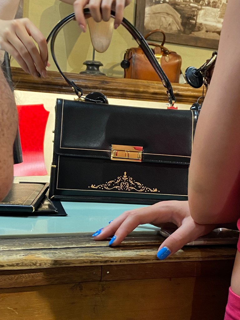 This purse was originally commissioned to be designed for Princess Grace of Monaco (Grace Kelly) – it was hand made for her at this shop when she was in Florence on location filming “To Catch A Thief”. They now sell handmade replicas of the “Grace Kelly” bag for several hundred euros.