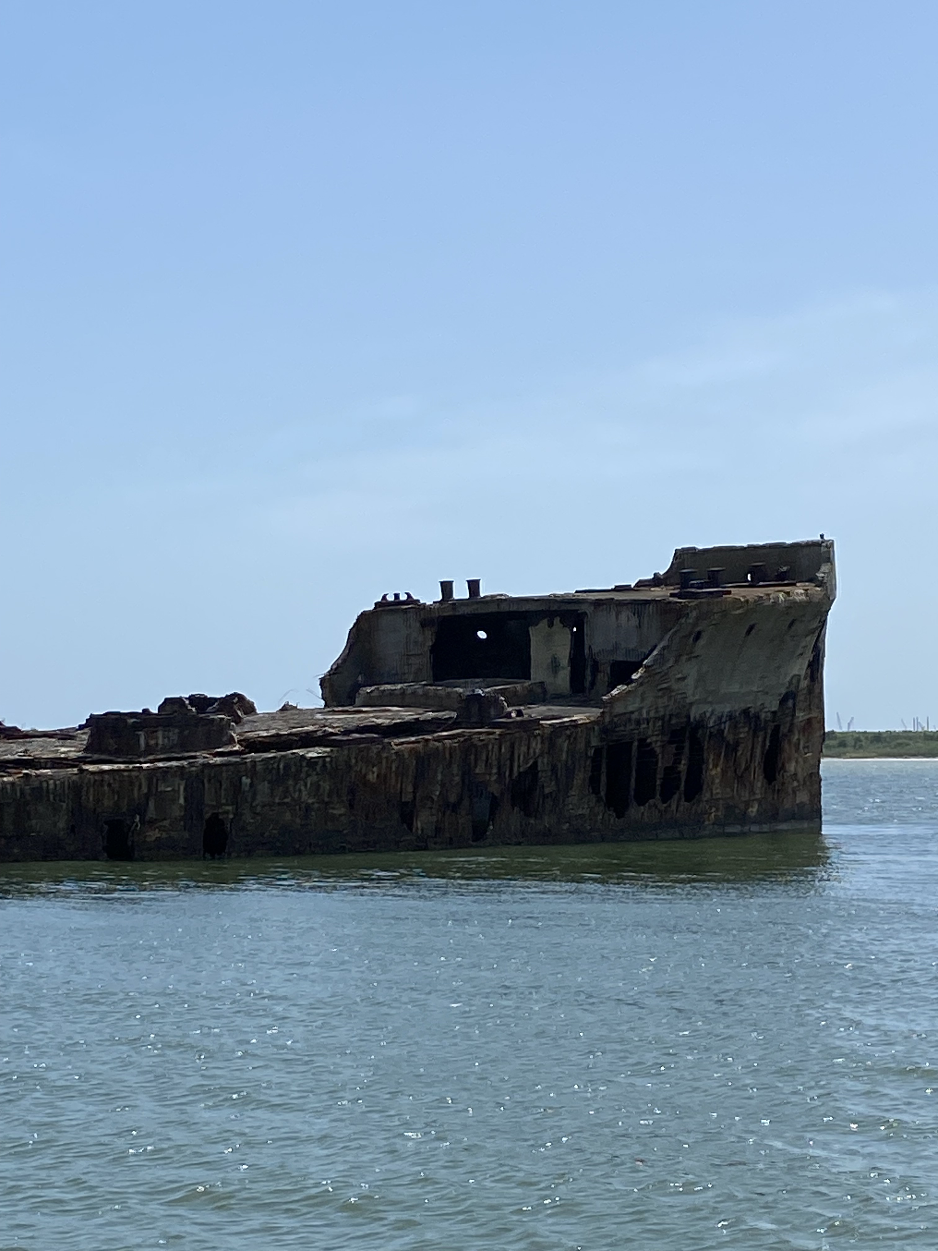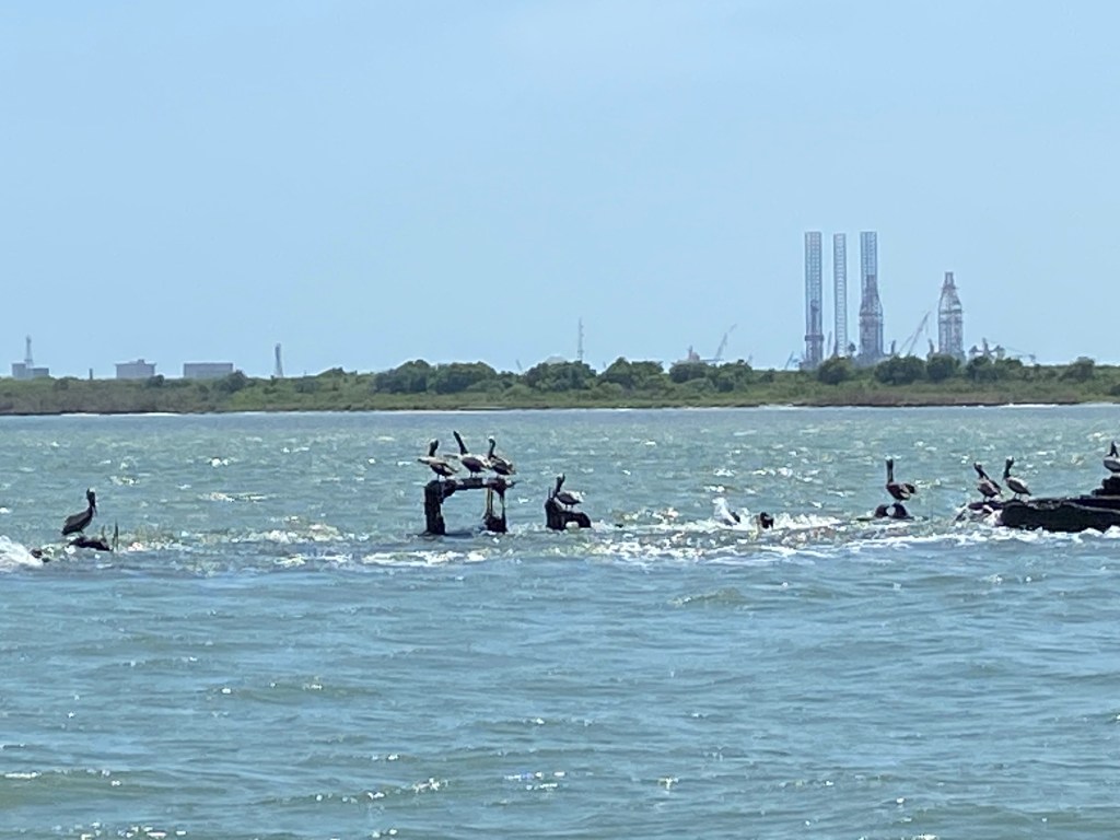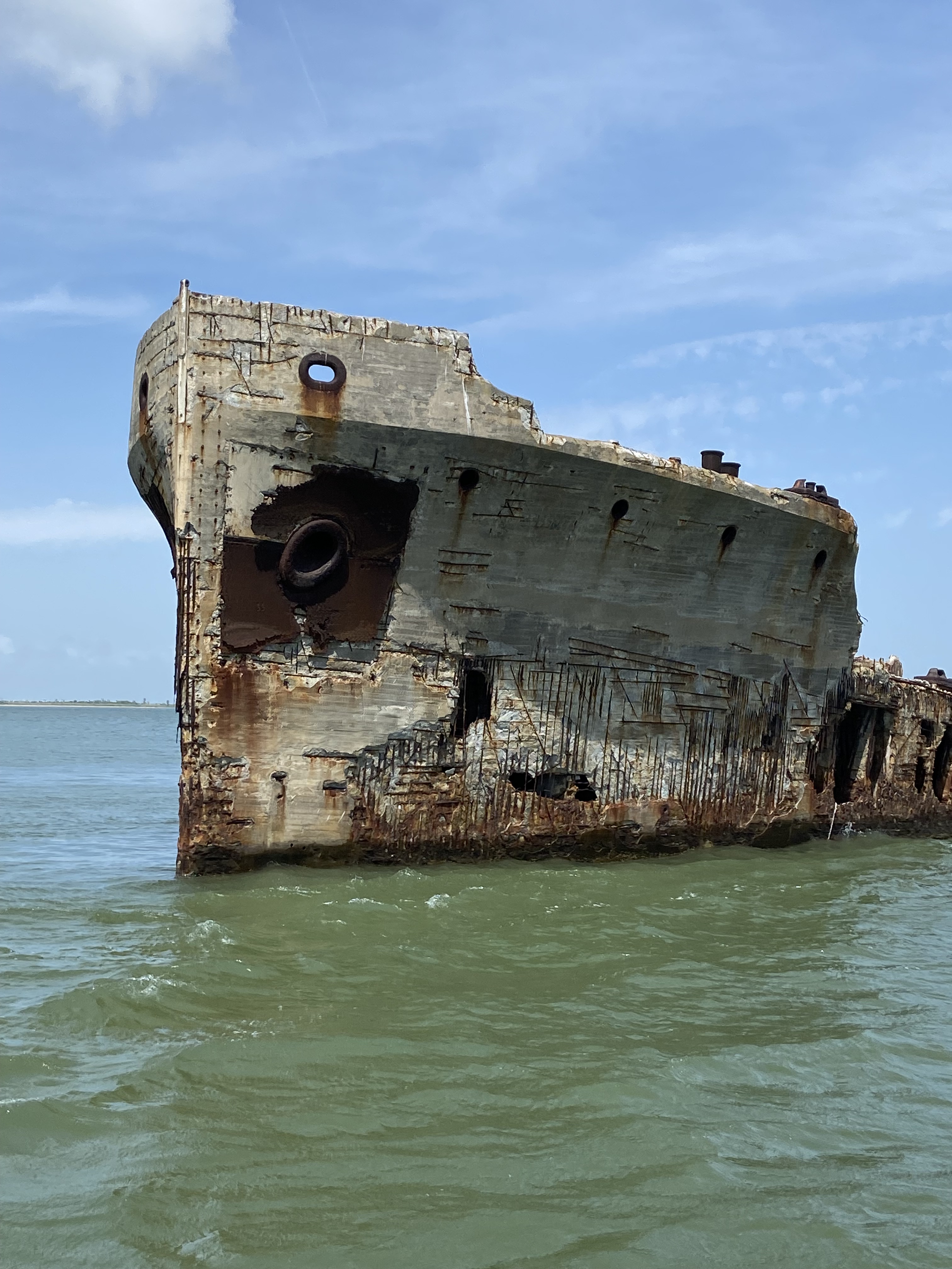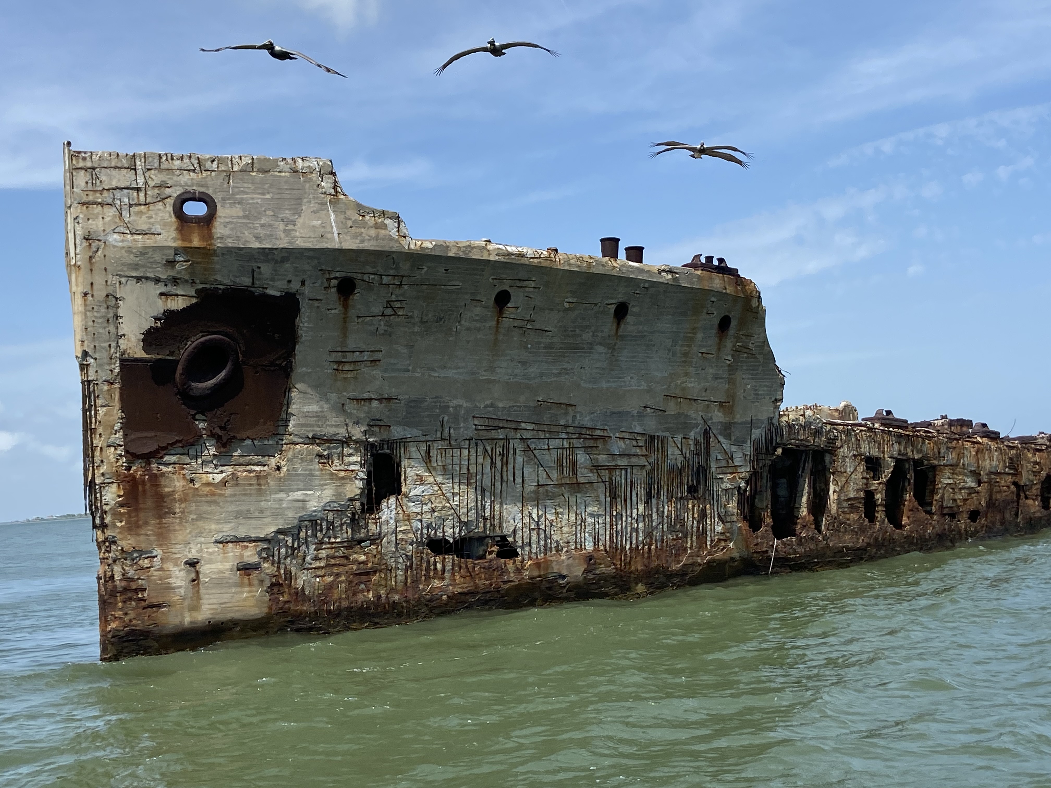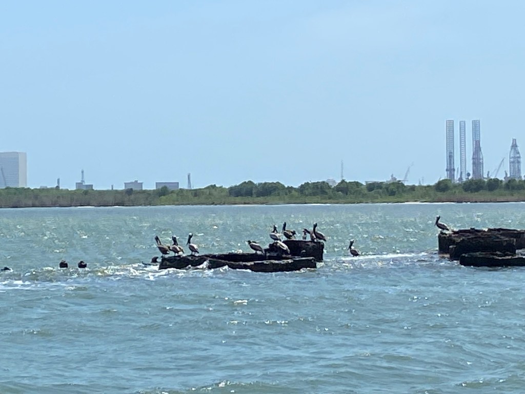 After lunch, I got on the Dolphin Cruise. It was the perfect day for a water tour – warm and sunny! We cruised all along Galveston Bay. We saw several dolphins (didn’t get any really decent pics, but got two so-so ones), pelicans, and other water birds. One cool thing we saw was the SS Selma – a WWI concrete tanker ship that was scuttled in shallow waters in Galveston Bay in 1920!!! They attempted to pull it to shore, but there was too much damage to it, so they decided to just leave it there as a warning to other ships of the shallow waters in the bay. We also got a glimpse of the USS Texas battleship that is dry docked in Galveston Bay undergoing repairs to the floating museum. The USS Texas is the only battleship that survived both WWI and WWII and is one of the oldest surviving Naval ships having turned 100 in 2014.