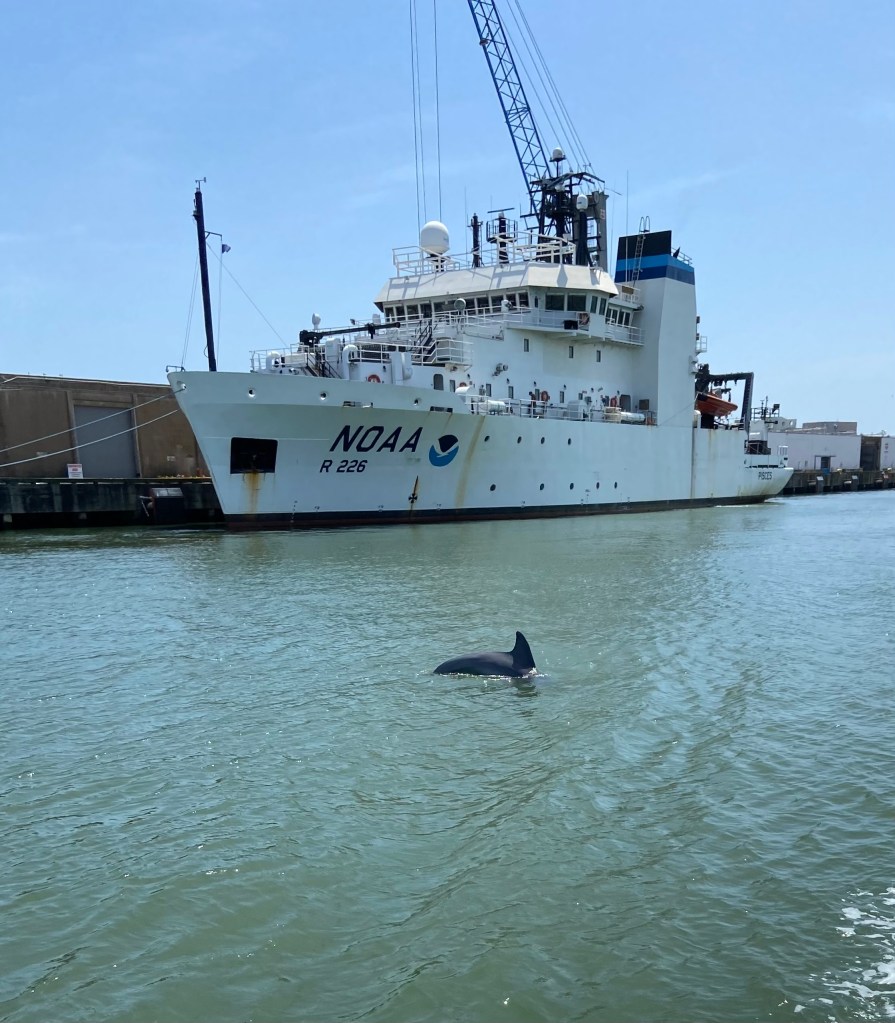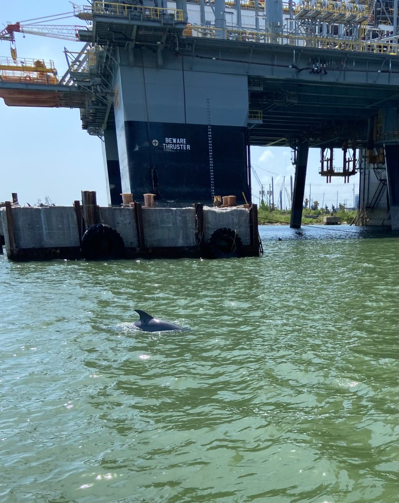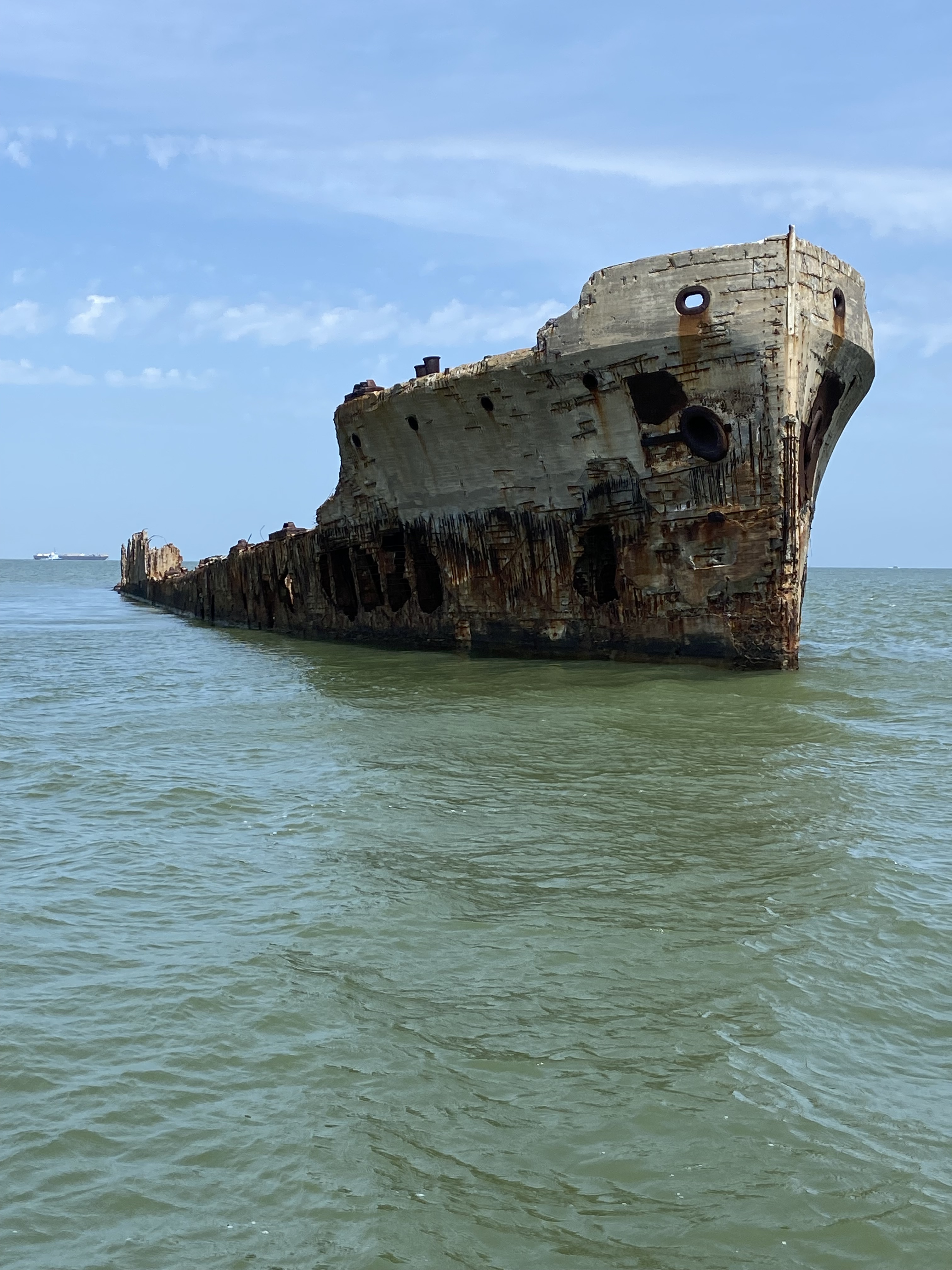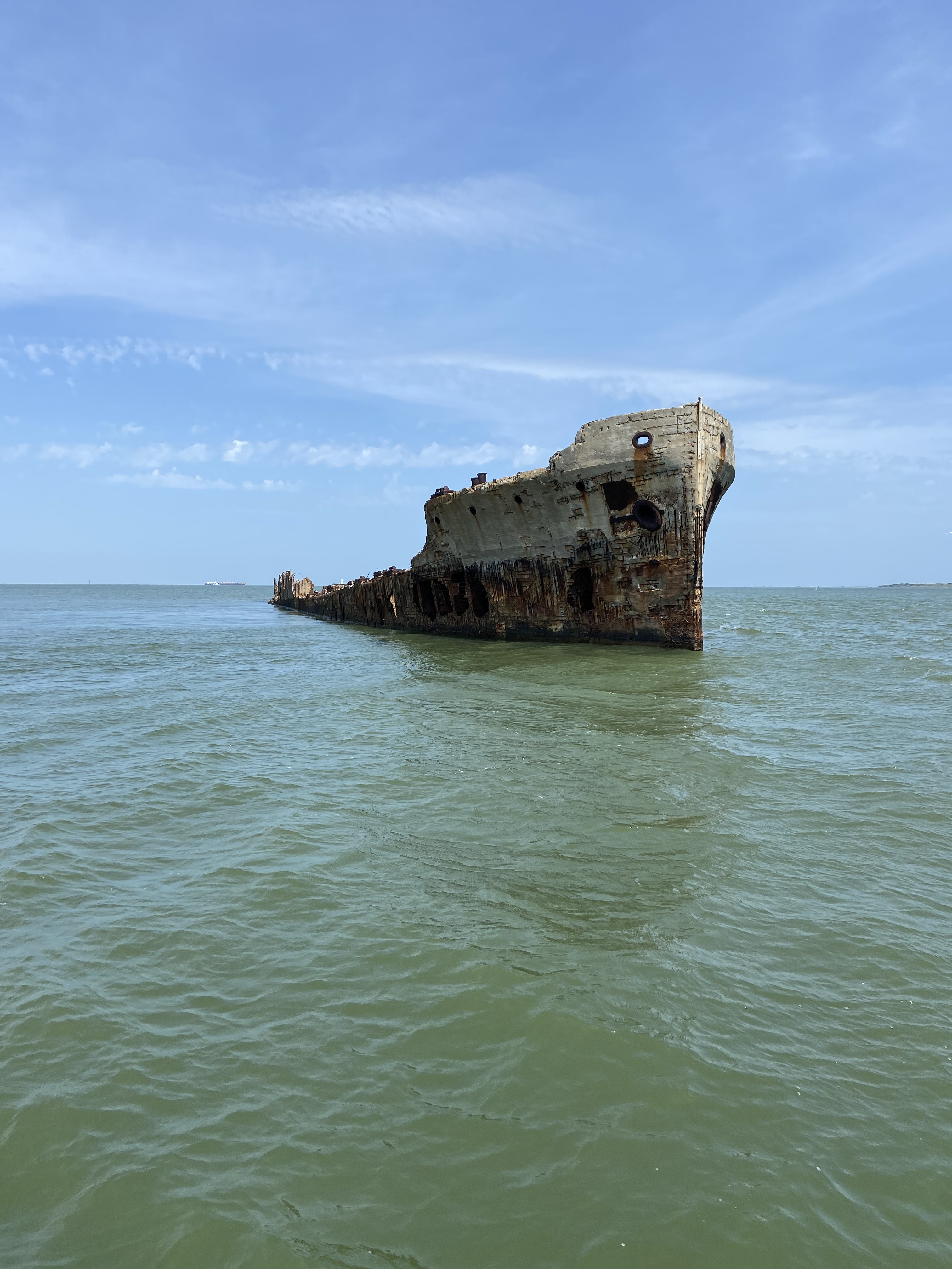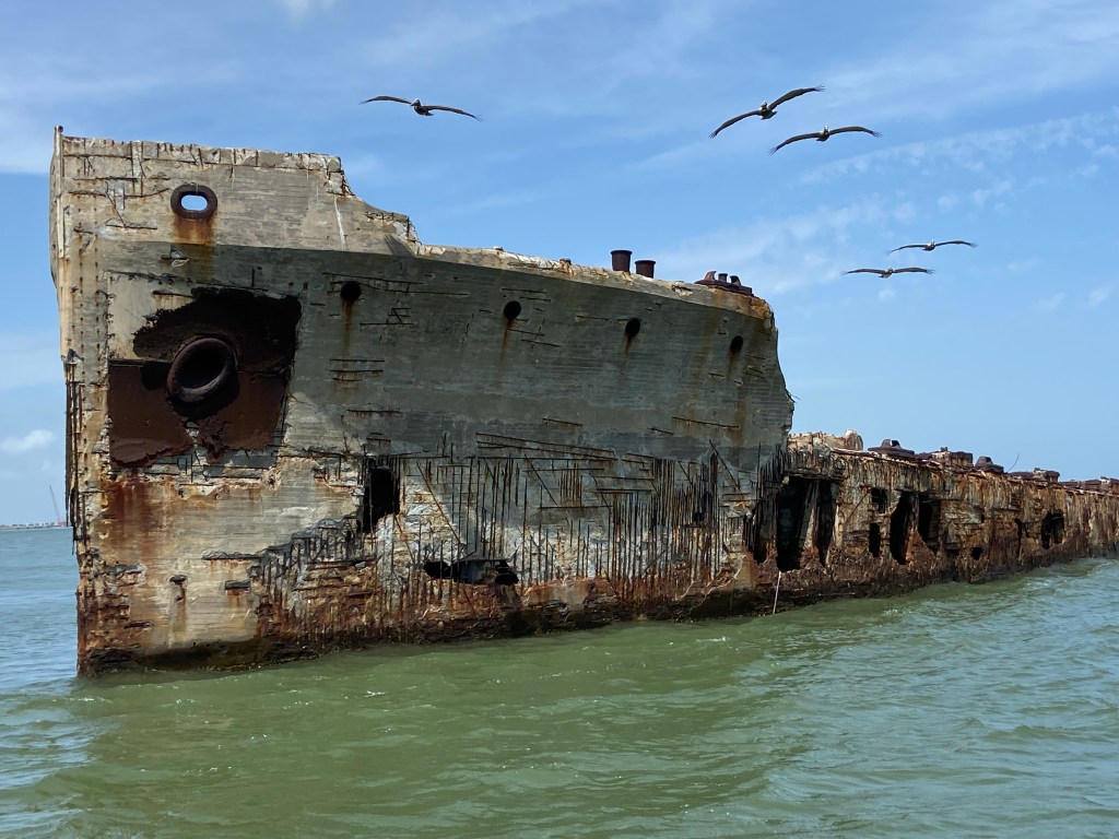 After lunch, I got on the Dolphin Cruise. It was the perfect day for a water tour – warm and sunny! We cruised all along Galveston Bay. We saw several dolphins (didn’t get any really decent pics, but got two so-so ones), pelicans, and other water birds. One cool thing we saw was the SS Selma – a WWI concrete tanker ship that was scuttled in shallow waters in Galveston Bay in 1920!!! They attempted to pull it to shore, but there was too much damage to it, so they decided to just leave it there as a warning to other ships of the shallow waters in the bay. We also got a glimpse of the USS Texas battleship that is dry docked in Galveston Bay undergoing repairs to the floating museum. The USS Texas is the only battleship that survived both WWI and WWII and is one of the oldest surviving Naval ships having turned 100 in 2014.