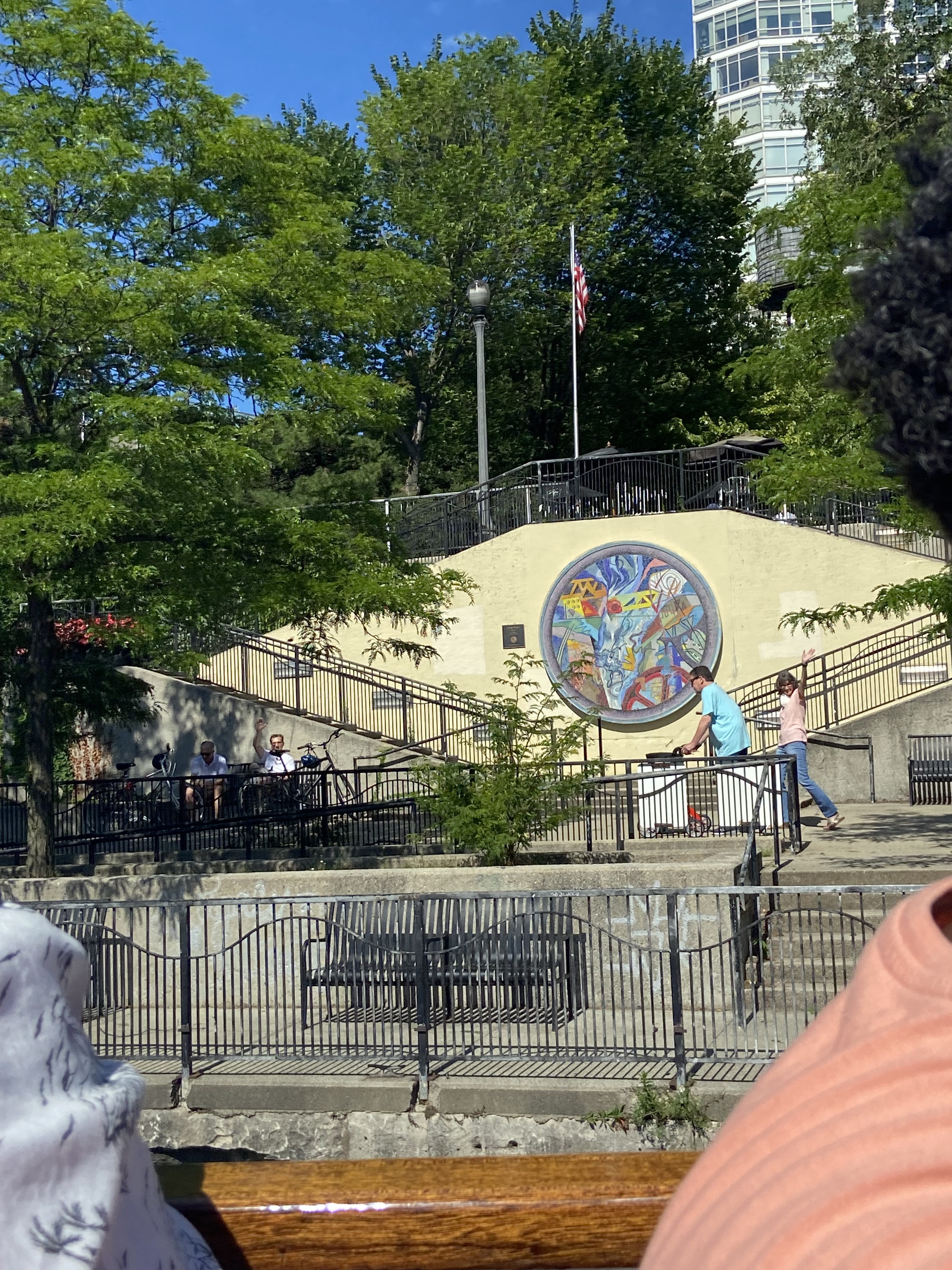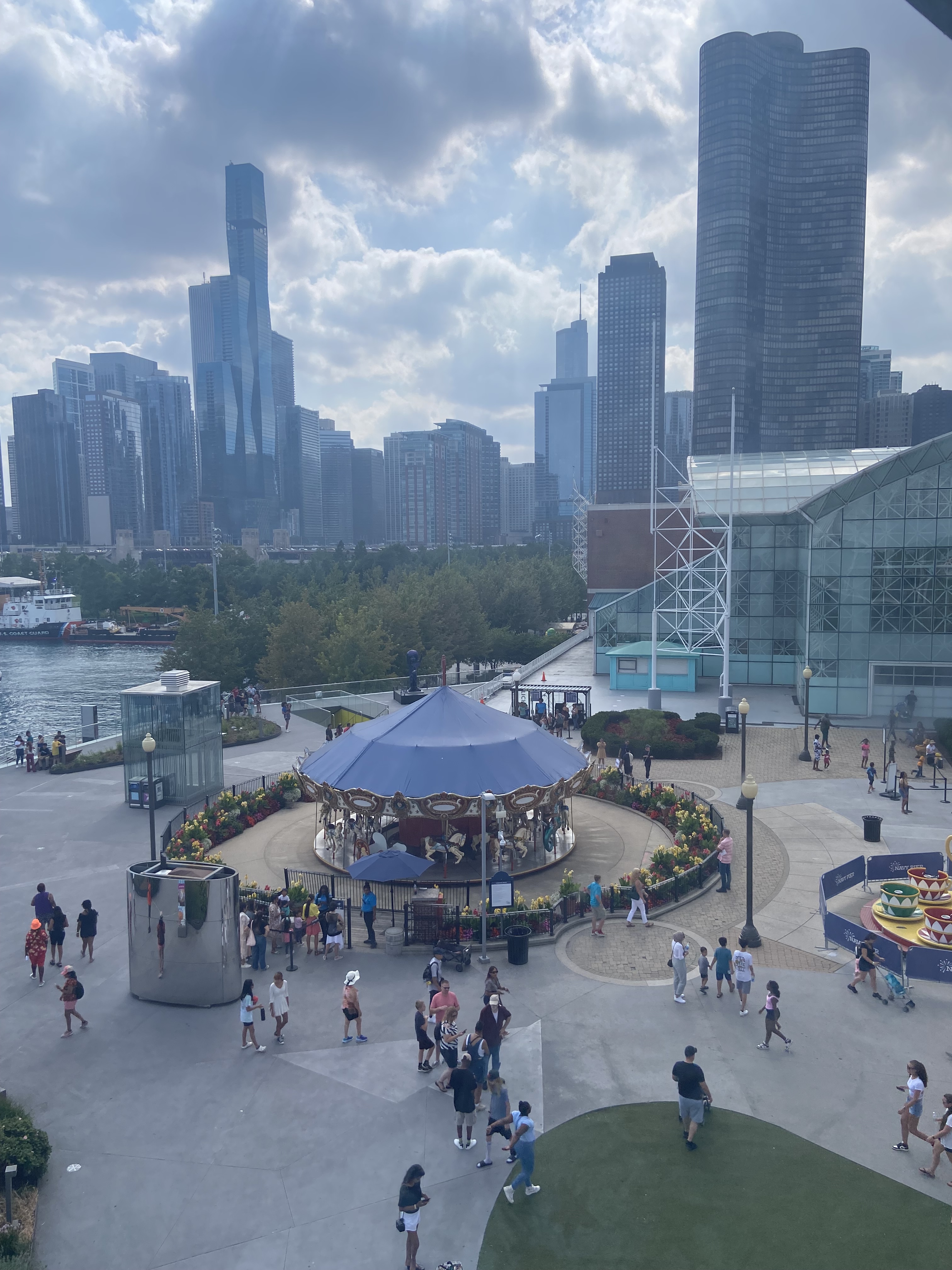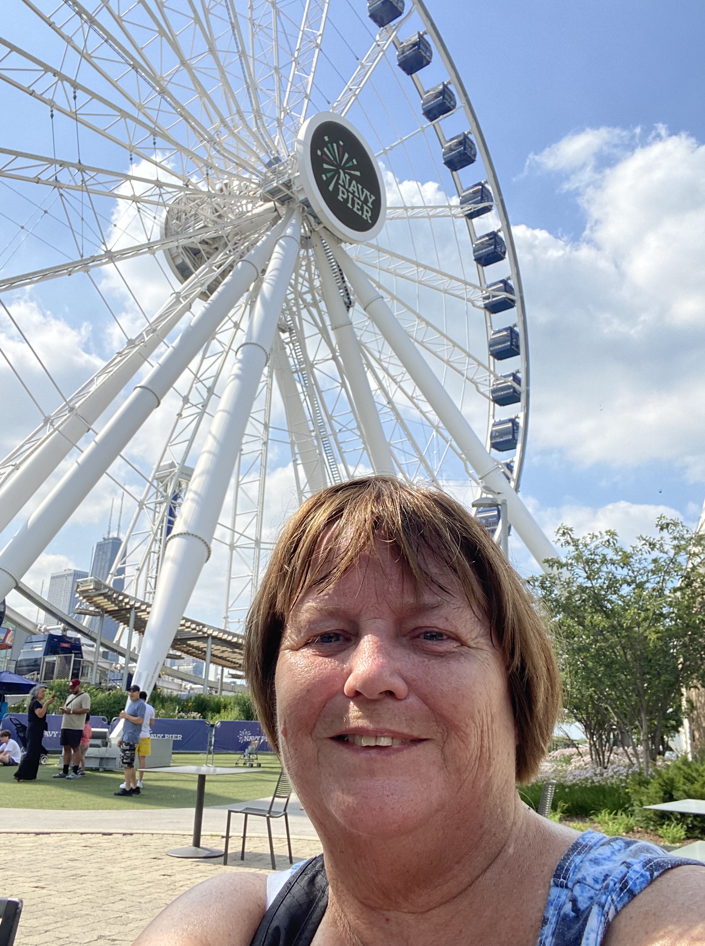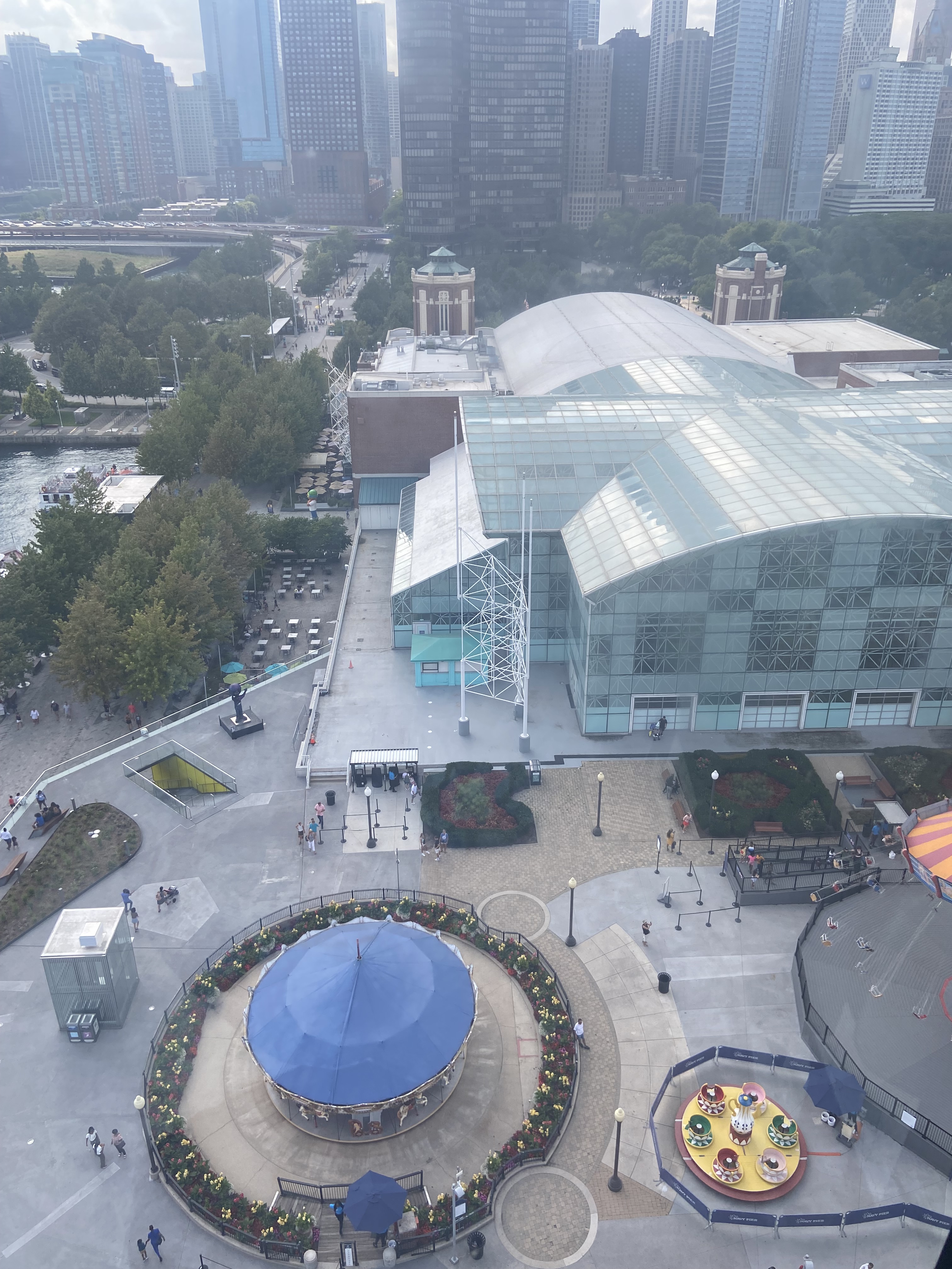 The big thing we did on Friday was Navy Pier! I rode the Centennial Wheel – the huge ferris wheel! I really wanted to do this cause I regretted not doing the one in Seattle and I’m getting too old for regrets and “I’ll do it next times”! It was fun — I’m glad I did it…..and, it wasn’t as scary as I thought it’d be – the seats were in fully enclosed baskets that stayed very stable and were air conditioned. But, the views were spectacular and I enjoyed it! I treated myself to an ice cream after……the rest of the group shopped and explored inside Navy Pier while I was out in the extreme heat being adventurous…..not sure who had the better experience! hahaha