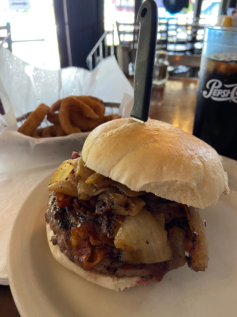 I had the Cattleman’s burger topped with bacon and BBQ sauce and I had them add grilled onions, as well. It also comes with cheese, but I opted to have that left off because of my cheese allergy. It was sooooo good!!! AND HUGE!!! I think it is the biggest burger I’ve ever seen! I ate 1/2 and about 2 bites of the other half and a few of my onion rings and was SUPER STUFFED!!!