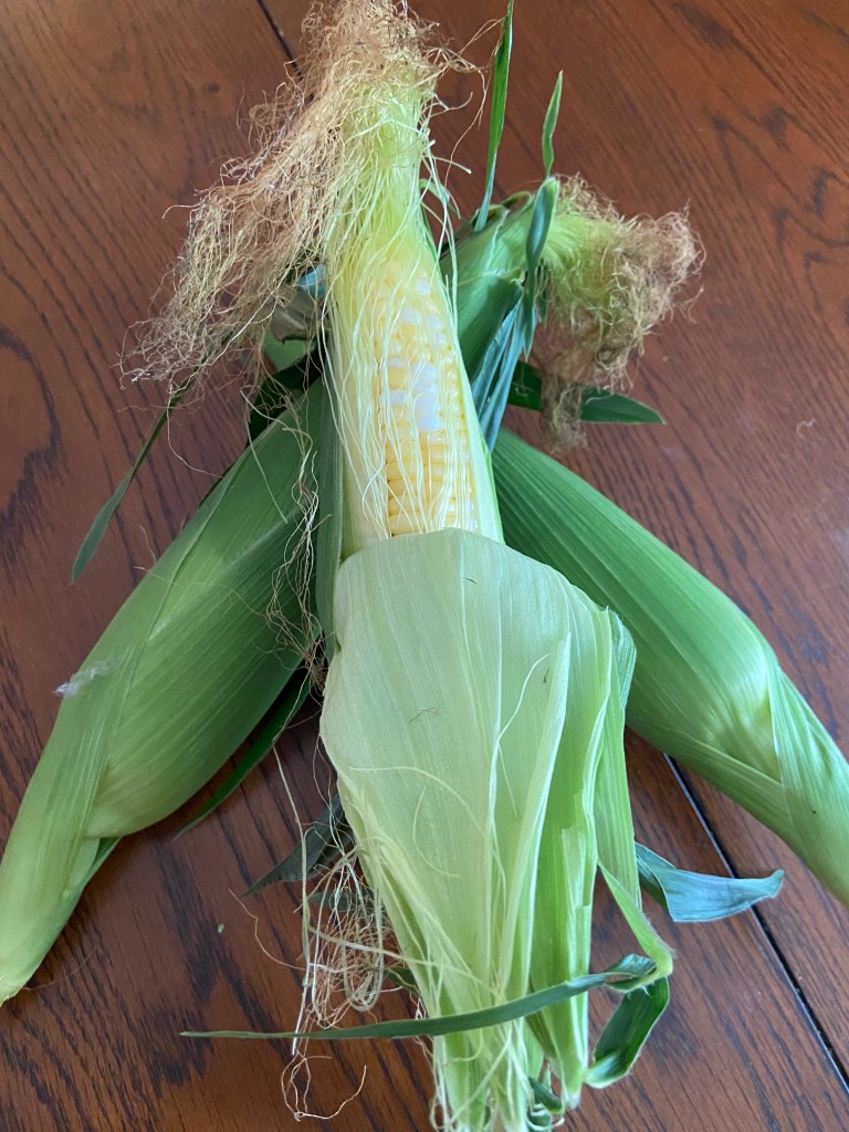 When I was growing up, the field beside our house was corn most years (every few years, they switched to cabbage to put some nutrients back in the soil – they’d let a certain percentage of the crop rot and plow it under to enrich the soil). It wasn’t sweet corn, though – it was field corn (we always called it “cow corn”) – it was bigger and chewier than typical sweet corn and raised mainly to feed the cows. We’d go over to the edge of the field along our property and pick a few ears for Sunday dinner on occasion (yes, the farmer knew we did it and was OK with that — he was our neighbor). Maybe that’s why I like the fatter ears of sweet corn – I grew up on field corn!!!