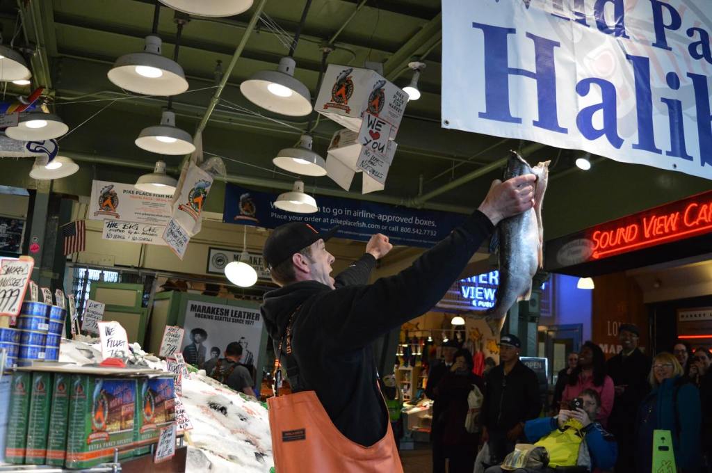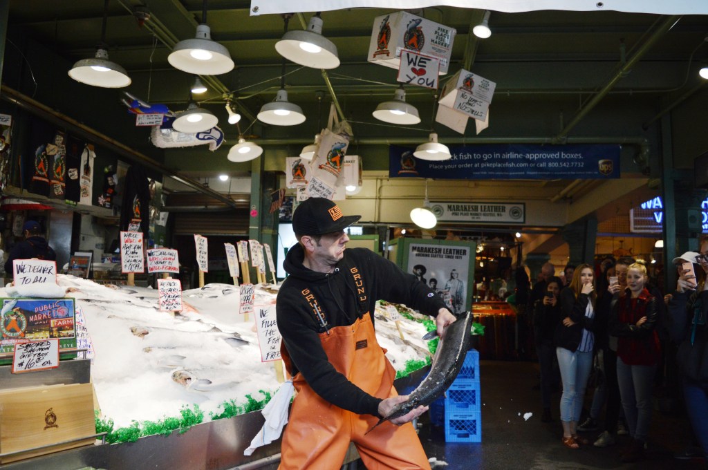 The famous fishmongers at the Pike Place Fish Co at the Public Market in Seattle, WA on April 7, 2017.