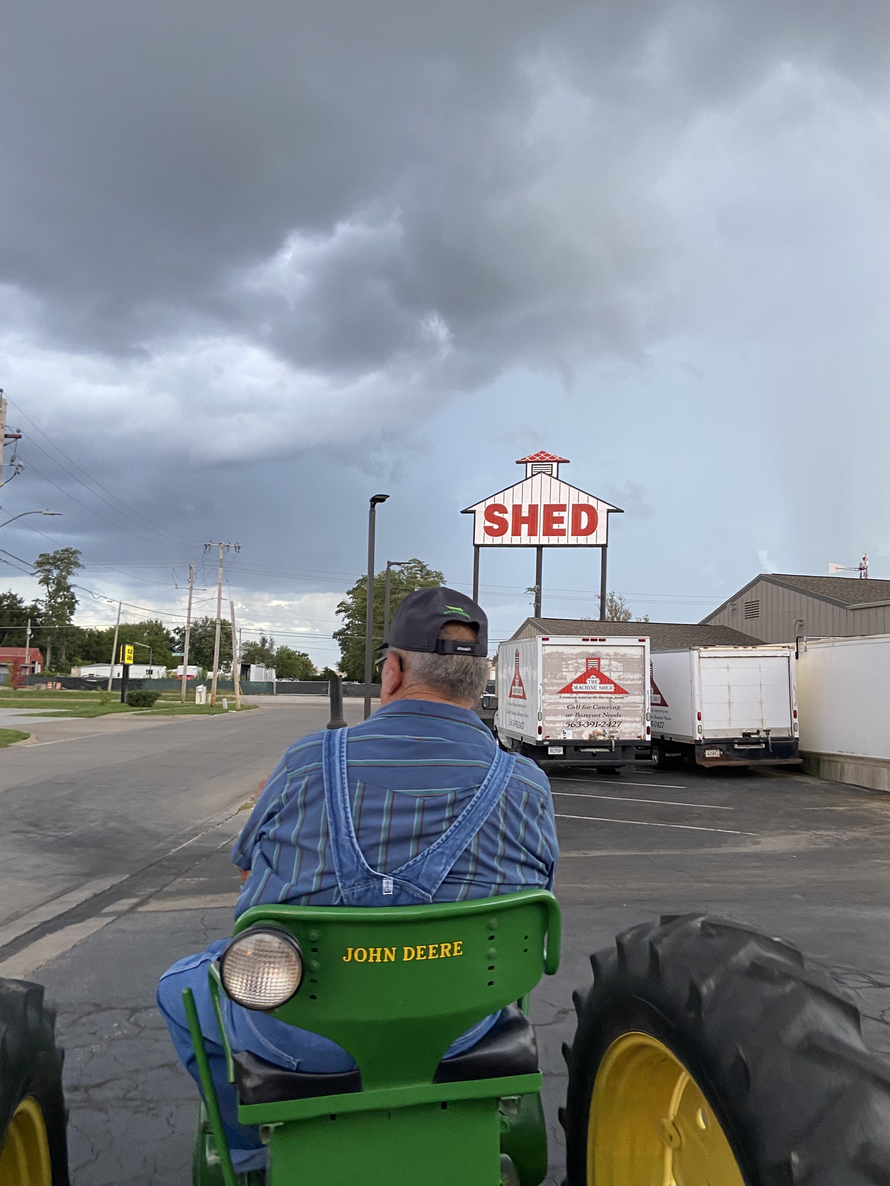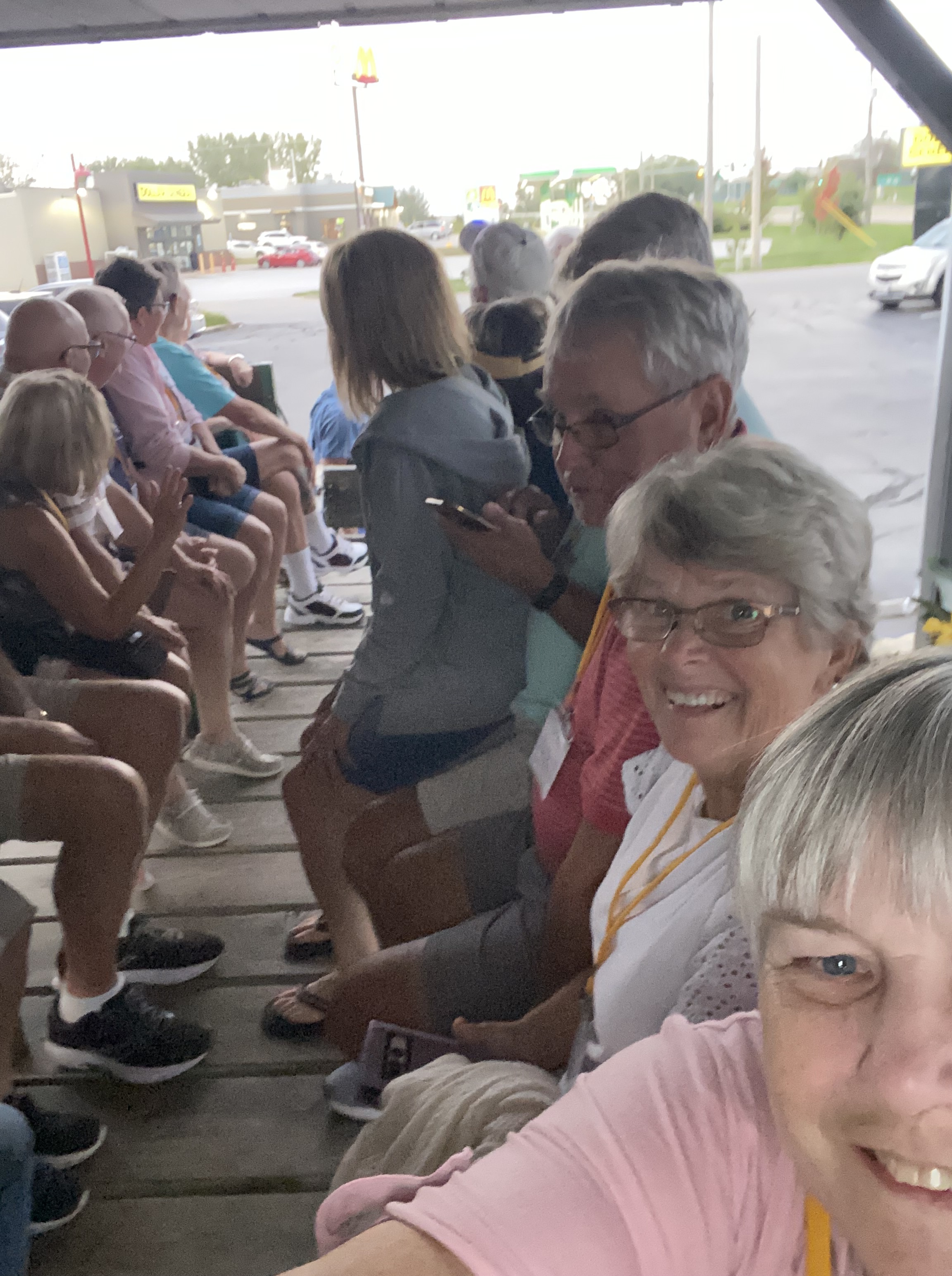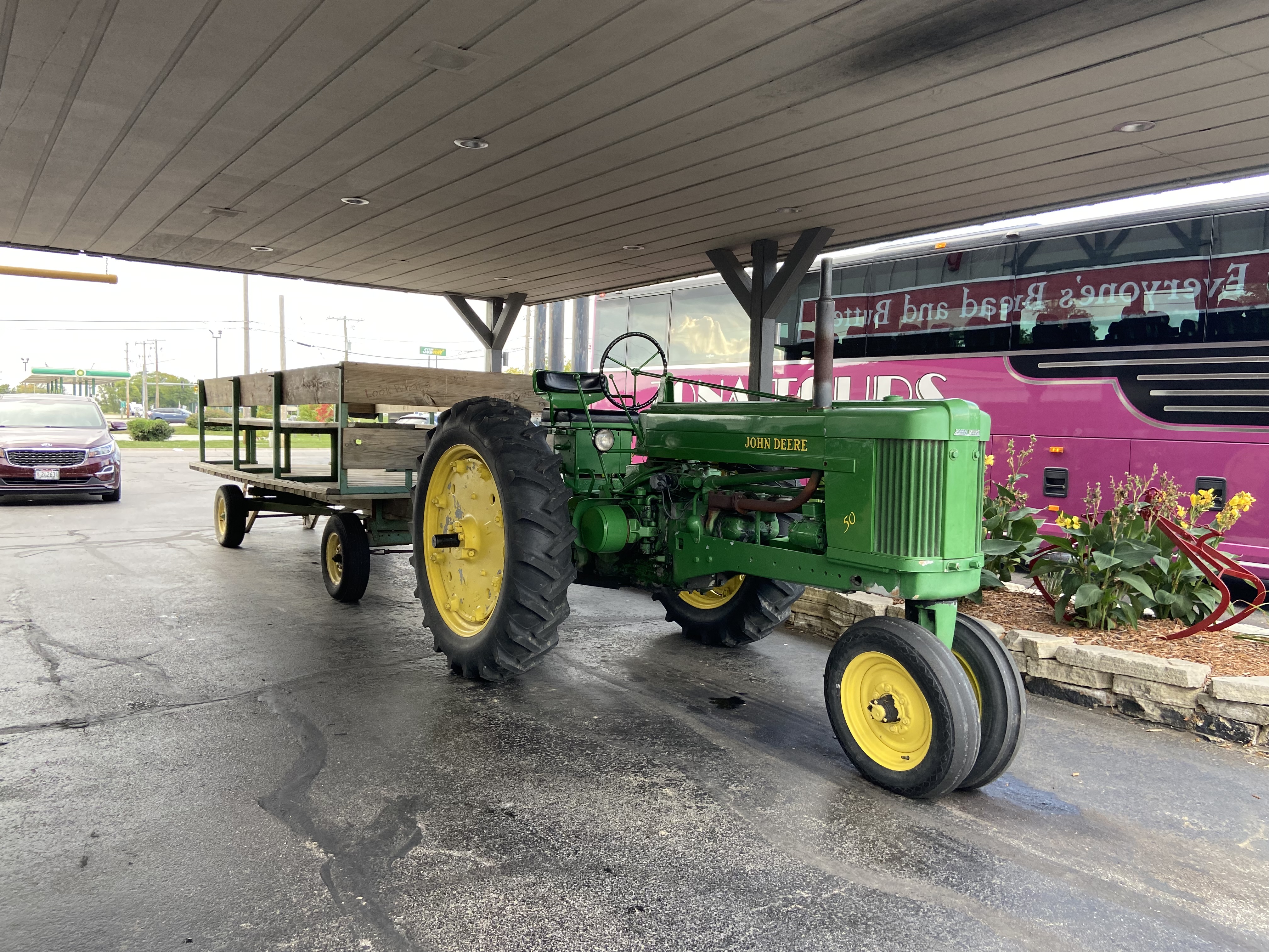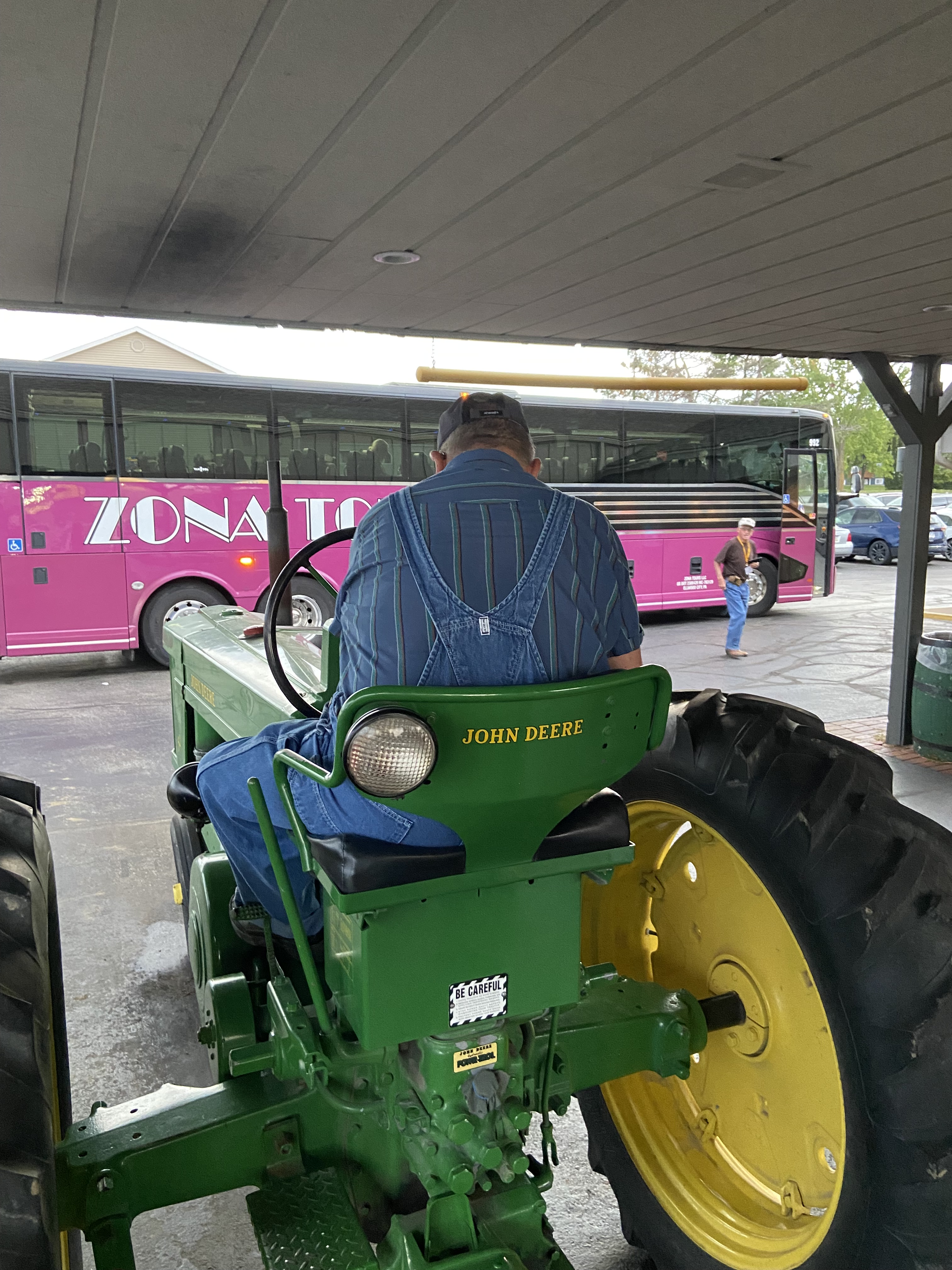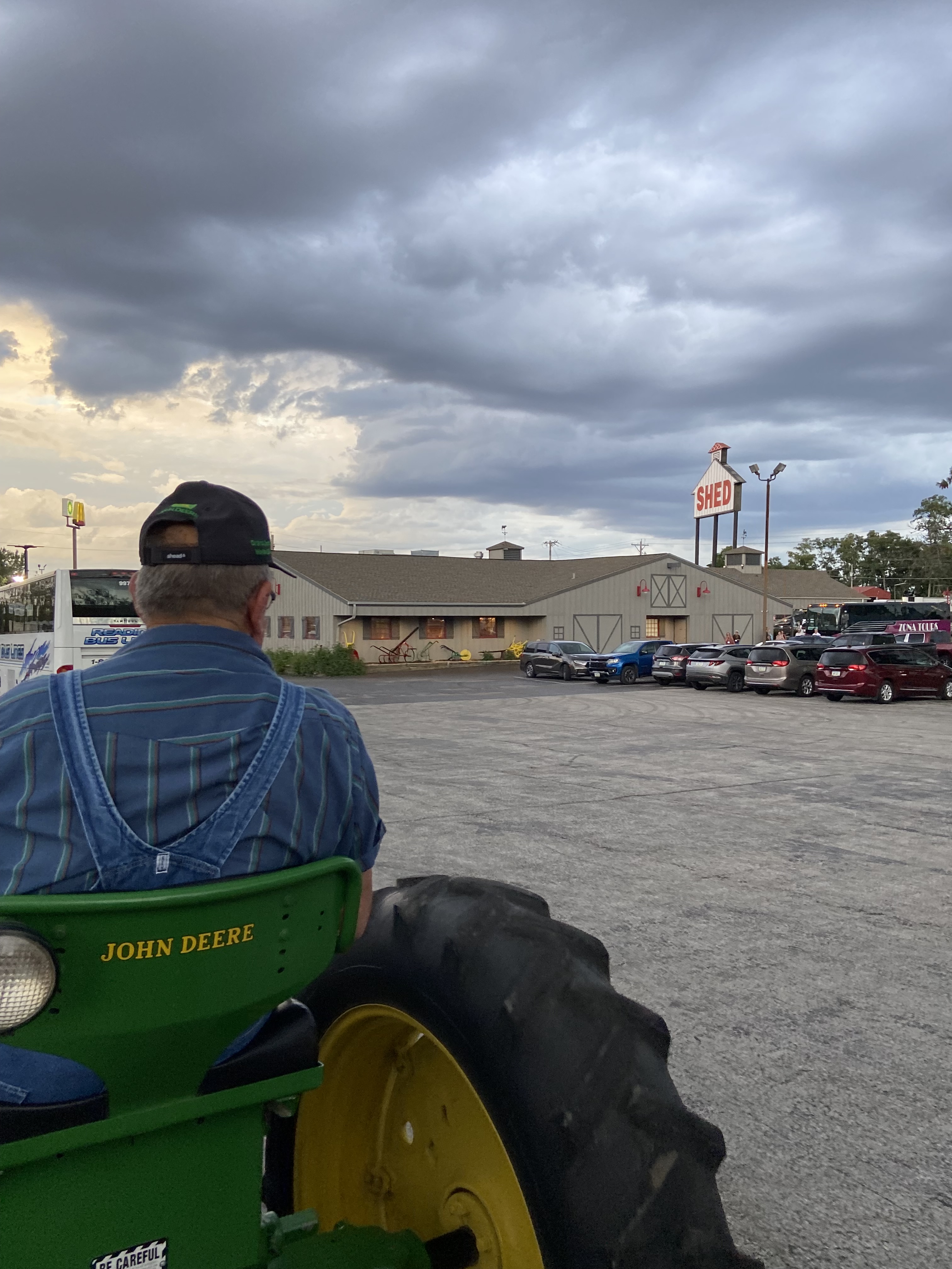 The ride was a couple times around the parking lot…..every turn the hitch would groan and creak and sound like it was about to disintegrate….the wagon pitched and rocked and squeaked and we weren’t sure we’d make it back to the starting point without it breaking away from the tractor and leave us free wheeling down the road! LOL And then the clouds darkened and the thunder and lightening began and the wind picked up…..we thought he’d end the ride, but, nope…..he went right past the start point and did another pass around the parking lot with the rain starting to sprinkle…..he drove right past our bus as some yelled out “just let us off here”…..it was hilarious and turned out to be such fun – what a riot…..despite us wondering if our lives were about to end!!! LOL But, the driver obviously knew it was safer than it seemed to us at the time and we got back safe and sound and just barely damp – it didn’t fully start to rain so we didn’t get wet!