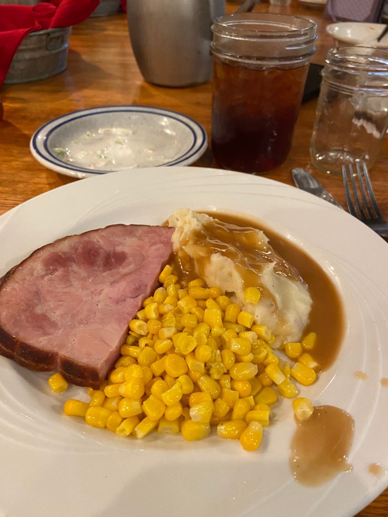 Dinner was fun!!! We ate at the Iowa Machine Shed Restaurant in Davenport, Iowa. It was a really cool place with lots to photograph, good food, friendly atmosphere, and time to shop after we ate. It was a pre-paid dinner that we had to choose from a menu ahead of time — I chose the ham dinner and it was so good!!! The waitresses wore overalls and the drinks were served in mason jar glasses and it was just a really great time all around!