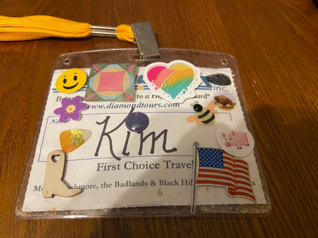At the orientation meeting, Kathy gave us an info package that included a name tag that served several purposes…..we were told to wear it at all times during the trip! First, it let everyone on the bus know what to call us…..no need to say “hey, you” or “that short girl over there”! They knew me as “Kim” right off the bat! It also was our “ticket” into the prepaid attractions and meals. And, it had the meal choices we had to make ahead of time typed on the back so we could remember what we chose! But, the fun part of the name tags was the daily stickers Kathy gave us! Each morning as soon as we started off for the day, Kathy gave us a saying or quote of the day — the first day was “Be Kinder Than You Need To Be”…..don’t ask me what they other days were…..LOL! And, then, she’d go up the aisle and give us a sticker of the day — each sticker either represented the saying of the day or something we were going to see or do that day. We all looked forward to the daily stickers! (Mine also collected crumbs throughout the trip! hahaha)