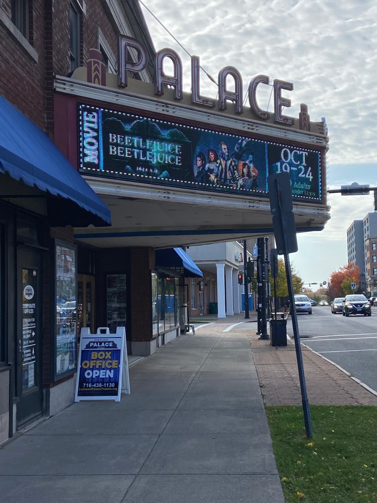 Then, on to the main event……I have heard a lot lately about the Historic Palace Theater in Lockport. I’ve never been there, but keep hearing great things, so I “liked” their Facebook page to watch for something I might be interested in. A couple days ago, I noticed a post advertising the showing of “Beetlejuice, Beetlejuice” and it sparked my interest – I loved the original “Beetlejuice” and was curious about the sequel! Yeah…..I could have saved a couple bucks by seeing it at Tinseltown on “Senior Day”, but I really wanted to see the Palace Theater more than the movie, itself! hahaha