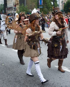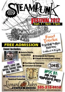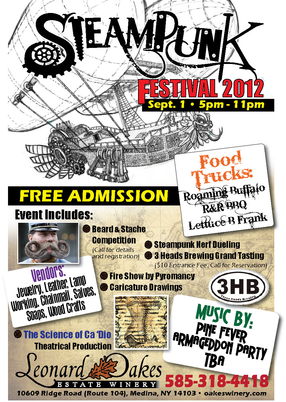 I’ll start with the first and, frankly, most memorable of the adventures. A few weeks ago I was checking out the website for a local winery I had heard a lot about – Leonard Oakes Estate Winery – I tasted some of their wines at the Lawn and Garden Show at the Fair Grounds this summer and really liked them. Their home page had an advertisement for an event they were having on September 1st – a Steampunk Festival. The poster listed features such as jewelry and craft vendors, live music, food trucks, and some odd, but fun, sounding competitions and games. I thought the name of the festival was odd, but it sounded interesting and a great way to check out the winery. So, on the first, I decided to pop in and wander around to see what it was all about. Well…….I quickly realized I had no idea what I was getting myself into! The people attending the festival were dressed in costumes – sort of like the old west or old England with a fantasy twist – top hats, faerie wings, pub wench outfits, Lewis and Clark type explorer garb, goggles, etc. And LOTS of big beards, artistic goatees, and handle bar mustaches!!! LOTS – even some of the women had them! I wondered what alternate universe I had stepped into! I wandered around and listened to the band play – they were very good, by the way – but, I felt about as out-of-place as a virgin in a whorehouse and I felt like everyone else was gawking at me more than I was gawking at them! haha So, I didn’t stay long. I realized that the term “Steampunk” must have had some specific meaning. Since I have never heard of it before, I did what I should have done before I went —- I googled it!!! Apparently, it is a futuristic/fantasy genre that became popular in the 80’s and 90’s and is still growing. The more I read about it, I realized I’ve seen previews of several movies with this type of theme – old steamer ships flying through the air with people dressed in old English attire – not generally my taste in films, but I know they were hugely popular. The Batavia Daily News Online did a story on the festival a few days later and one of the quotes was “Its the Victorian Era meets the future.” I guess that sums it up! I did enjoy wandering through the festival – even though I was definitely the odd duck there – and I was happy to experience and learn about something new. The following photos are: The event poster, a photo I found online that shows the typical Steampunk costume, and three photos that were included in the Batavia Daily News Online article – I didn’t take any photos, myself — I didn’t want to look any more out-of-place than I already felt – the odd duck taking pictures of the locals! {smile}