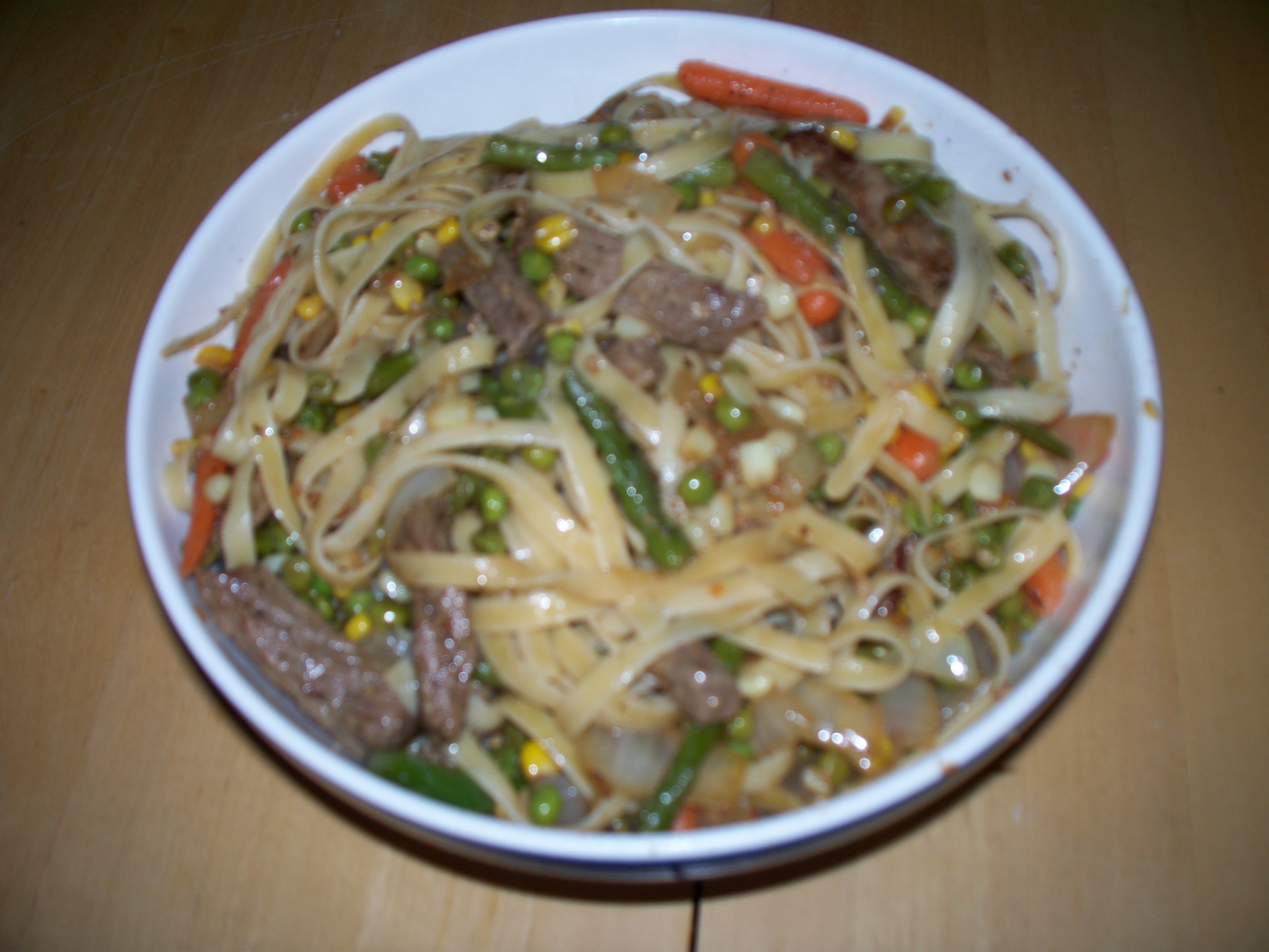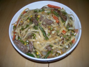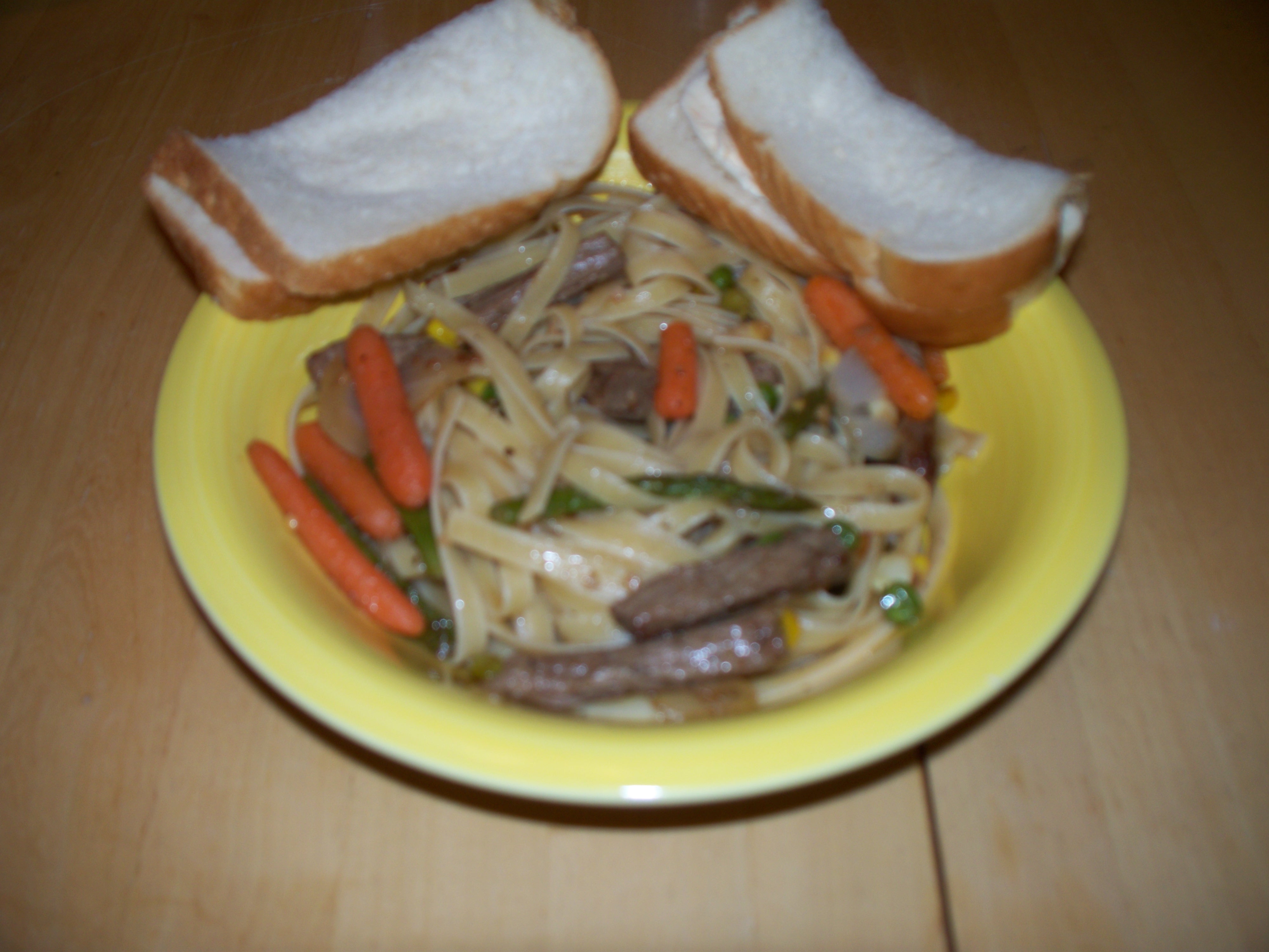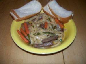 The variation I made tonight was with beef strips, linguine, and a mixture of corn, baby carrots, asparagus, and peas. I also used Italian Herb flavored roasted garlic. It was amazing and full of wonderful flavor! The only thing I would do different, if I ever use beef strips again, is to marinate it or something to tenderize is some – it was just a little chewy, but not bad!