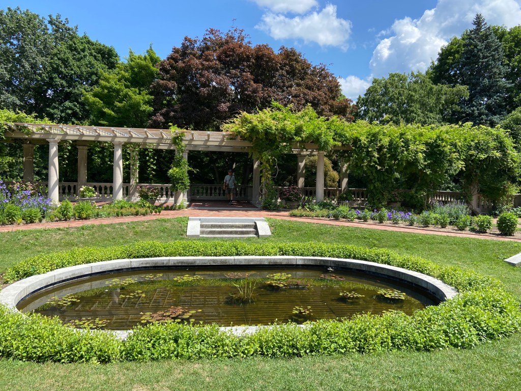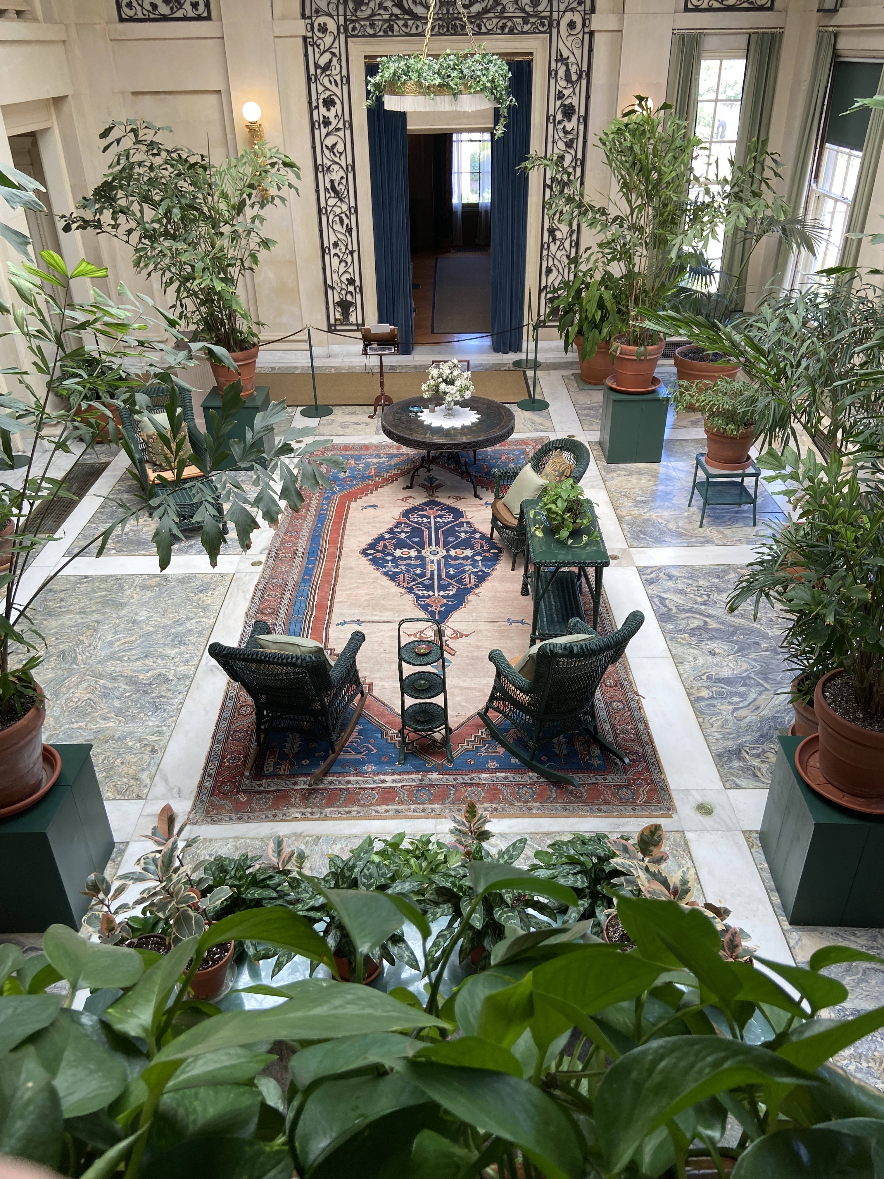 I had a lovely day out with my friend Lisa, yesterday…..we visited Frank Lloyd Wright’s Martin House in Buffalo, NY. The tour was very interesting and the house was wonderfully restored by the restoration partners. The house was built between 1903-1905 for the Darwin D. Martin family. The 1.5 acre complex includes the Martin House, the Barton House – built for Martin’s sister and her family (the first to be built on the site), the carriage house, the gardener’s cottage, a conservatory, and a pergola. We only toured the main house, pergola, and conservatory. The other buildings are included on the expanded tour.
