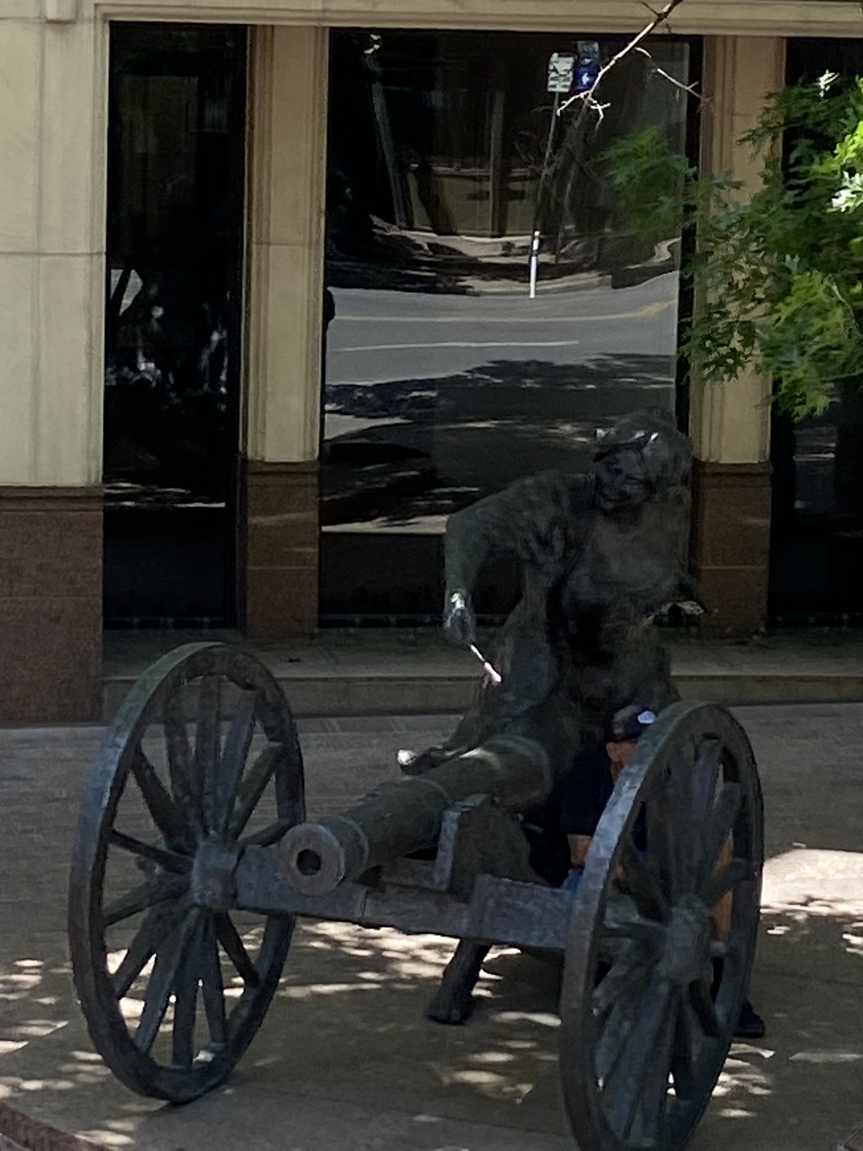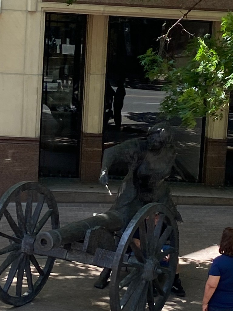 Statue of a woman firing a Howitzer canon located on Congress Ave. between 6th and 7th streets. The story, according to Roadside America: “In 1842, on a dark December night, Sam Houston tried to take the Texas archives out of Austin, thereby eliminating it as a possible capital city of the Republic. Angelina Eberly, a middle-aged woman, saw what was going on downtown and fired a cannon at the thieves. They failed, Austin became the capital, and in 2004 the city, in gratitude, erected a bronze statue of Angelina firing her cannon at the spot where she stood.”