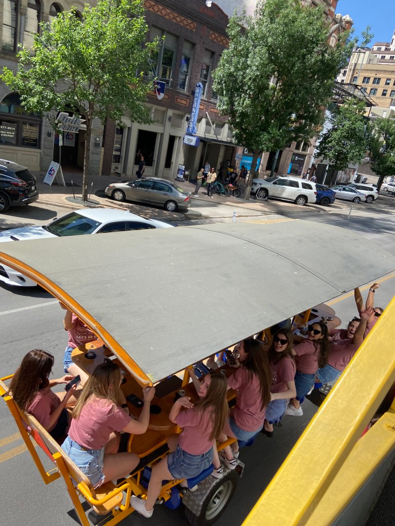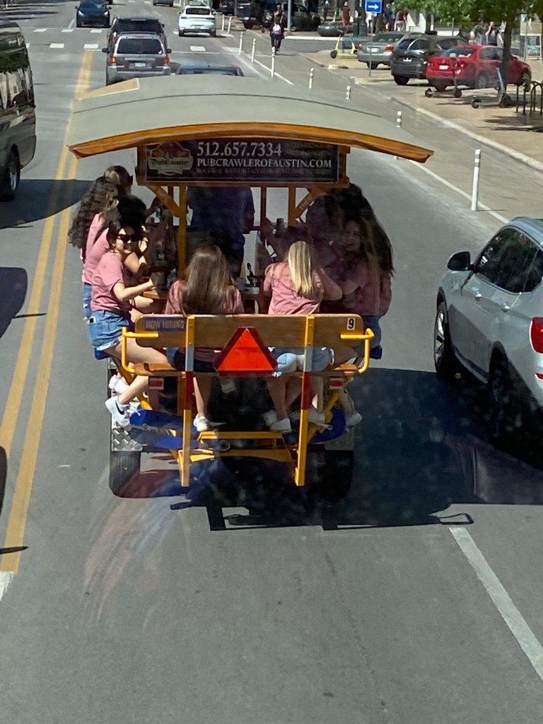 This was a Pub Crawl Tour we passed — the girls were having a BLAST saddled up to the bar and cruising around the city whooping and hollering!!!