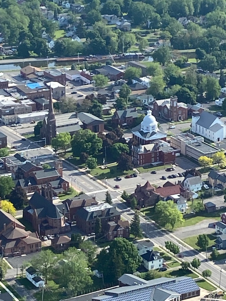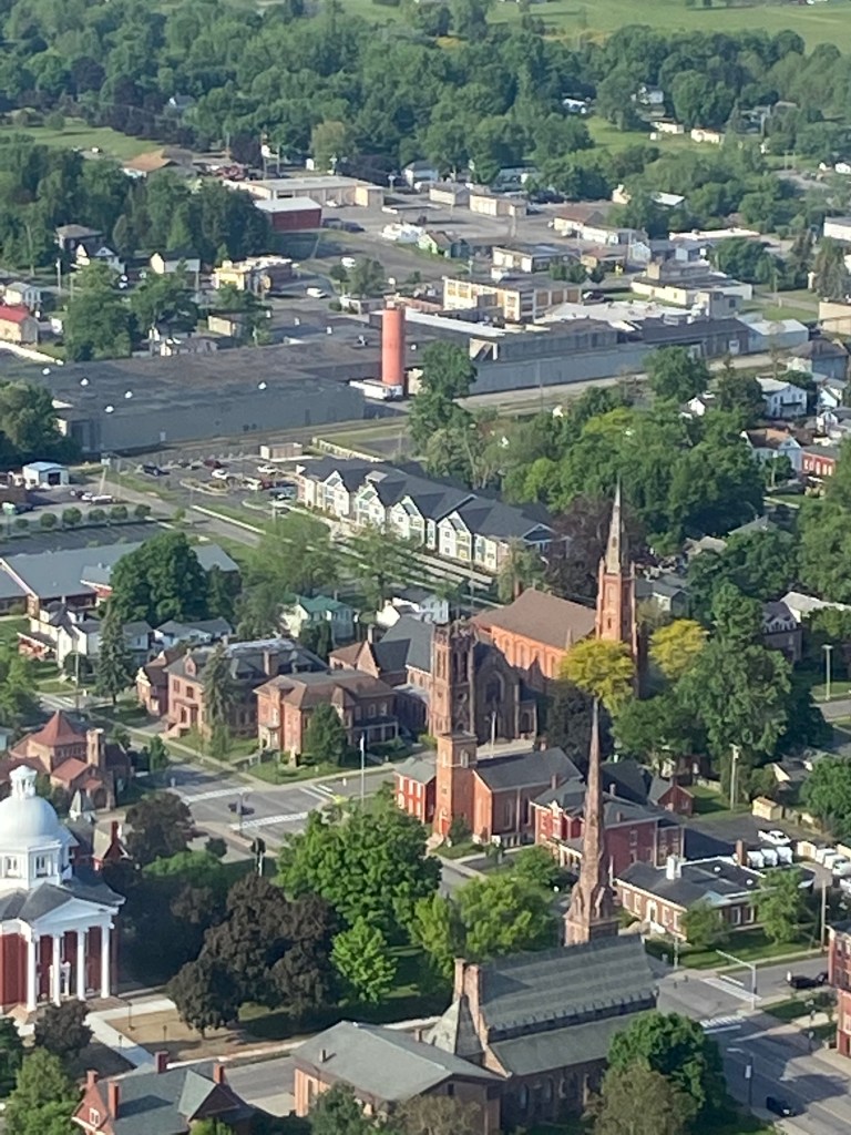Christ Episcopal Church (lower right of center), Holy Family Church (left of center), and First Baptist Church (the one with the tall two-toned steeple)