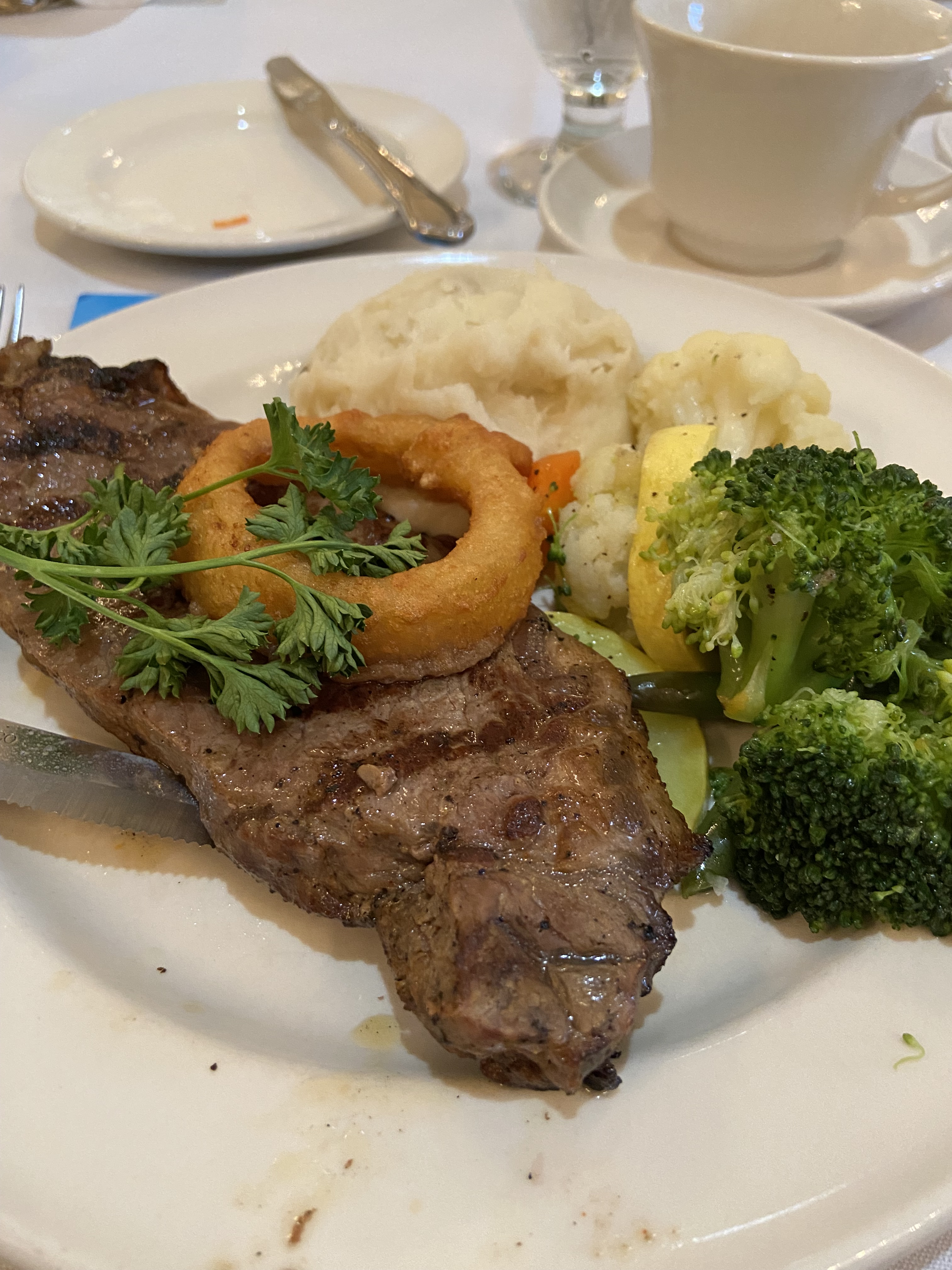The meal began with delicious warm rolls and a cup of Italian Wedding Soup — so good!!! Then a very nice salad. Then, the main course – the entree’s were served with mashed potatoes and a vegetable medley of broccoli, cauliflower, green beans, summer squash, zucchini, and carrots and the steaks also had an onion ring on top. Then, the meal was capped off with a scoop of vanilla ice cream with chocolate syrup and whipped cream….perfection!!!