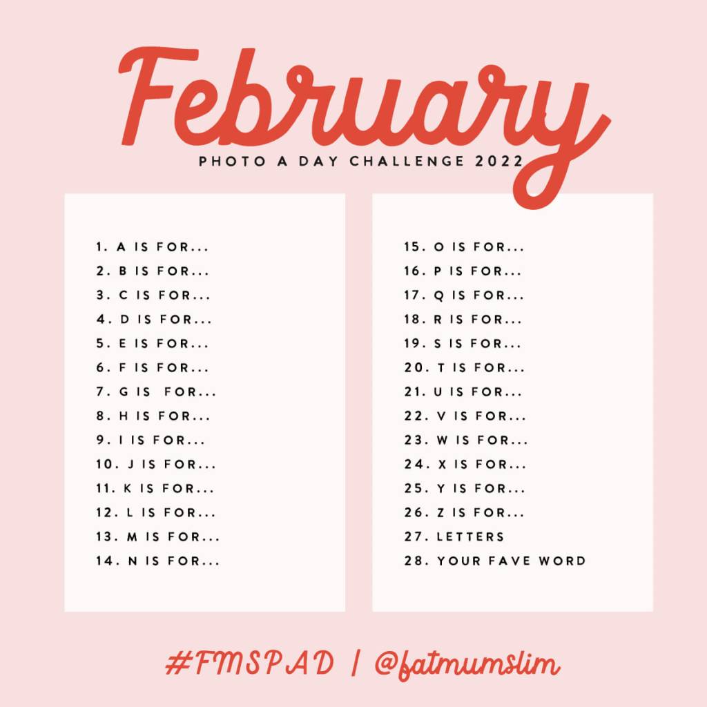 So, here’s February’s Daily Photo Challenge Topic List — we’re doing the alphabet in February!