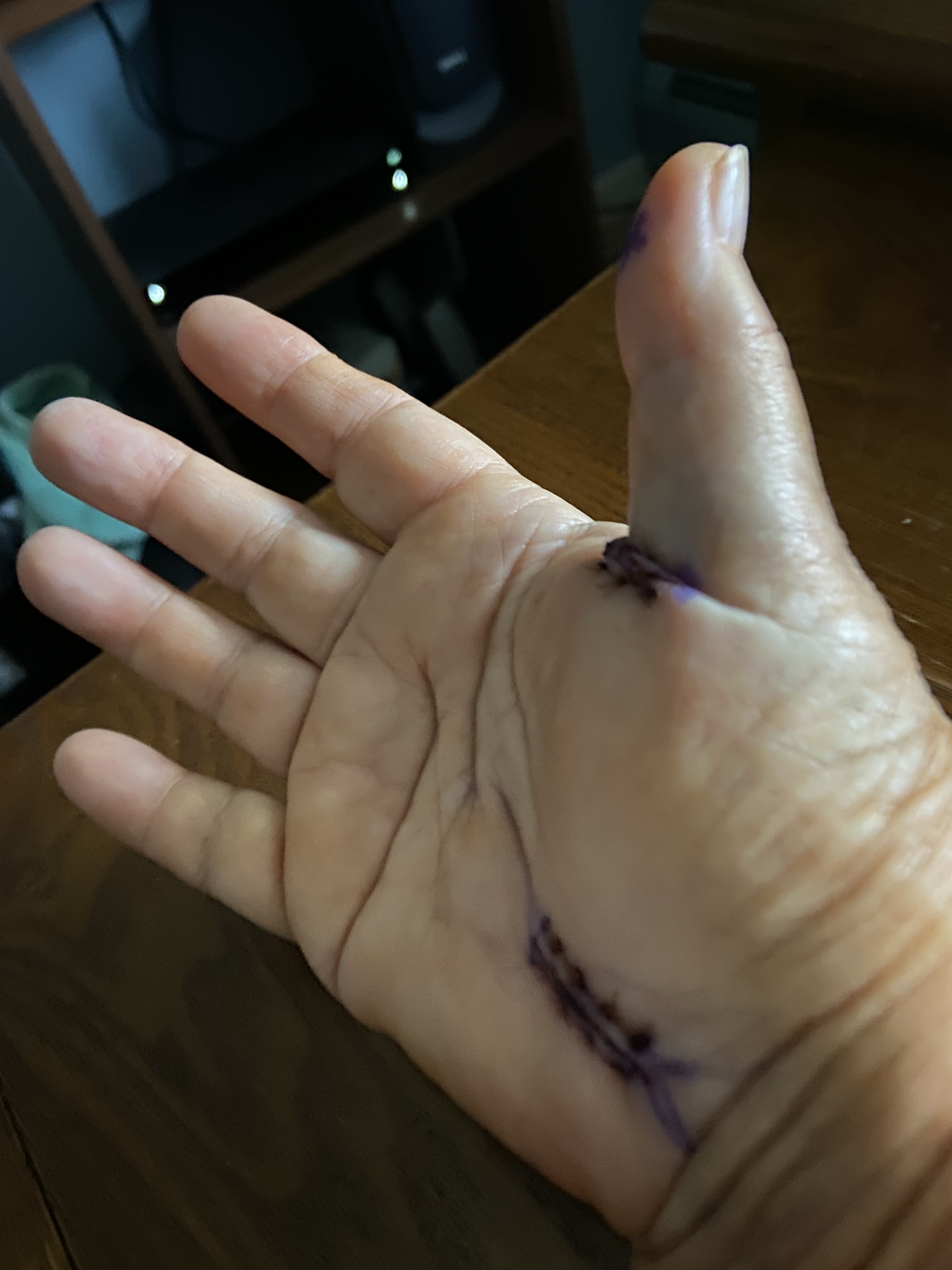 The surgery went well……they gave me the happy juice and I barely remember being wheeled out of the prep room…..and suddenly, I was waking up in recovery. My had was heavily bandaged, but there was zero pain. Later that evening, I started to ache a little as the numbing agent wore off and the next day I felt really badly bruised. But, the pain was FAR less than I expected (easily managed with Tylenol) and it was a far cry from the pain I had due to the carpal tunnel and trigger thumb conditions. Today, I still need the Tylenol, but it is getting better……the strange tingling and shocking sensations due to the nerves being cut is weird, though. I had minimal swelling – mostly just the lower palm where the incisions are, but again, not as bad as I expected. Ice packs have helped.