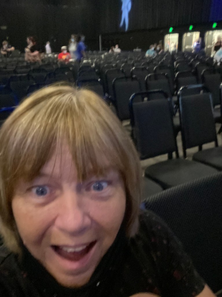 I took the shuttle over to the venue and went through the check-in process. Then we all waited in the lounge for the doors to open. I wasn’t going to have anything to drink or eat while I waited – just wait with excited anticipation! But, they had popcorn popping and the smell of it drove me absolutely bananas!!! LOL So, I got a box of popcorn and snacked while I waited.