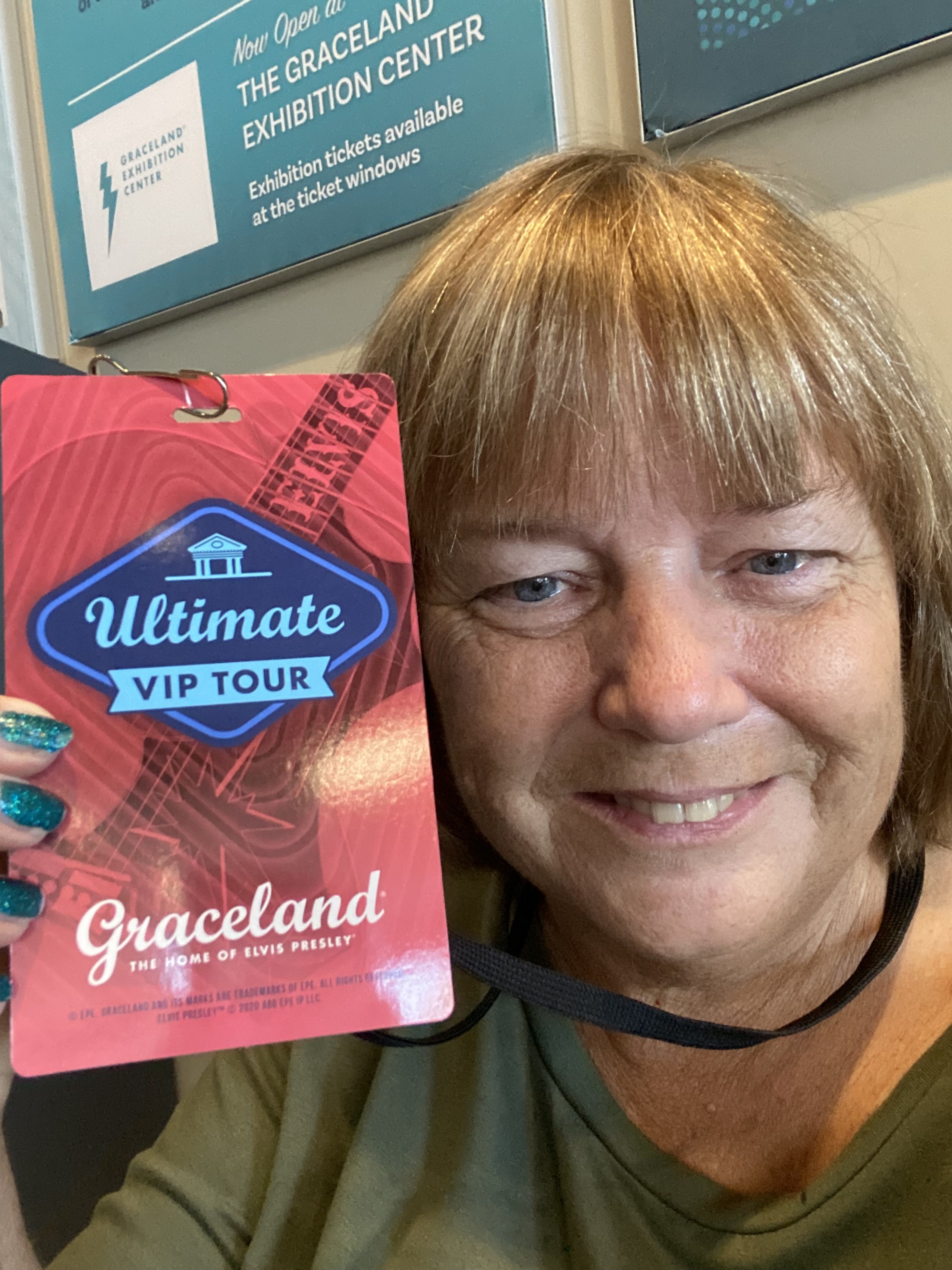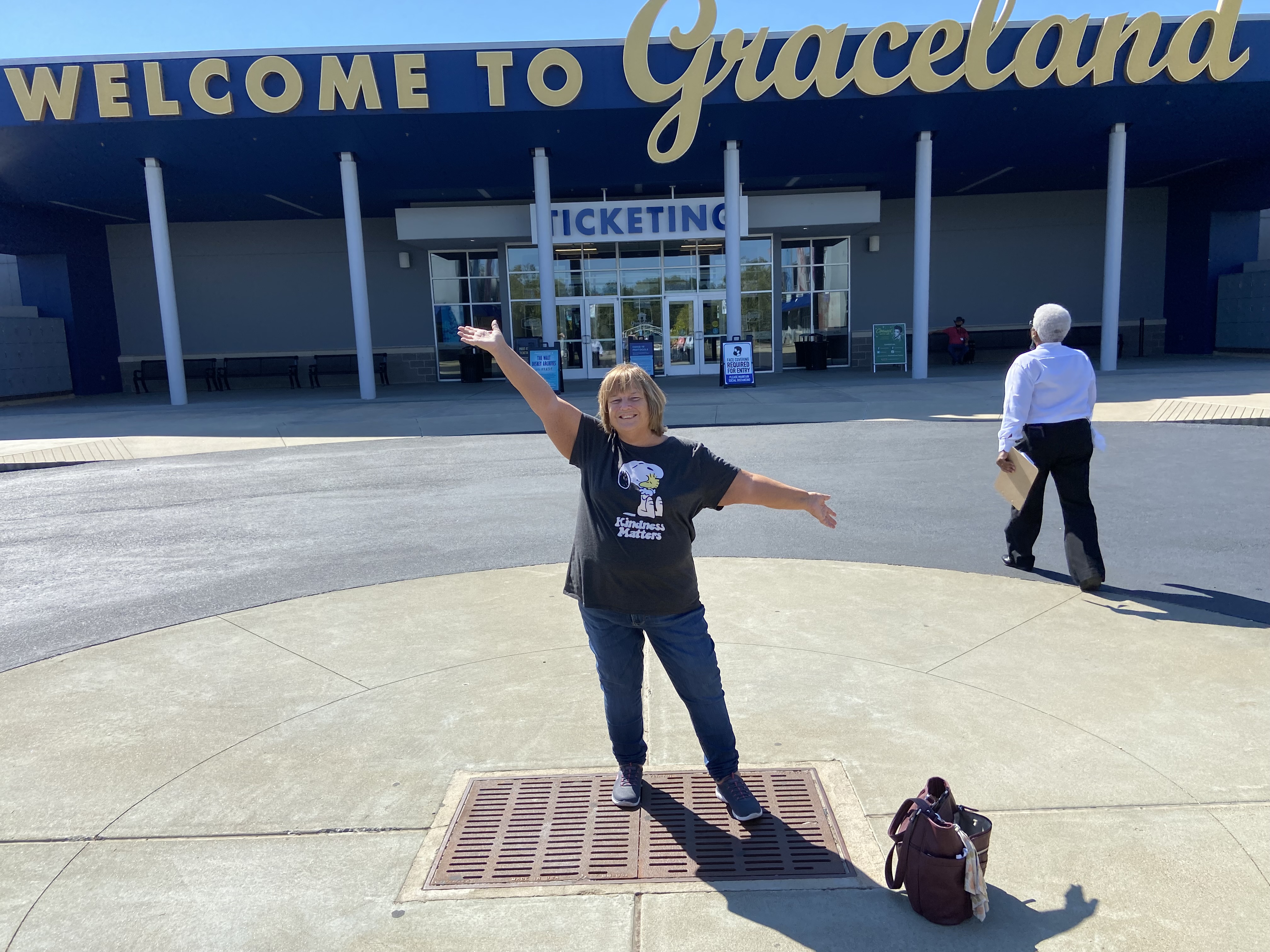 I arrived too early to check in, so I stowed my bag at the concierge desk and took the shuttle across to Graceland ticket center and entertainment complex. There was a Graceland employee offering to take people’s photos in front of the Welcome to Graceland sign…..so, I struck a pose announcing I finally made it to Graceland!!!