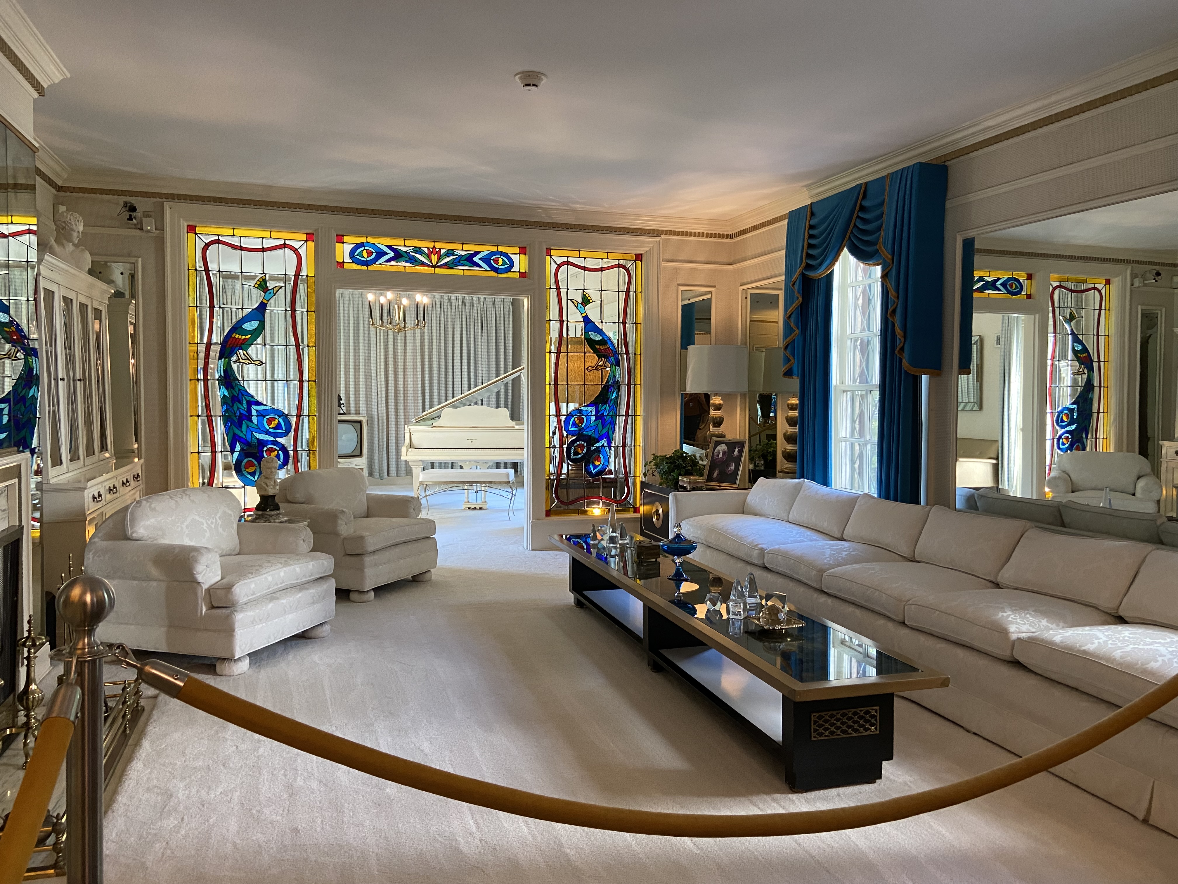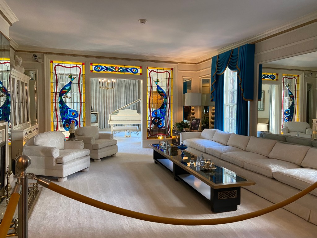 The peacock stained glass windows were a favorite of Elvis’ because he read that they represented beauty, dignity, and immortality. The mirrors were put on the walls to make the room look larger and to magnify the beauty of the peacocks.