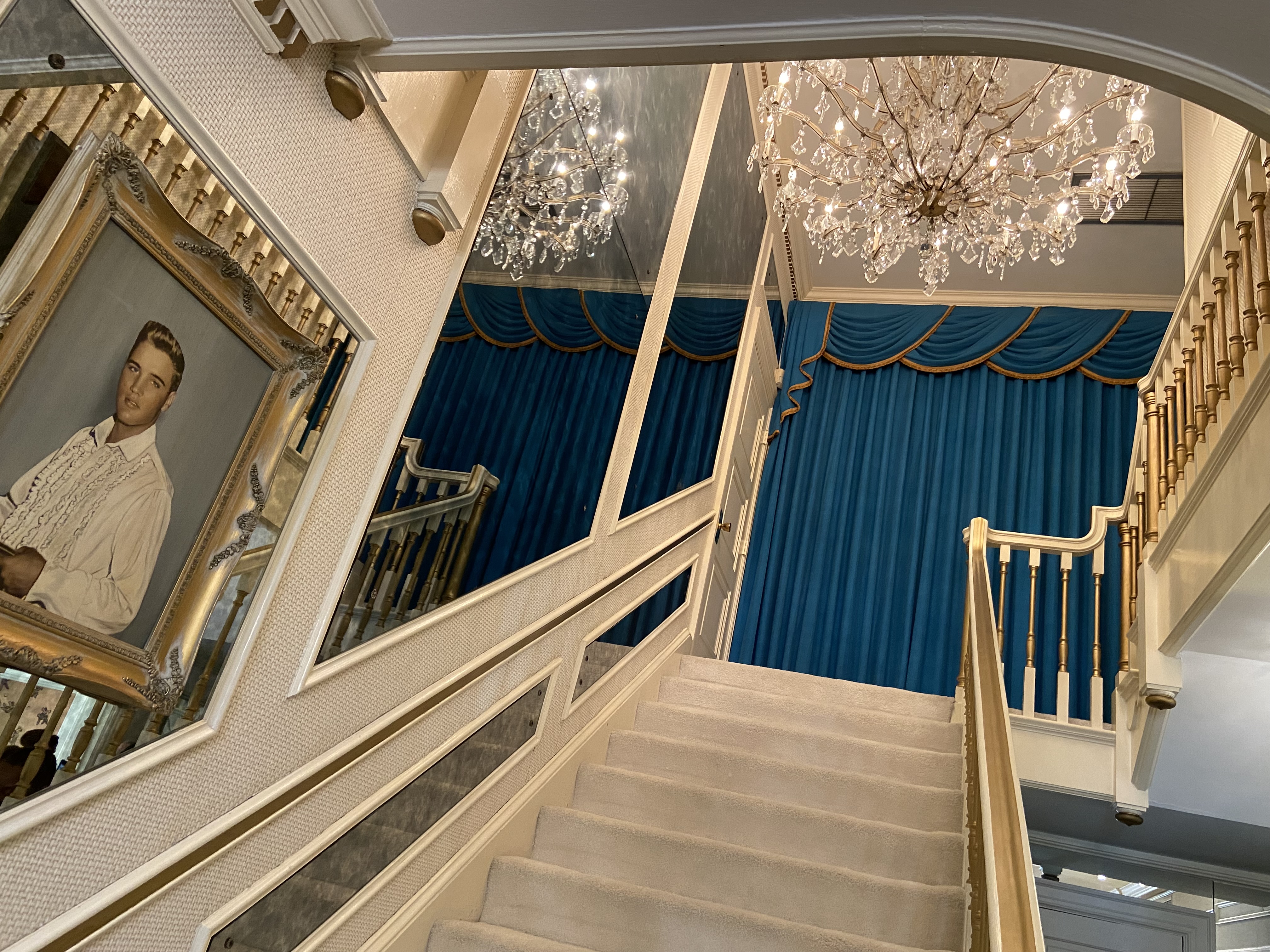 In the painting going up the stairs is of Elvis in his natural hair color, which was a sandy blonde.