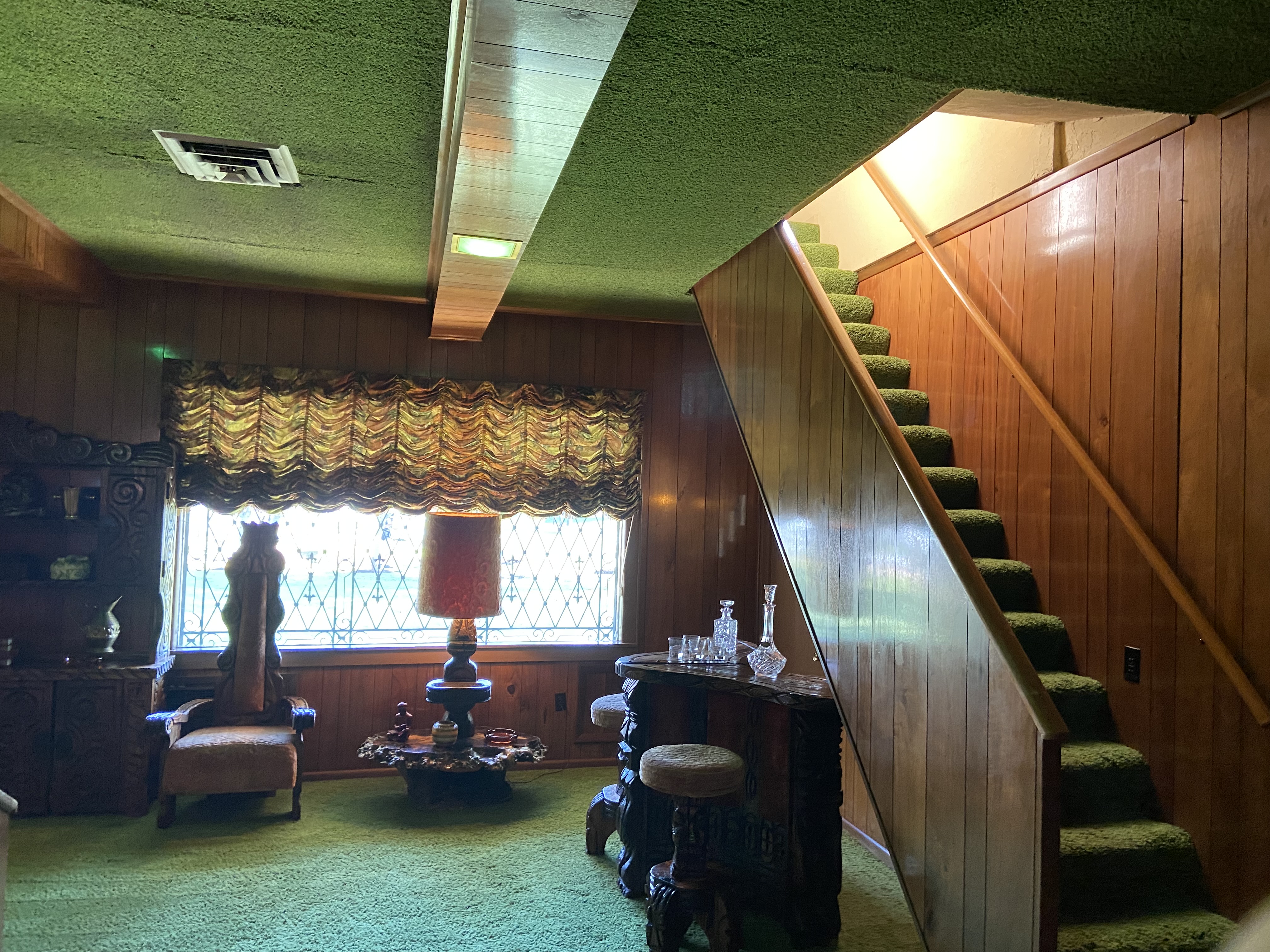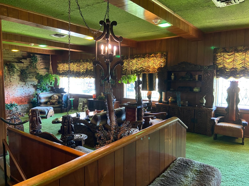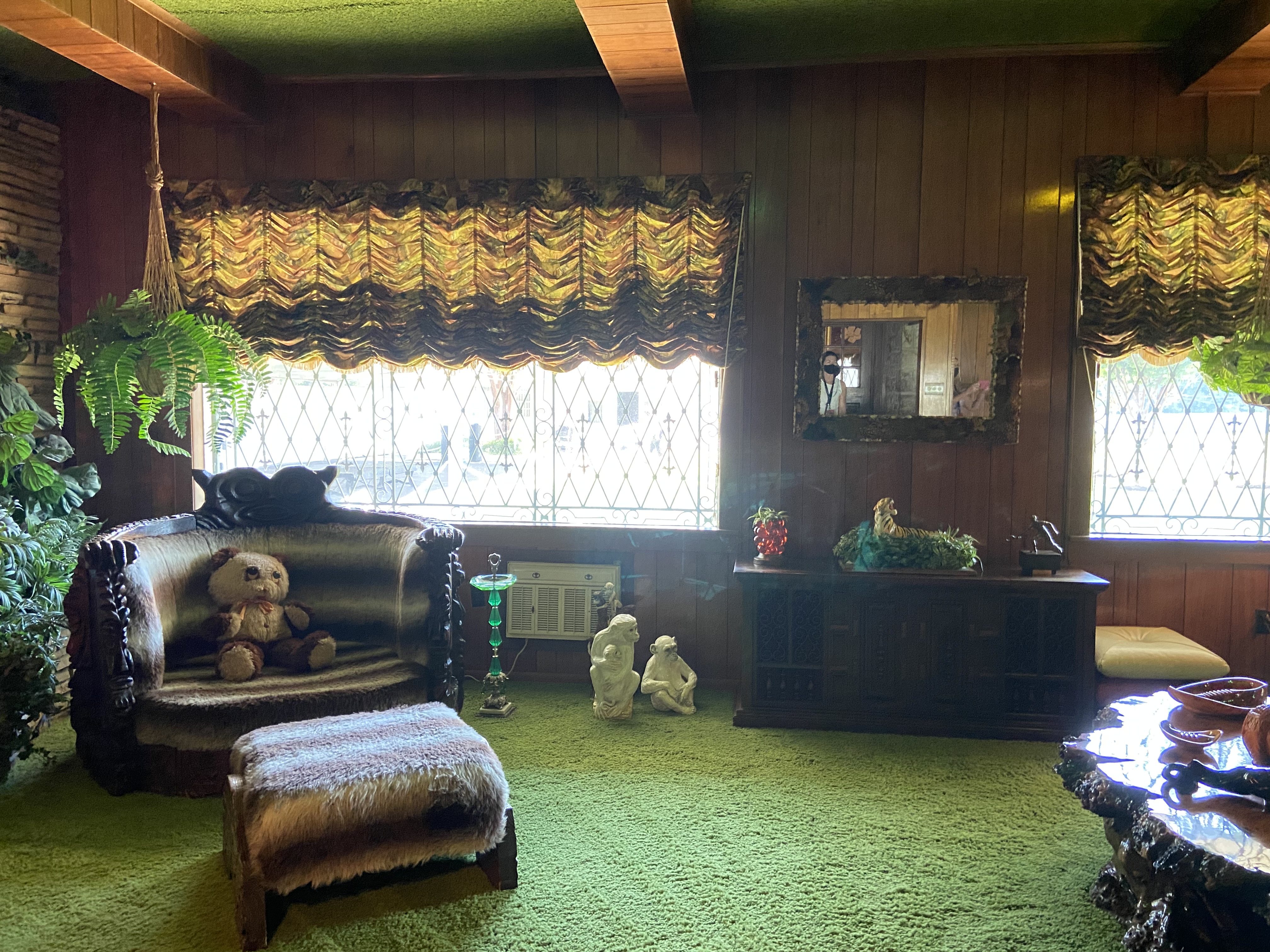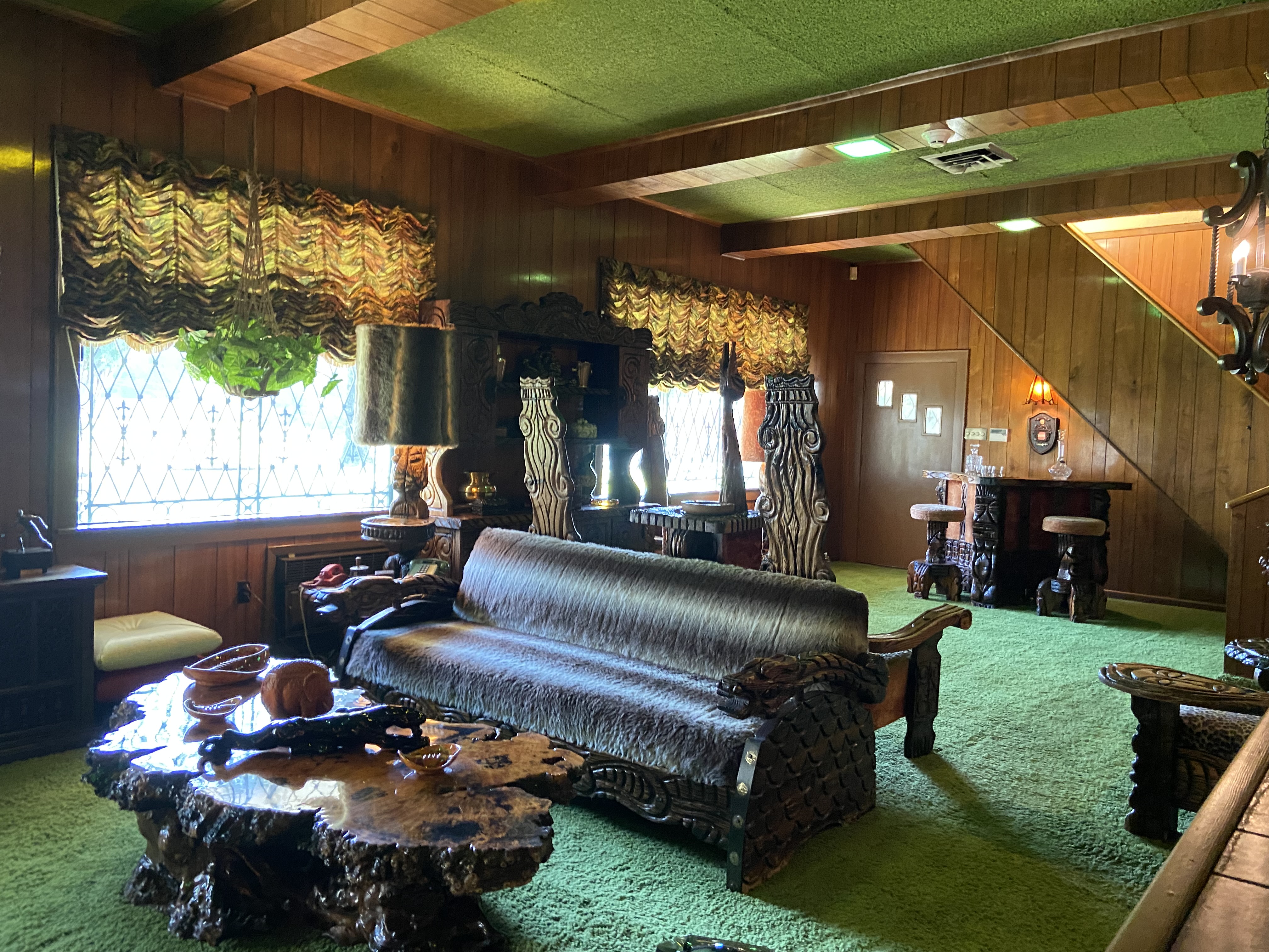 The next few photos are of what is known as the Jungle Room – it was Elvis’ den. The story is that his father Vernon came home one day and told Elvis about the ugliest furniture he ever saw….well, Elvis had to go look at it and fell in love with it, so he bought it…..Vernon still thought it was ugly! The room has green carpet on the floor and ceiling and a waterfall on the wall to the far left – it is not in operation, at this time.