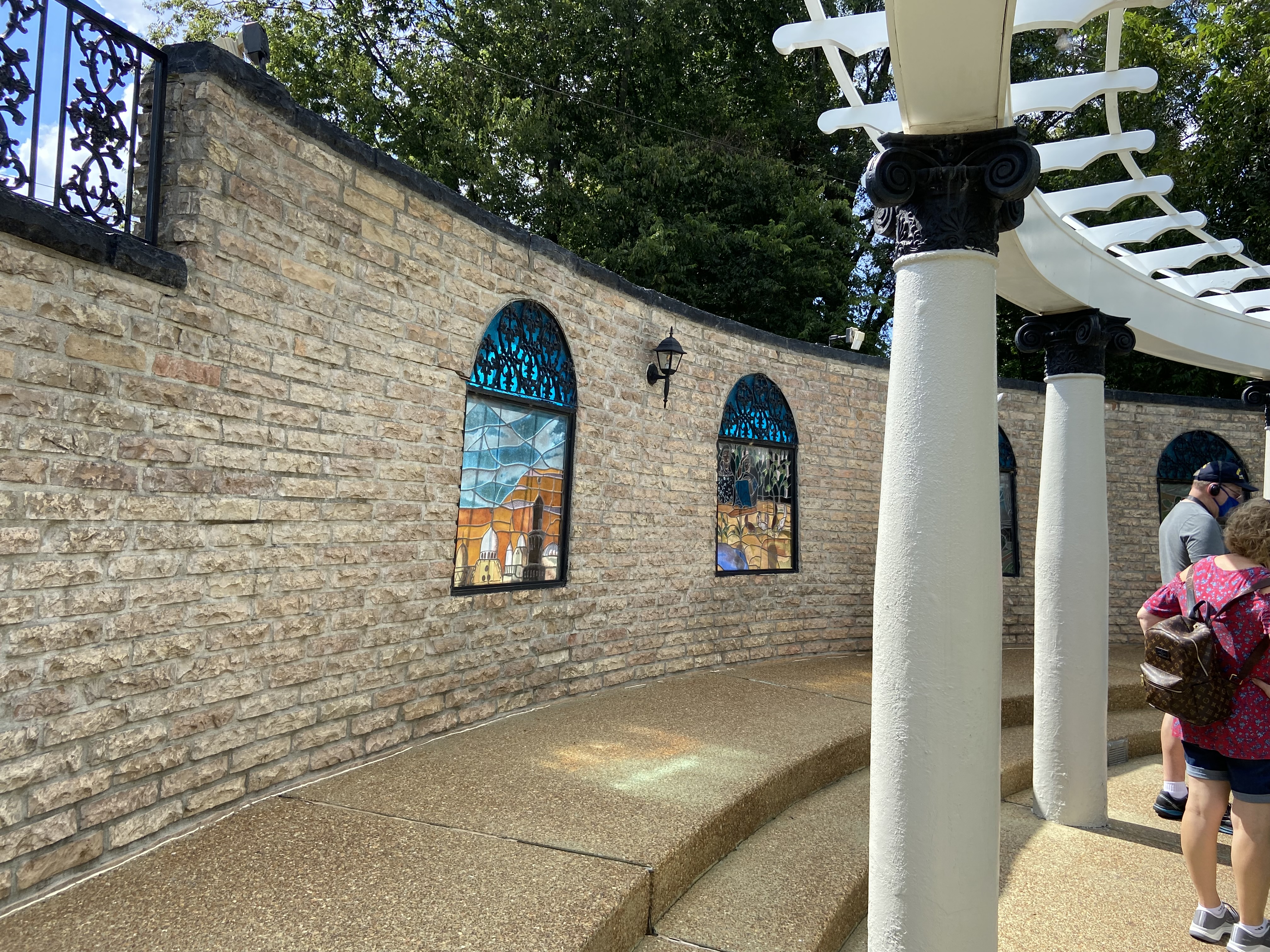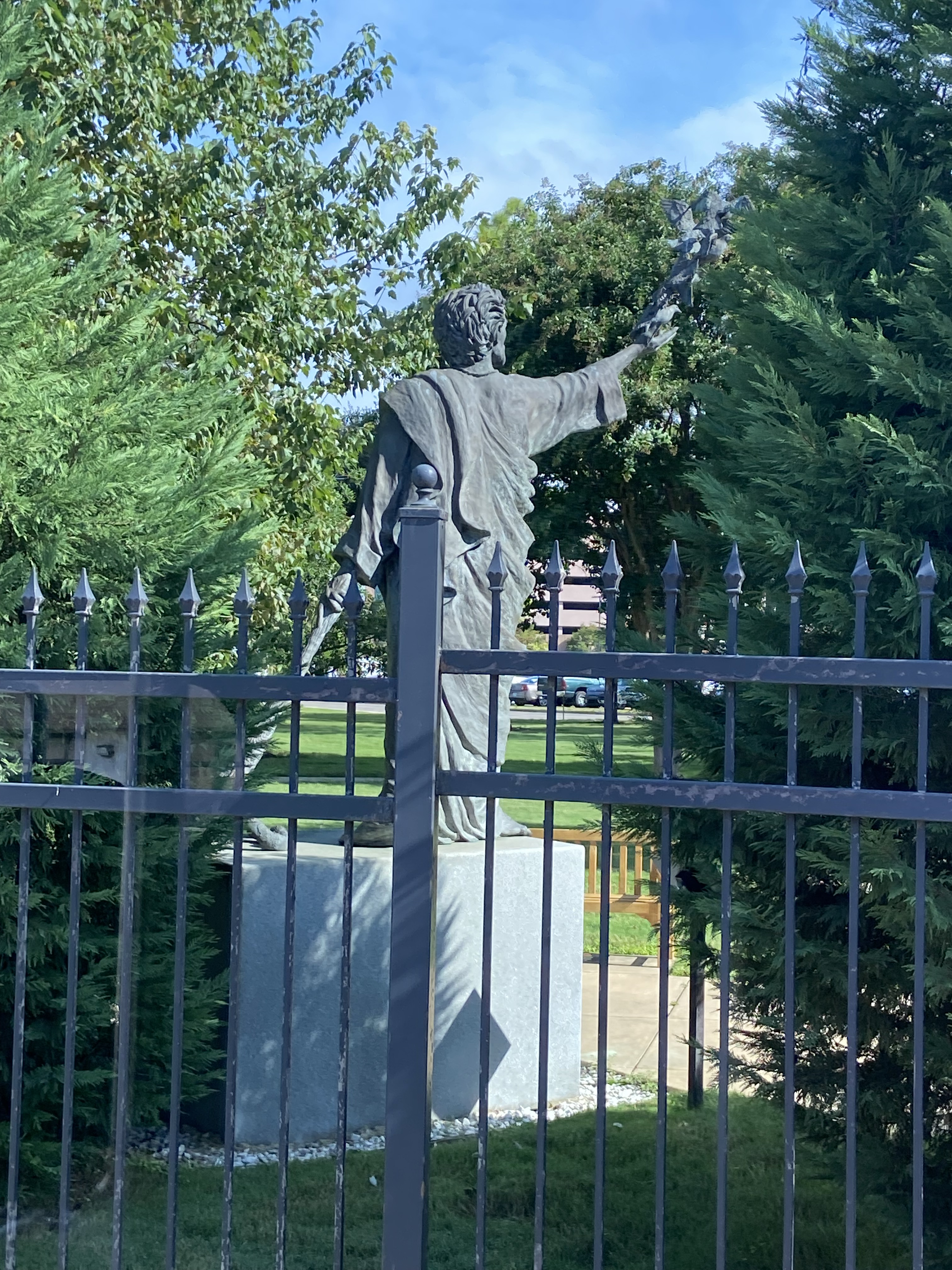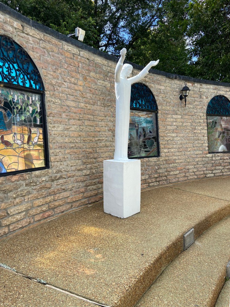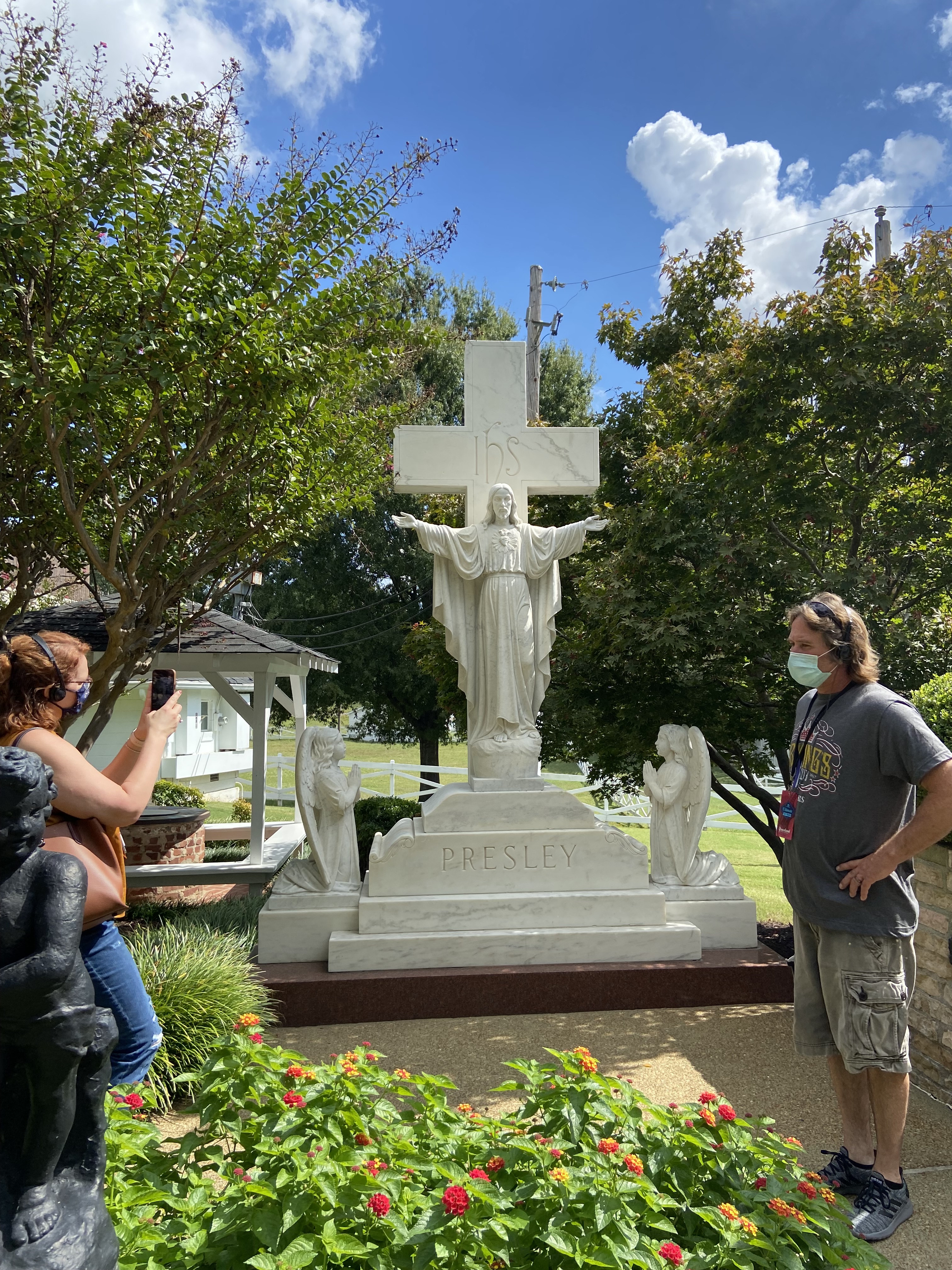 There was another statue on the property….it is located up on top of a big hill that overlooks the house and church buildings. It is called “Becoming” and it depicts Elvis at 11 sitting on the crate in the hardware store holding his first guitar and the entertainer Elvis behind him – together, they represent where he began and what he became. There were so very many steps to get up to the top of the hill that I didn’t dare try to climb them with my bad knee…….I was disappointed I didn’t get to see it in person, but I did find these photos of it on the internet…….very impressive and emotional!