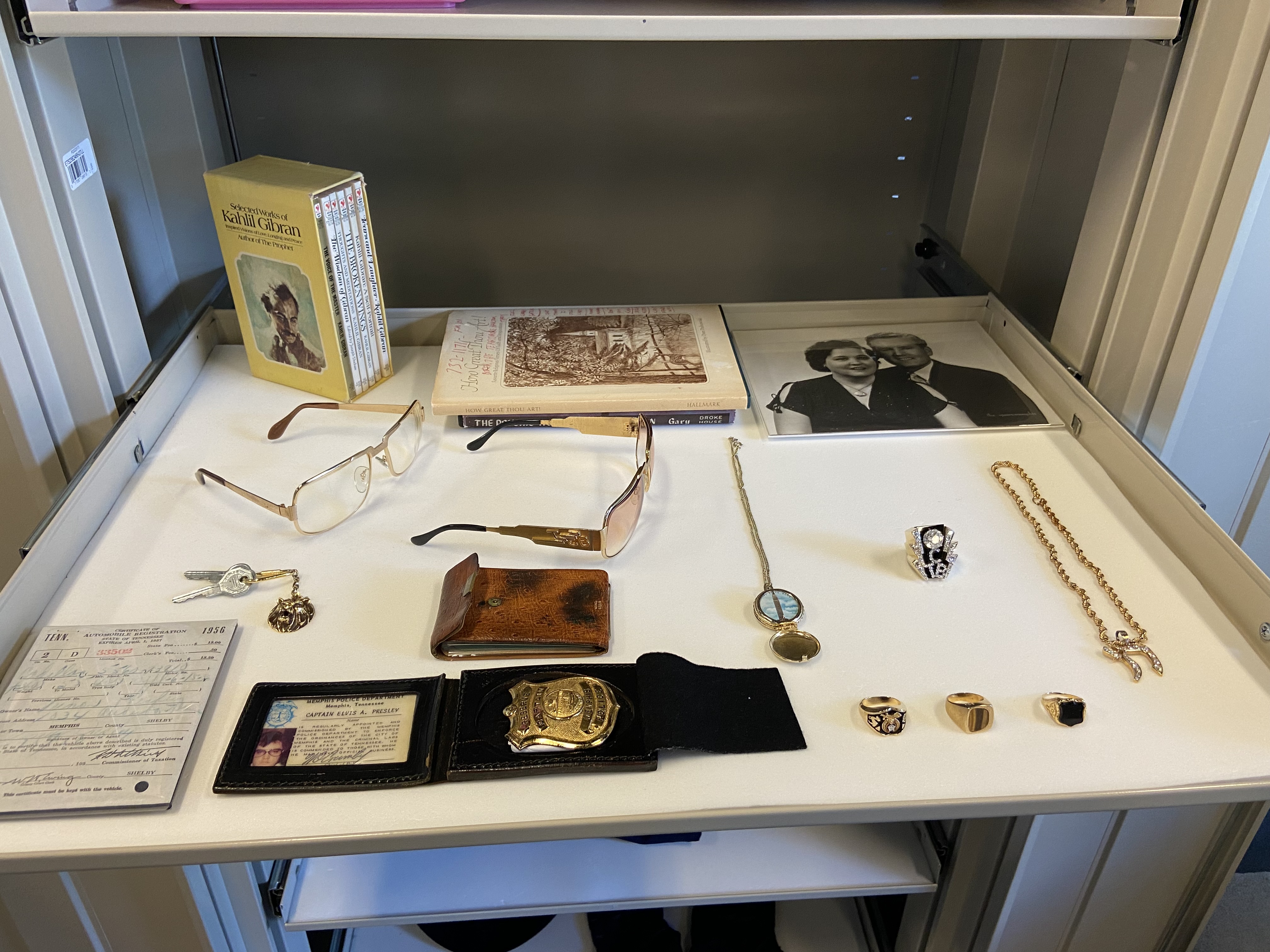 Rings, glasses, wallet, his Memphis police badge (he was an actual police officer and had authority to arrest people, but never did – he did, however, routinely pull people over for speeding or other traffic violations to give them a lecture and an autographed photo – hehehe), and a collection of Kahlil Gibran books (his favorite author – mine, too, at that time).