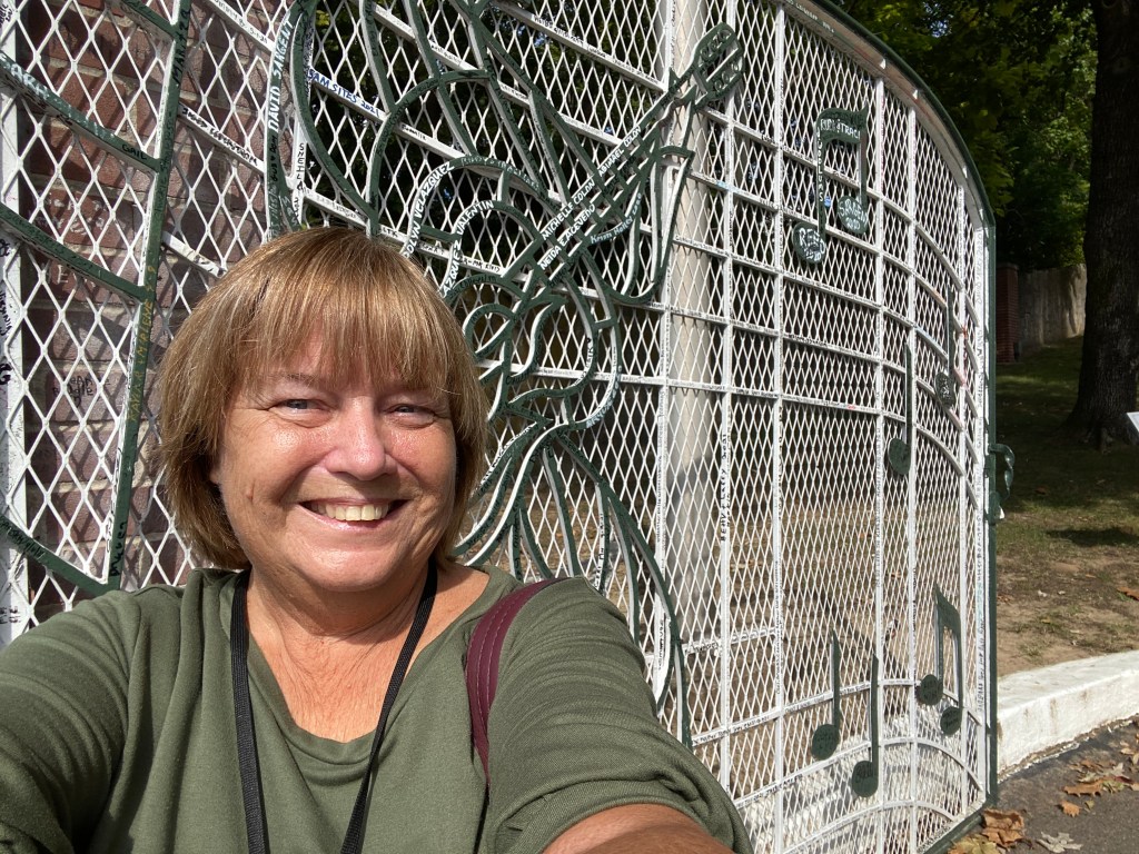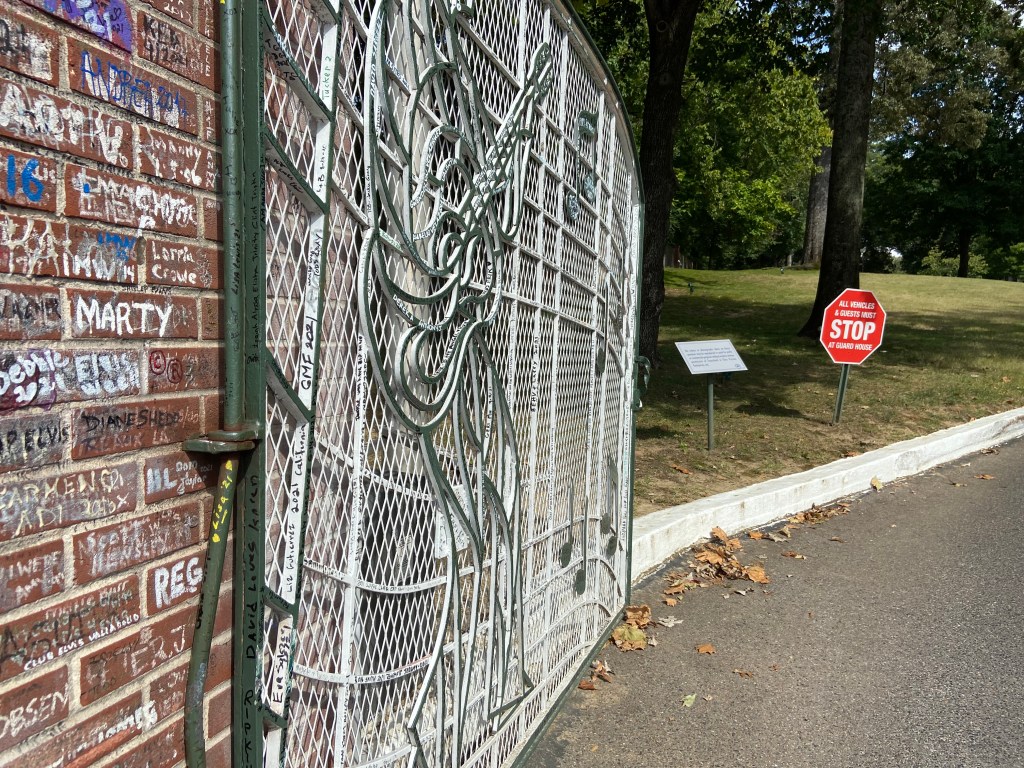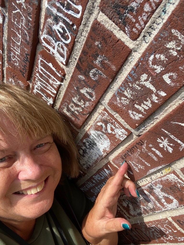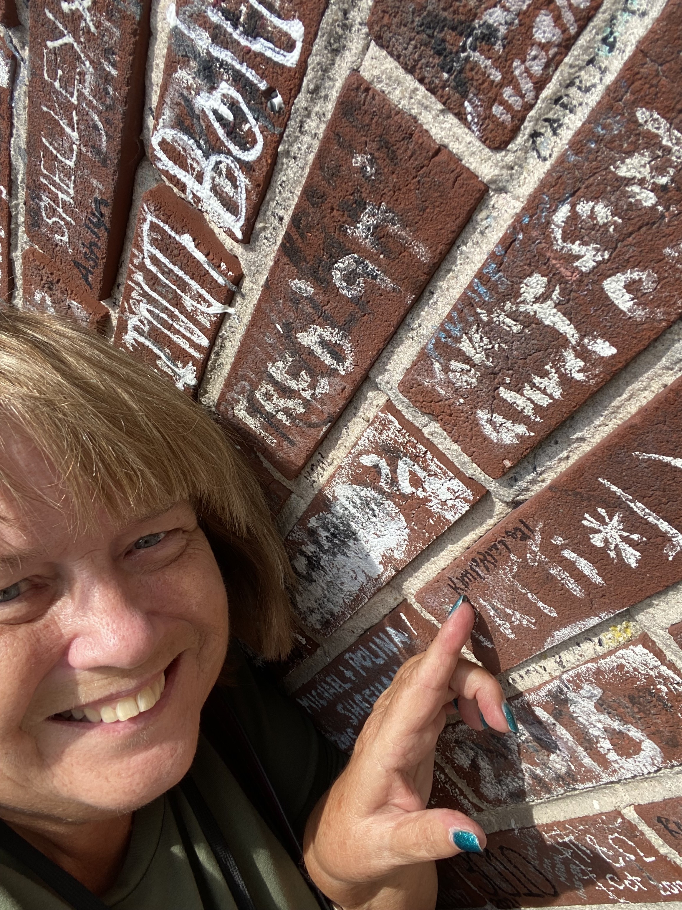After our tour was over, I walked back across the street to the front entrance of Graceland — those famous gates……I signed my name on one of the bricks and took a few selfies with the gates.