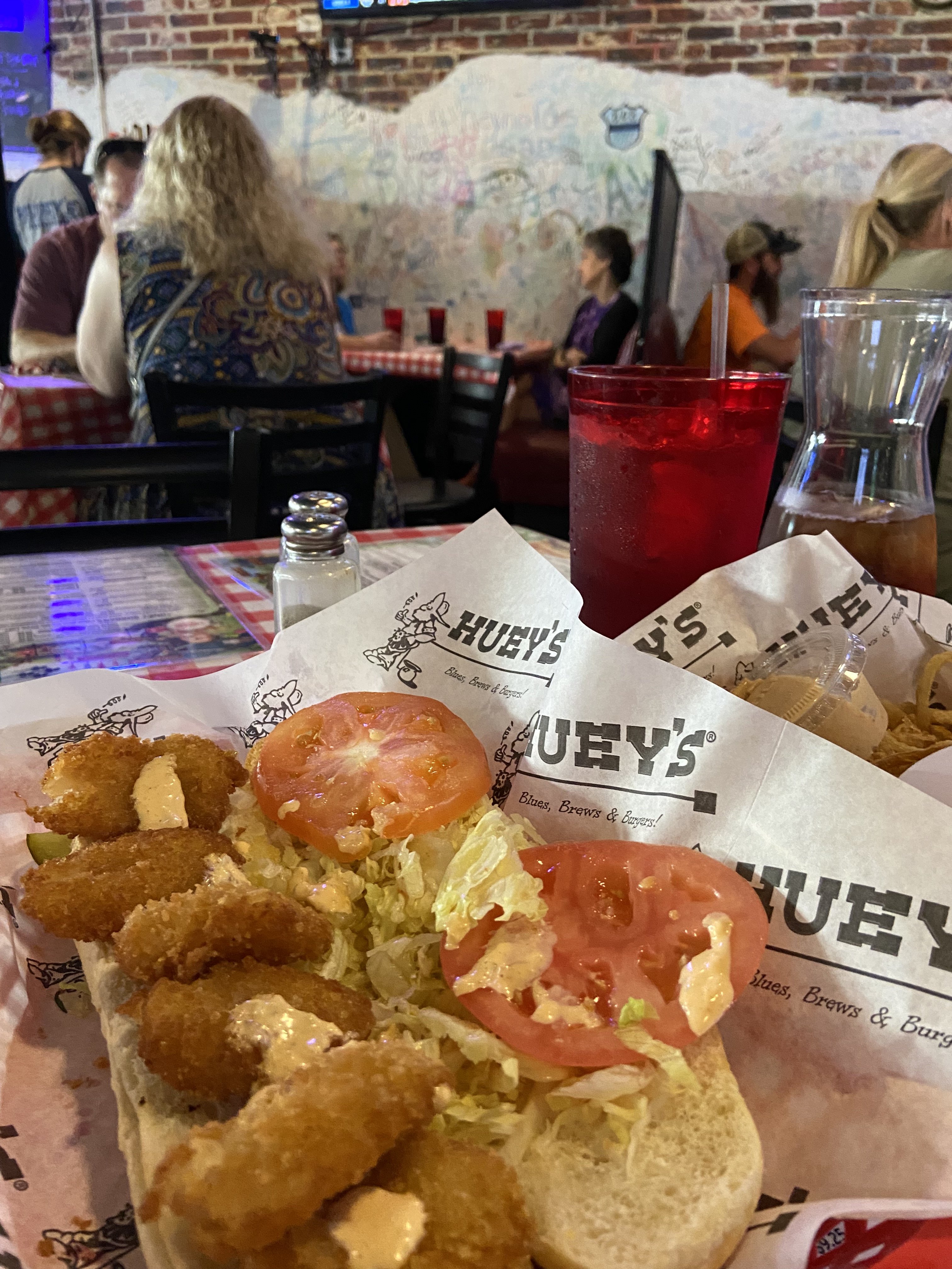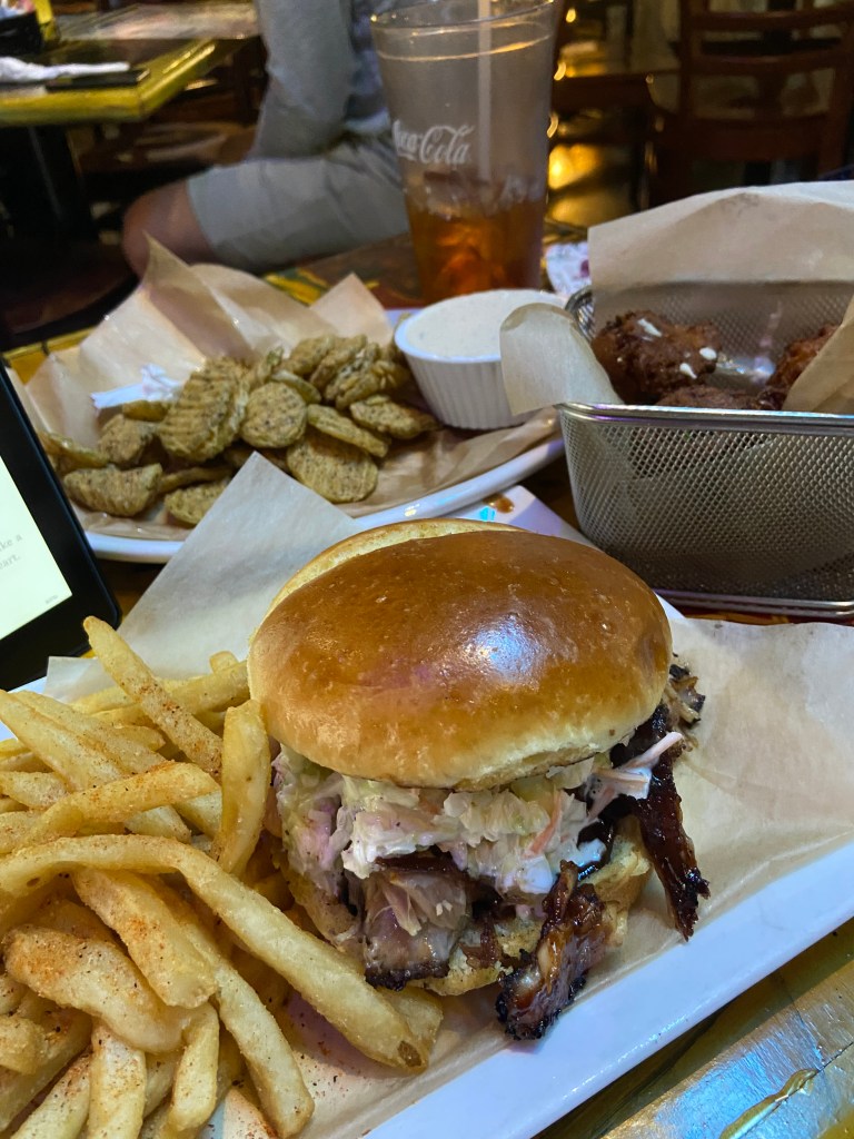 I had the fried dill pickles, the rib sandwich which was meat stripped from slow cooked ribs and topped with slaw, seasoned fries, sweet onion hush puppies, and sweet tea. It was amazing!!! Sooooo good!!! I think Marlowe’s ribs were just a tad better, but the ribs in both places were the best I’ve ever had and it would be hard for me to prove my theory that one “might” be just a bit better!