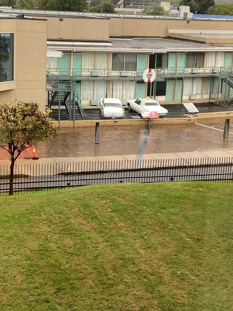 The view from a window next to the bathroom where James Earl Ray stood looking across the street to the balcony where Martin Luther King stood when he was shot.