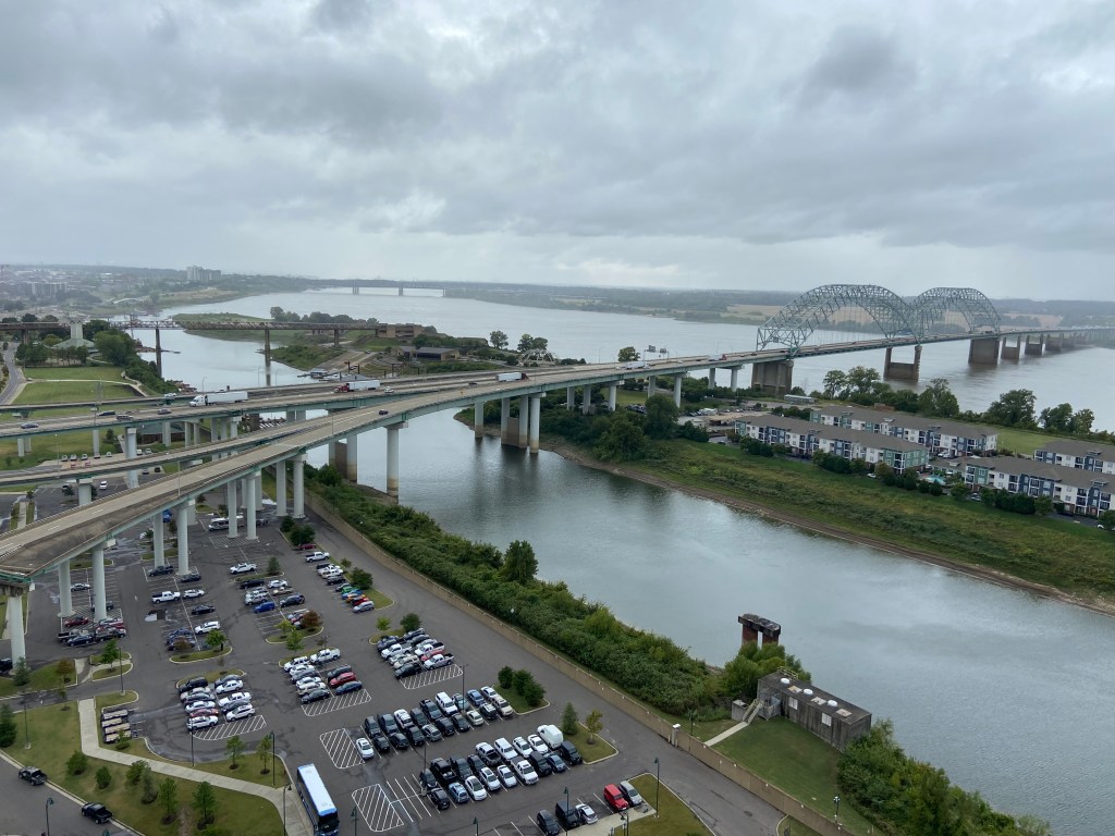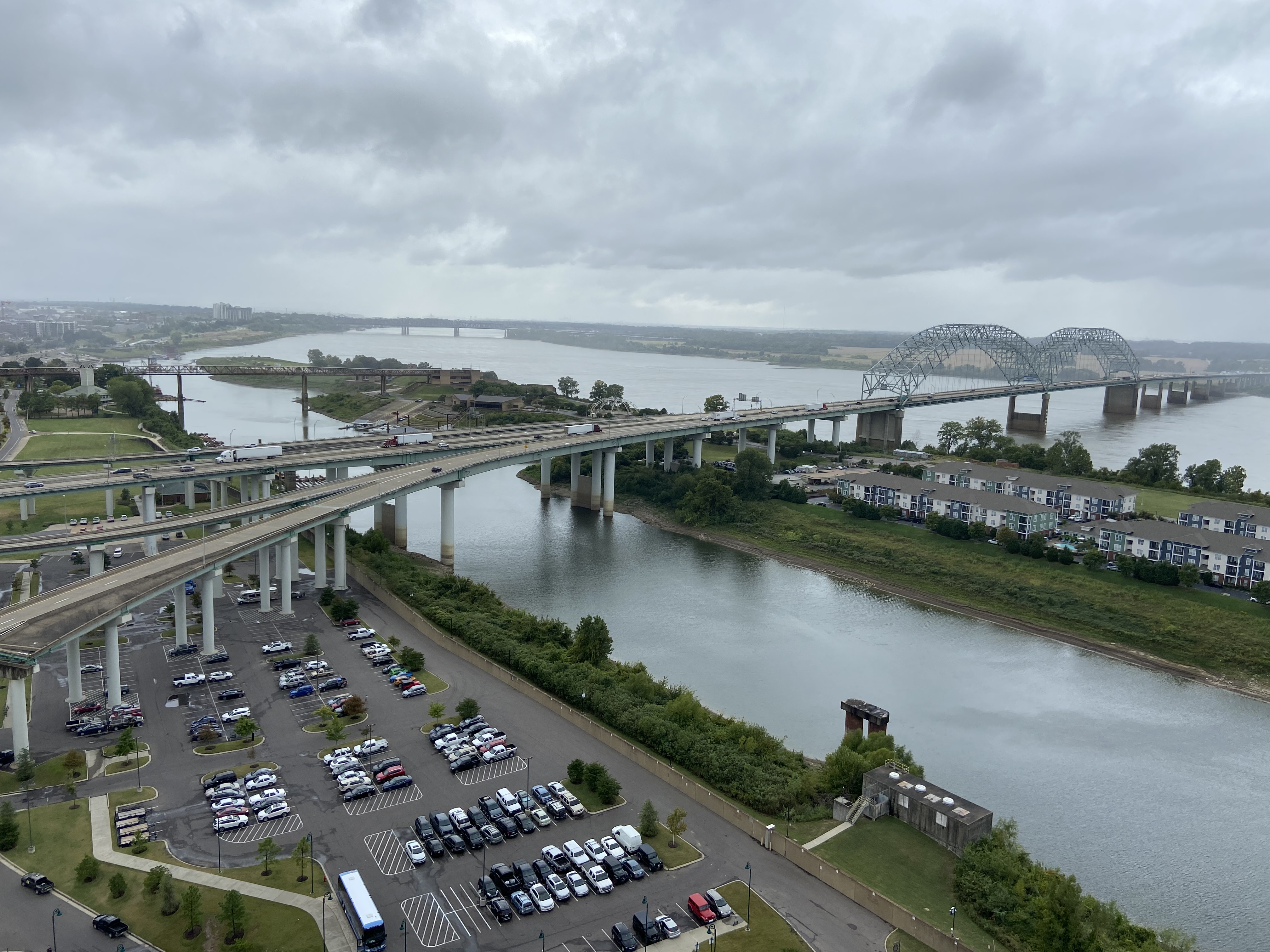 I asked how to get to the observation deck and I was directed to the elevator — he said “if you miss it, you’re probably blind because it is the tallest free standing elevator in the world!!! I got on the elevator – that you could see out of to overlook all the cabins and camping areas of the lodge on the way up – and walked out onto the observation deck. The views of Memphis and the Mississippi River from up there were amazing……too bad it was raining and cloudy – it could have been even more incredible!!!