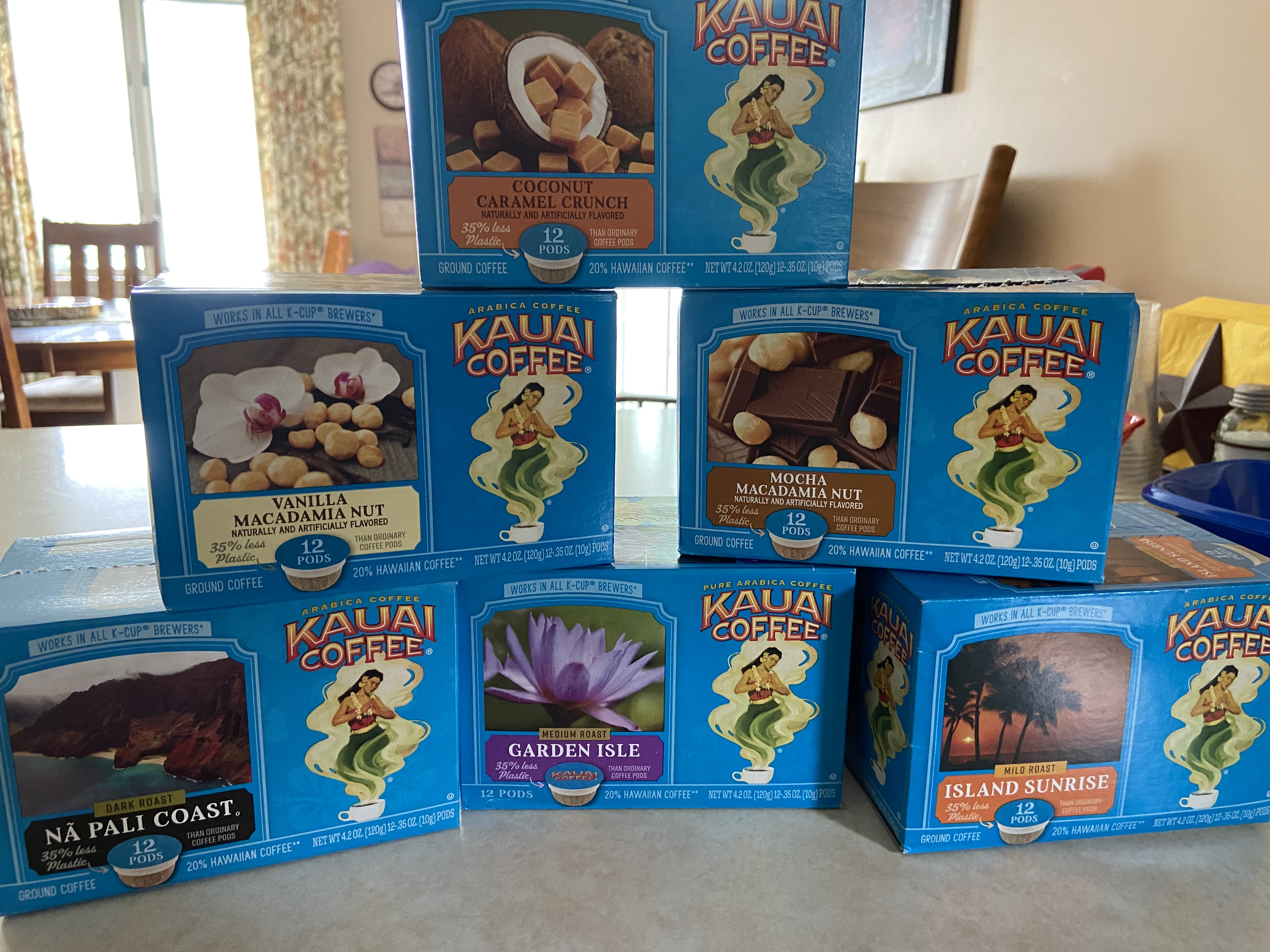 The day I got my package, I set up the Keurig, ran a couple cleaning batches of clear water through it, and chose the Kauai Mocha Macadamia Nut one for my first cup. WOW — LOVED IT!!! The next day, I tried the Kona Blend…..it is a medium roast…..sooooo good!!! And, today….as I’m writing this, in fact, I’m enjoying a cup of the Kauai Na Pali Coast…..a dark roast…..and I may have a second cup.
