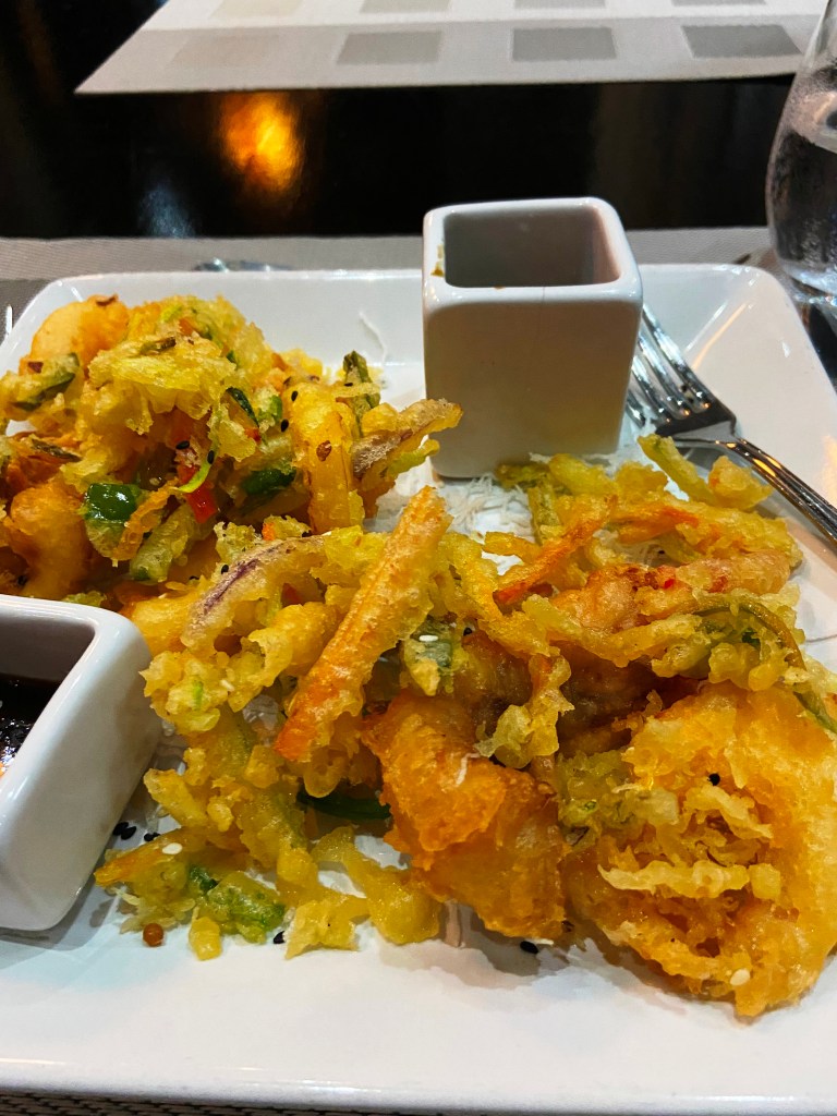 Japanese main course — tempura shrimp, fish, and veggies — YUM!!!