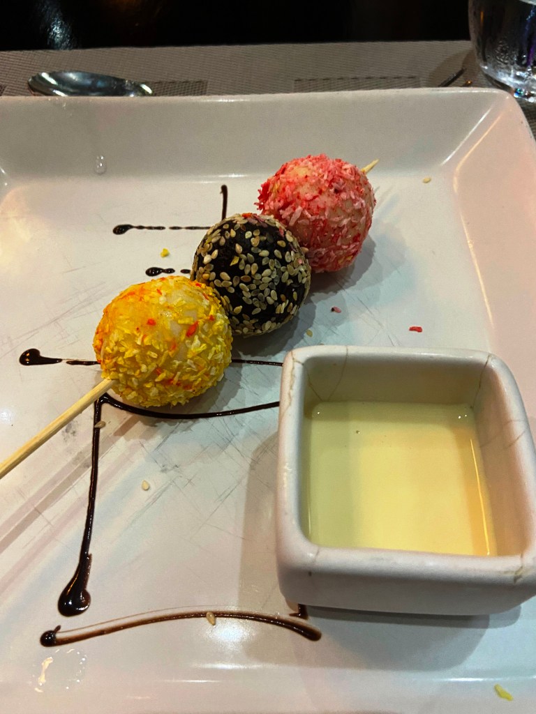 Japanese dessert – truffle variety with a coconut dipping sauce