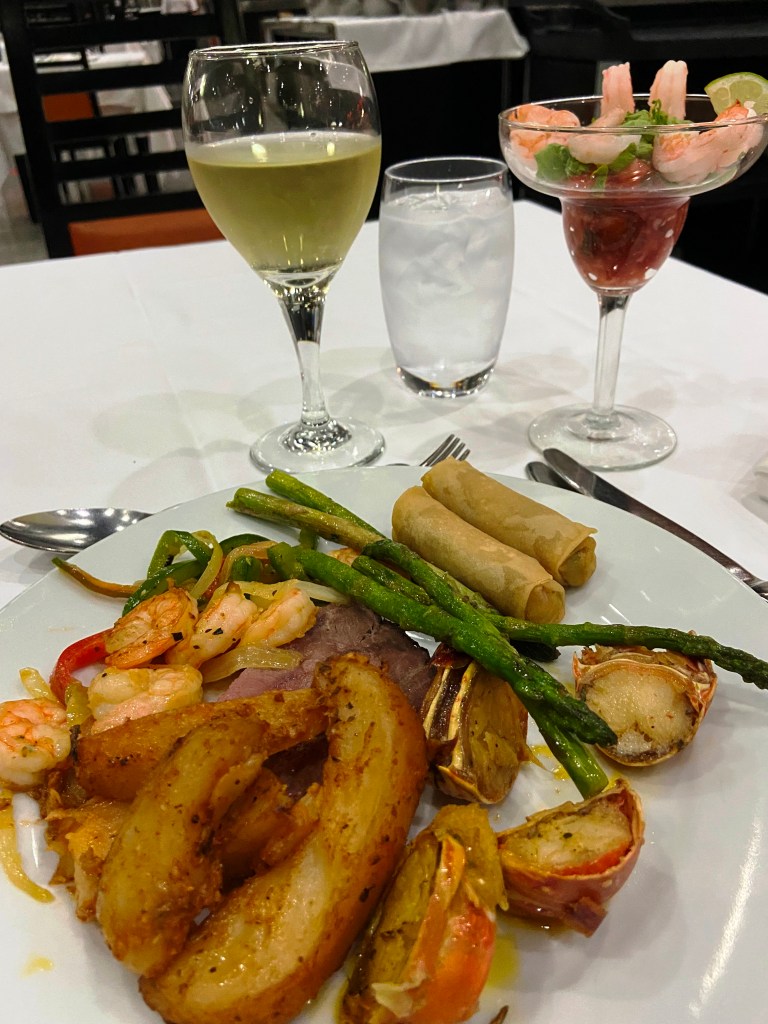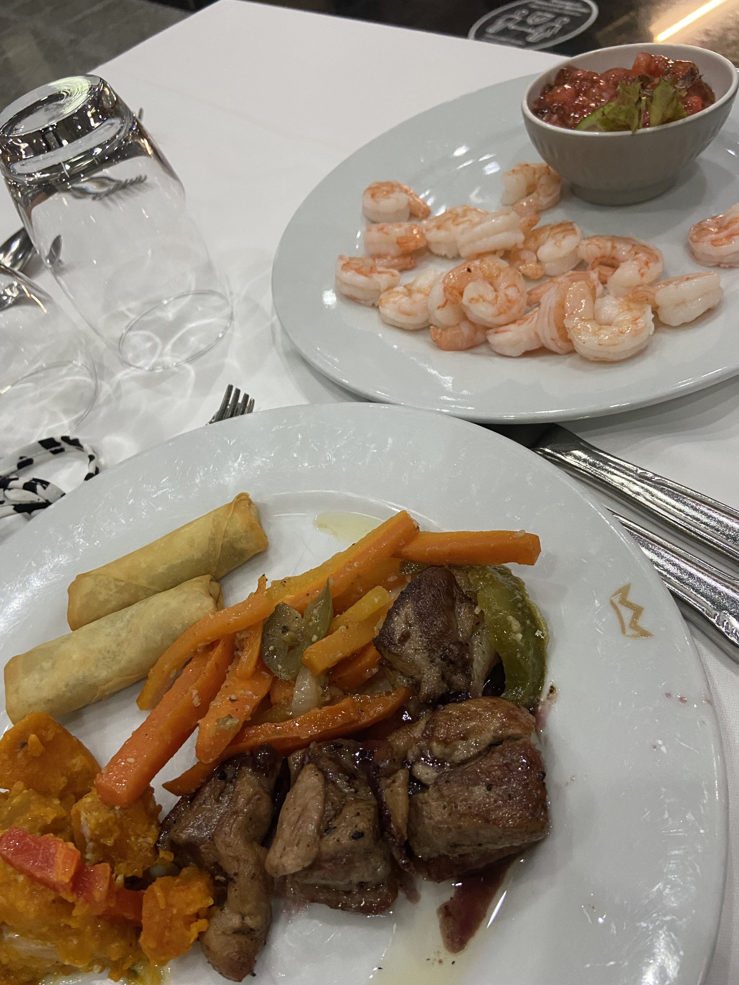 Shrimp, lobster, roast beef, spring rolls, and veggies from the buffet