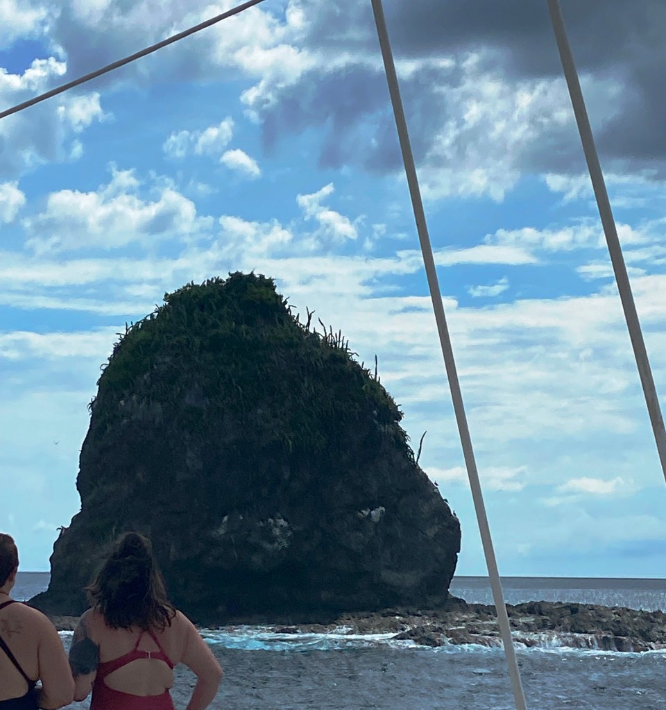 When we got off the bus and to the beach, we found there were no docks……our catamaran was that one with the sail masts about center in the photo above. The dingy you see heading towards the beach was how we were to get to the catamaran……it was returning from taking the first group out to the catamaran. It could not, of course, come up onto the beach. So, we had to walk out into the water about knee deep (this is the Pacific Ocean, BTW) and climb up into the dingy!!! Excuse me??? If anyone got video of me trying to get into that dingy, I’m sure they’ll win BIG prize money on any funny video contest they enter it in!!! I’m short and not all that flexible, anymore……so, here I am, trying my darnedest to swing my leg up over the edge of the dingy…..which is about waist high….with no success! It seemed impossible! Until the guy behind me offered to help – I told him that if I could just get my leg up that high, I might be OK, so he lifted my leg up and over the edge and then kept me from losing my balance as I got the rest of me in! My hero!!! He also kindly helped a couple other “women of a certain age” get in, as well. You had to see this…..it was hysterical!!! Getting into the catamaran from the dingy and then back out of the dingy when we returned was much easier……and not as funny!