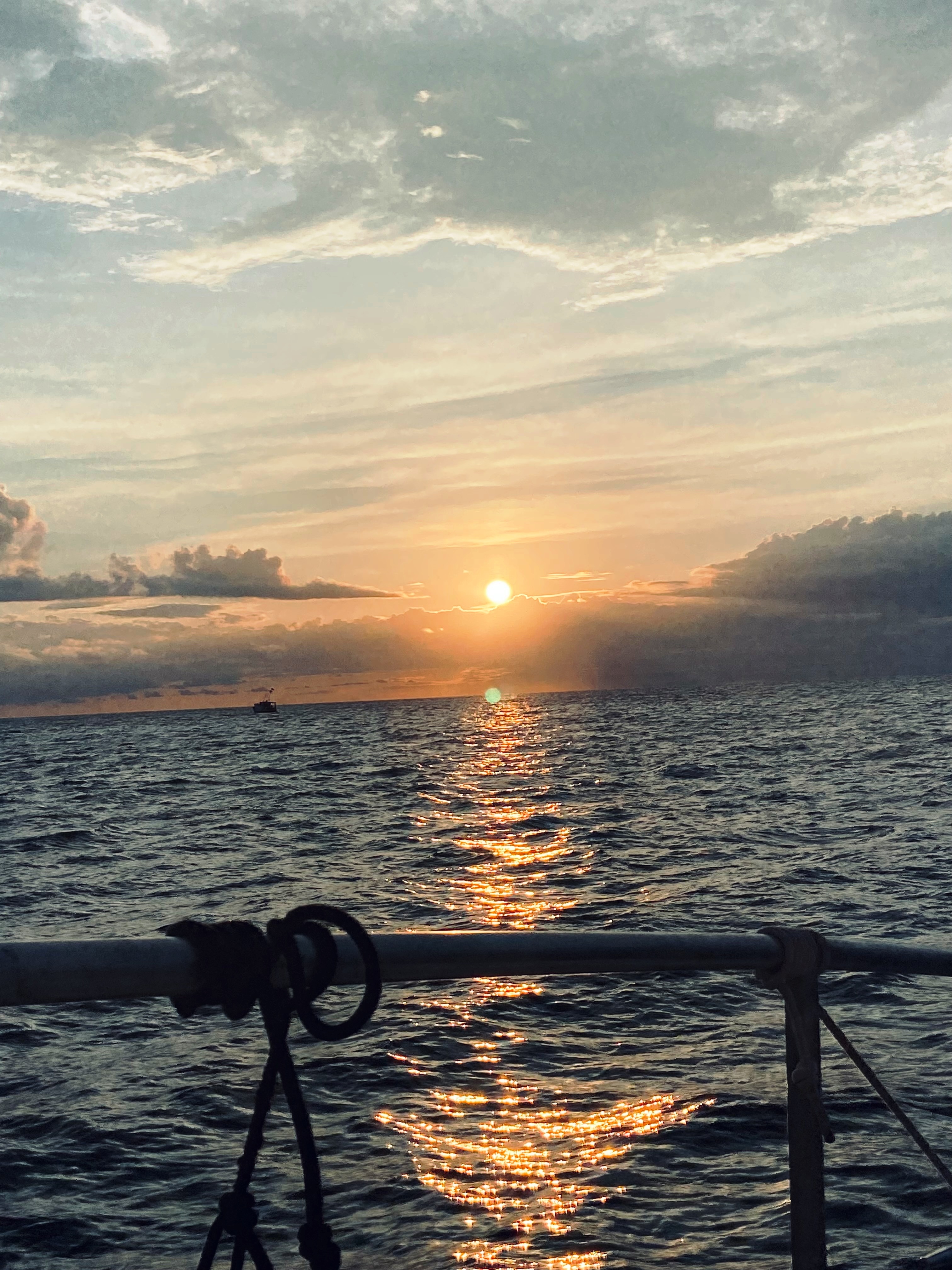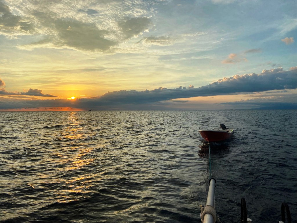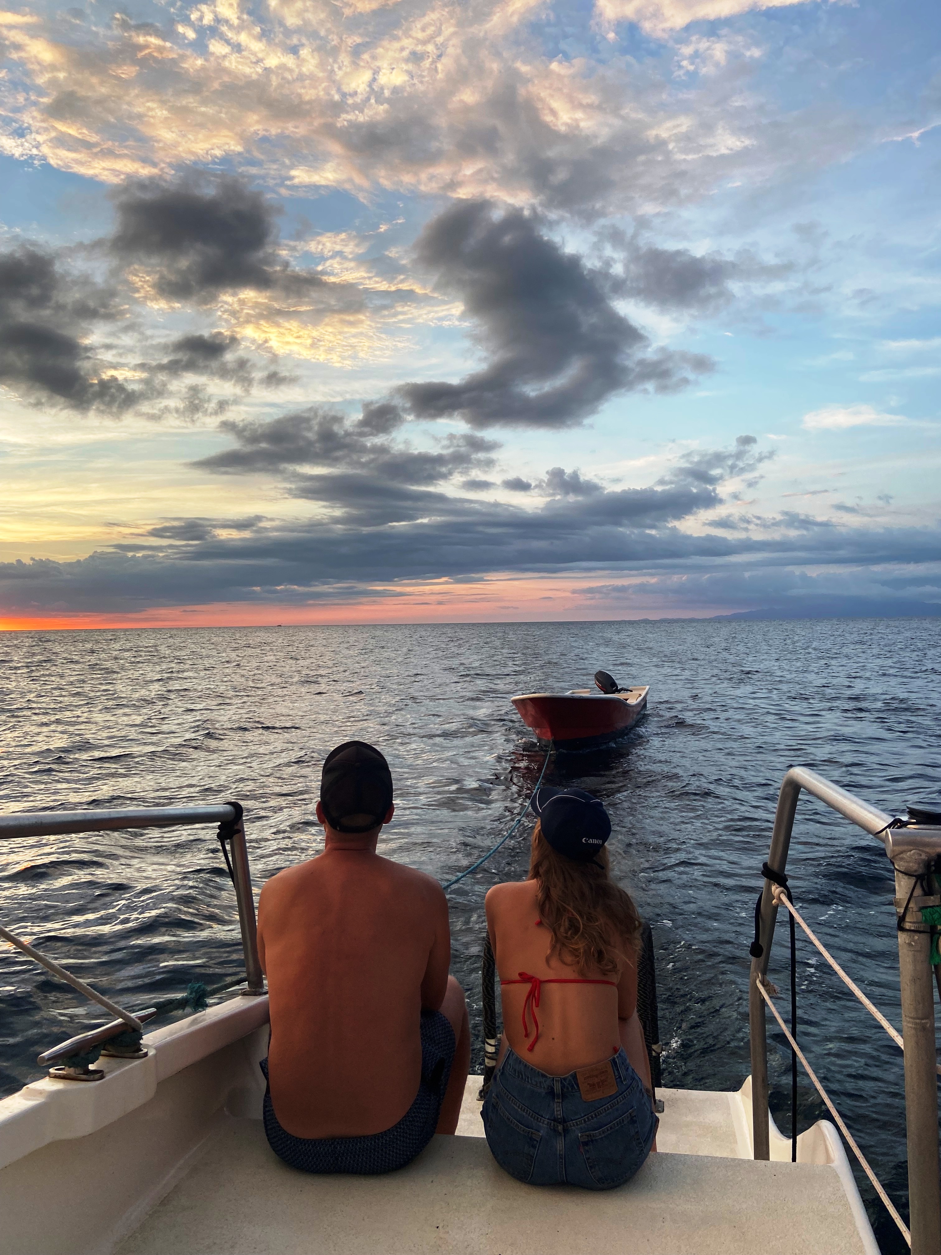 I really like this photo, too — our dingy being pulled behind and two passengers watching the sunset