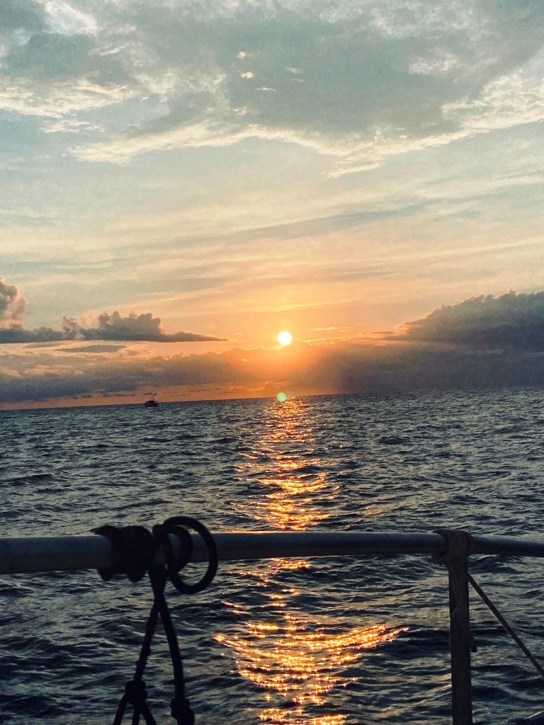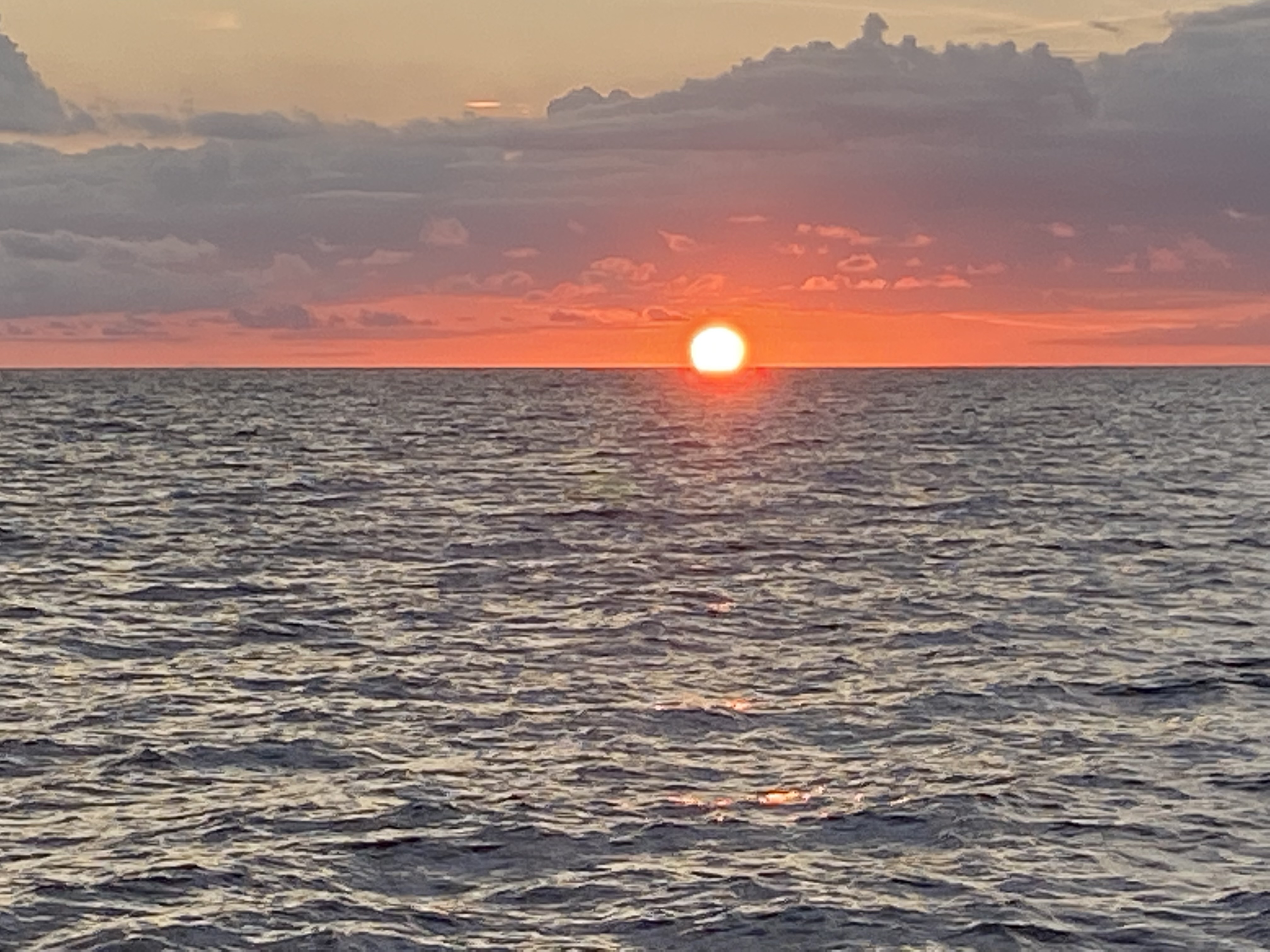 And, then, the sun started to set and it was SPECTACULAR!!! Here we were out on the Pacific Ocean in on a catamaran powered by the wind, watching a huge red ball of fire sink into the horizon……life just doesn’t get any better than that!!!