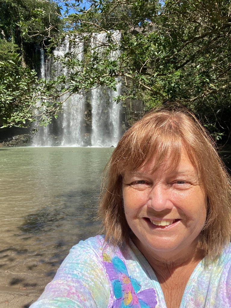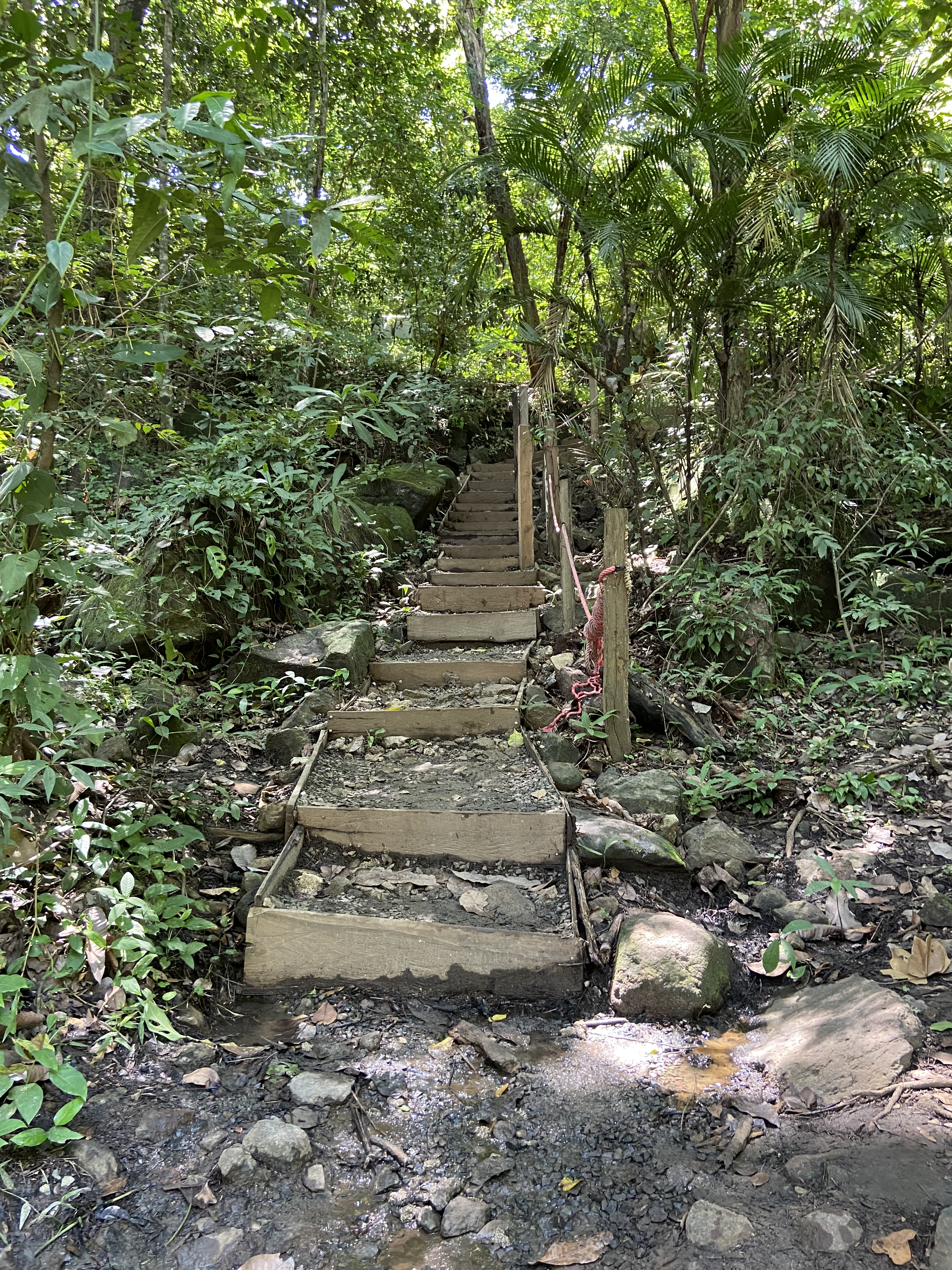 But……there was a bit of a problem with this stop……to get to the waterfall, you have to go down a very long, windy, uneven, awkward, set of steps with just a rope attached to some posts for a railing. Some of the steps were a few inches high, some were about knee high on me……some were level, some slanted drastically……..some had stones, some gravel, some dirt……all uneven surfaces!!! I looked at them from the top and considered skipping getting to see the waterfall – I was sure it was not going to be a pleasant hike down or back up! But…..I do love waterfalls and was told this one was especially amazing! So, I went down — it wasn’t easy, but I did it and enjoyed the views and was glad I did it. Then, I decided I should head back up before everyone else because I knew it was going to be a challenge……well, I got to the first step that was a bit high and it was before the rope started, so I didn’t have anything to grab onto to pull myself up. Luckily, a nice young Costa Rican guy offered to help me and he ended up practically lifting me up just about every step — it was embarrassing and very difficult — by the time I got to the top, my heart was beating out of my chest and I was dripping wet with sweat! But, thanks to the kindness of that young man, I made it and it was all worth it…….the waterfalls were incredible and I would have hated if I had missed it!!!