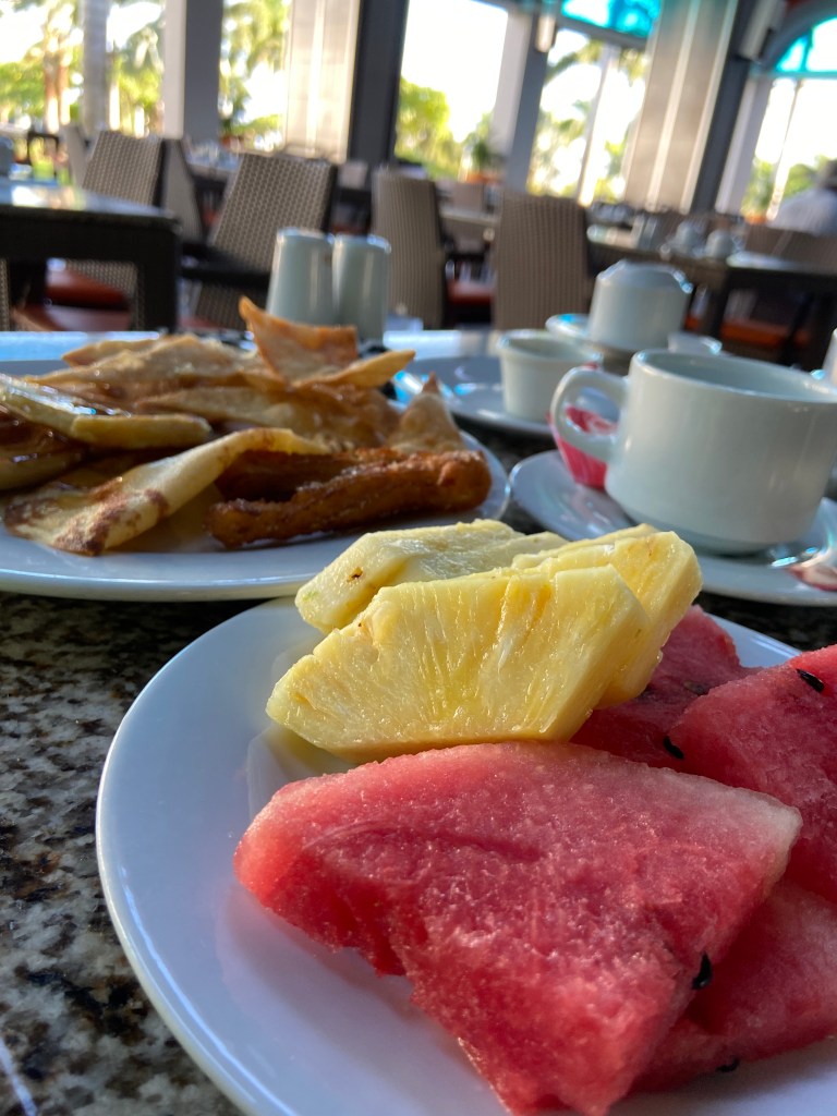 An example of breakfast from the buffet — crepes, churros, cinnamon crispy tortilla chips, and fruit