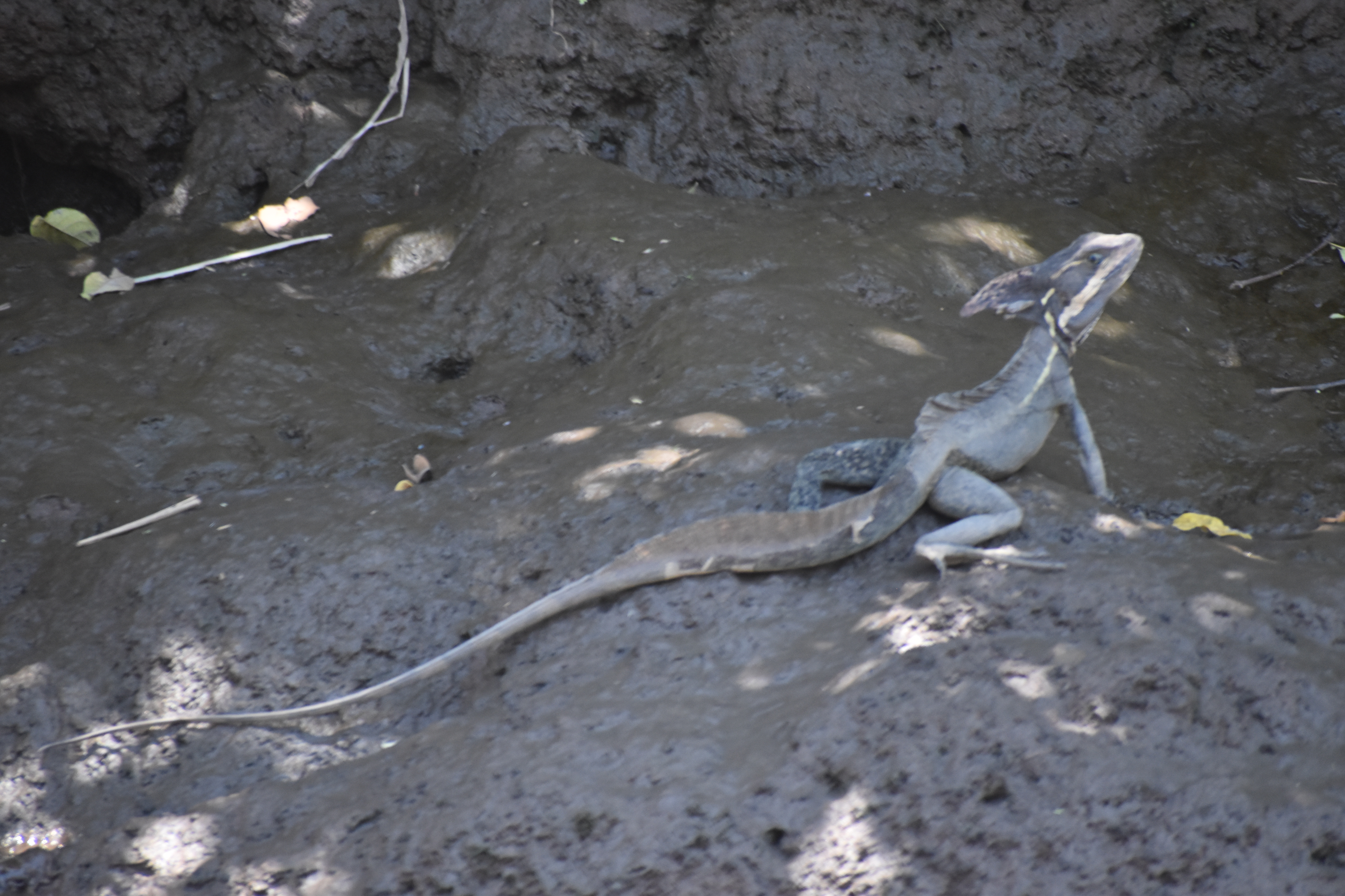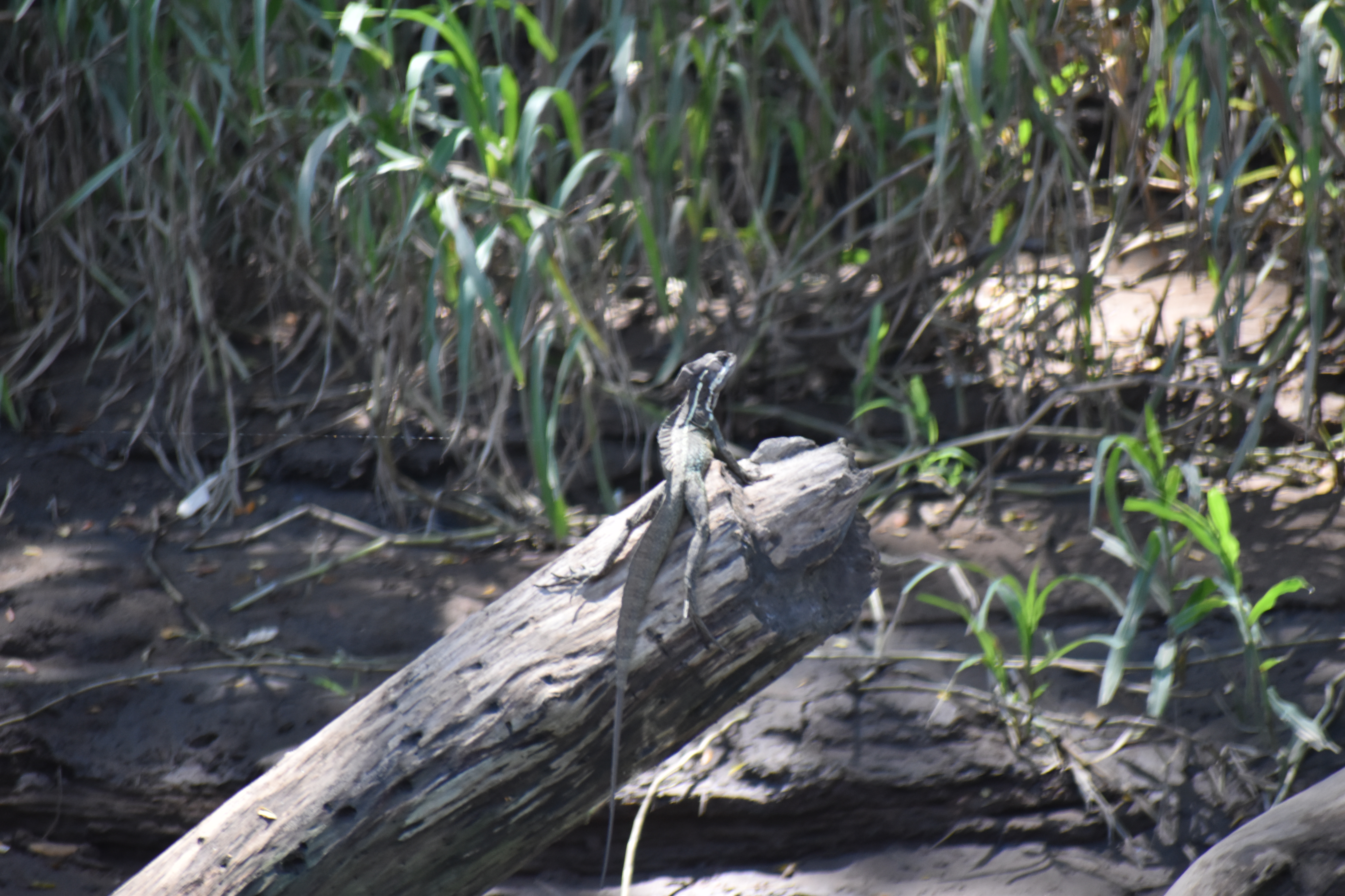 This is a Basilisk Lizard on the top of the log just about center of the photo