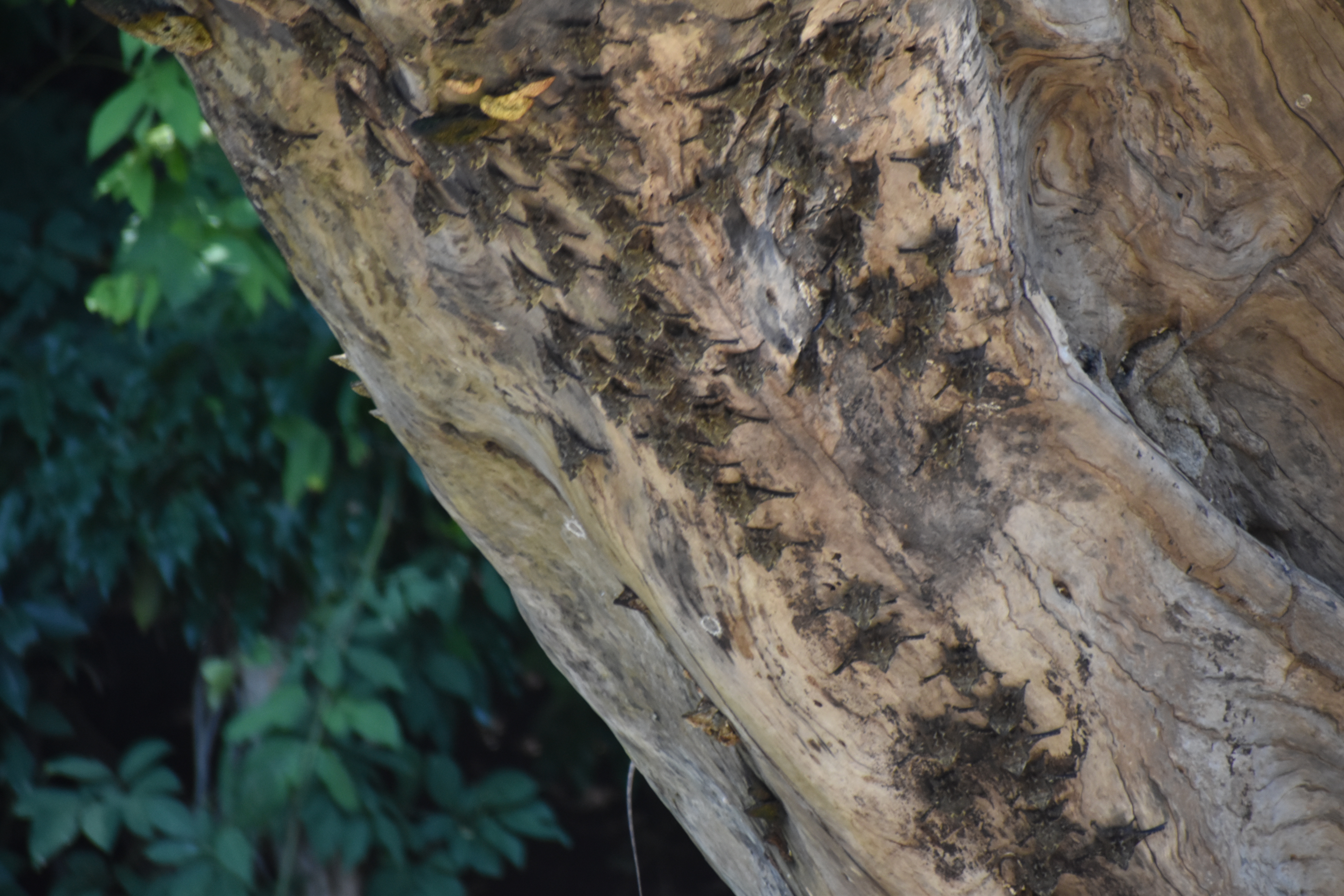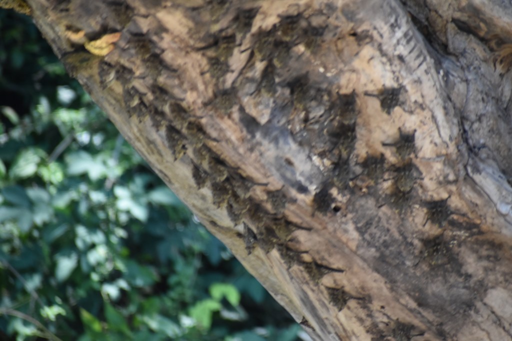 All those little dots on this dead tree trunk are actually tiny BATS hanging on the bark!!!